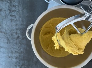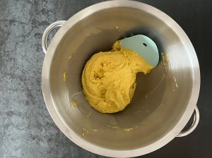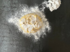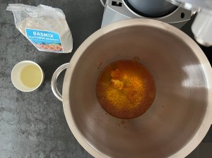 Jag sätter igång med väga upp vatten och vispa ut saffran i vattnet, sen fortsätter jag med jäst och olja. Löser upp jästen i saffransvattnet och tillsätter sedan oljan.