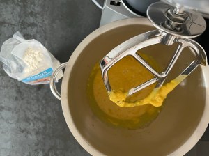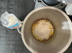 Efter det tillsätter jag hälften av mjölmixen och blandar samman i maskinen, med vingen. Tillsätter sedan resten av mjölet och blandar på halvfart i 3-4min. Stannar maskinen och skrapar samman degen, låter den vila i ca 10min i degbunken.