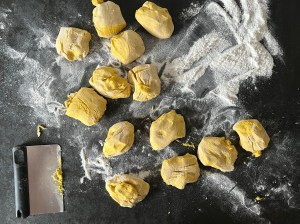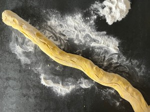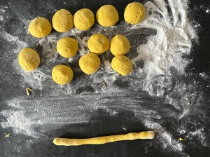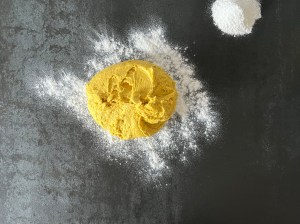 När degen vilat tar jag upp den på mjölad bänk, jag använder rismjöl när jag bakar ut mina. Pudrar degen med rismjöl och bollar den så att den inte kladdar. Kladdigt med glutenfritt så pressa inte händerna genom degen. Rullar den till en lång korv och delar i 13st bitar. Bitarna kontrollväger jag så att alla väger ca 60g.