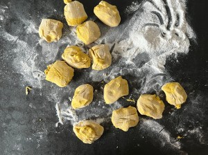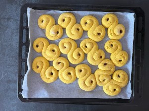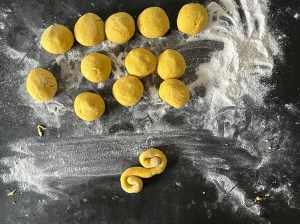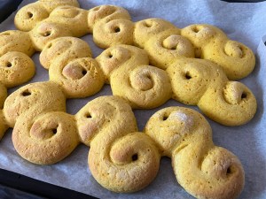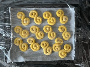 Med lätt mjölade händer rullar jag dem mjukt till släta bollar. Sen rullar jag ut varje boll till en jämntjock korv, ca 25cm lång. Korven formar jag till en klassik lussekatt genom att rulla in ändarna åt motsatt håll, lägger den sedan på en bakplåtspappersklädd plåt. Återupprepar med alla bollarna och plastar sedan plåten lätt så att lussekatterna kan jäsa.