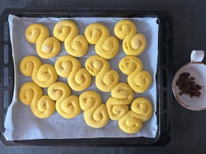 Medan de jäser blötlägger jag russin, ca 30st i kallt vatten. När de fått jäsa klart efter ca 60min så tar jag bort plasten, häller bort vattnet från russinen, sätter ner ett russin i varje snurra och bakar av dem i förvärmd ugn. Efter ugnen får de svalna på ett galler innan servering.