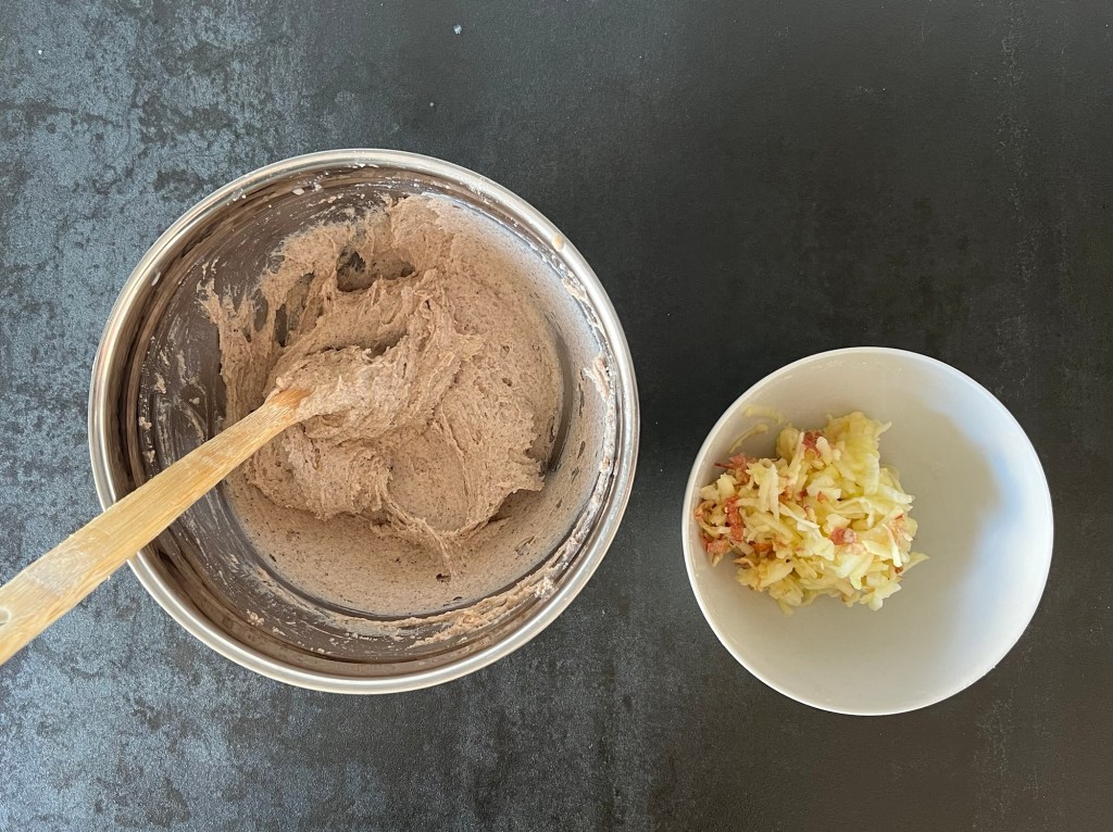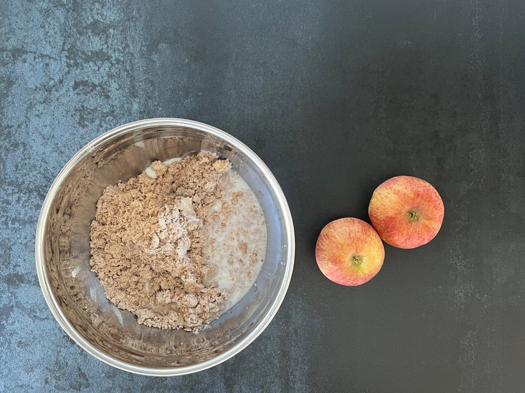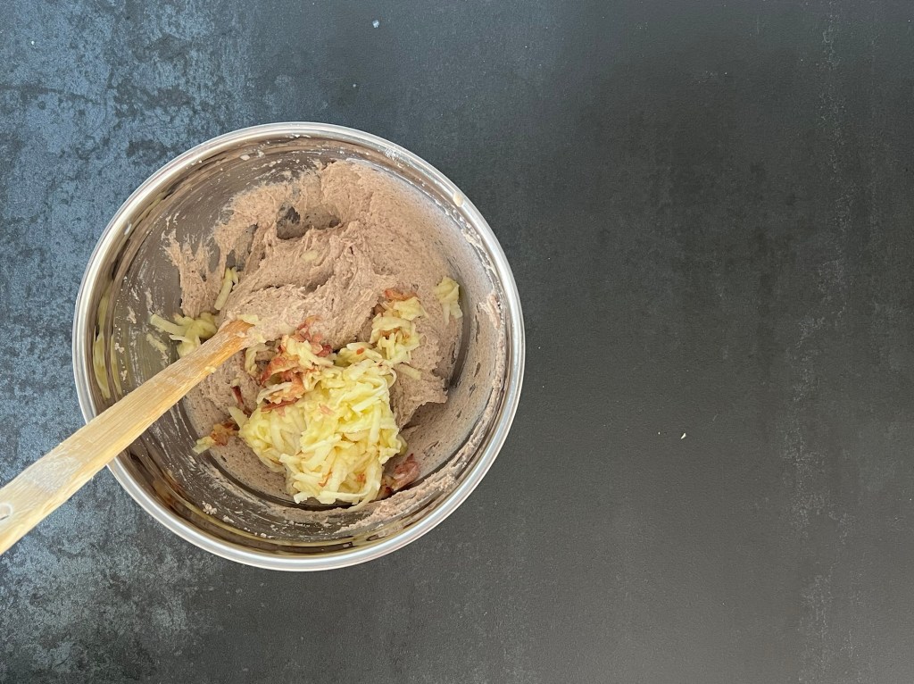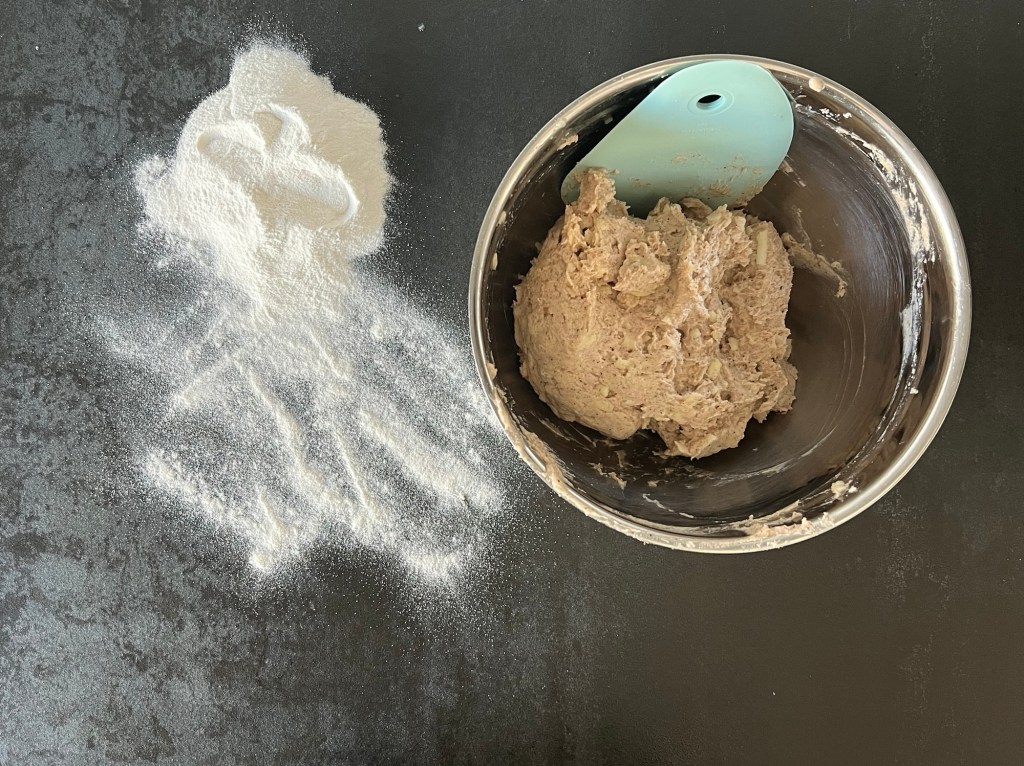 Sen river jag äpplena och tillsätter i degen. Blandar väl så att de fördelas i hela degen. Låter degen vila 4-5min innan nästa steg