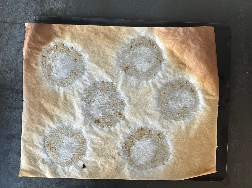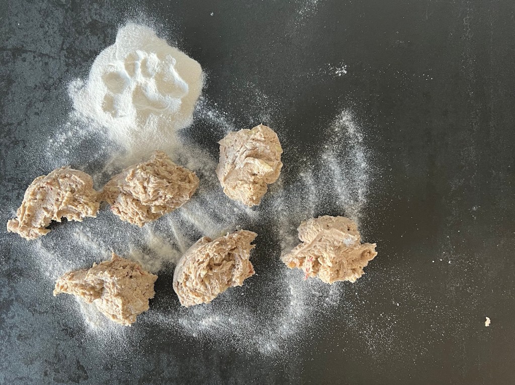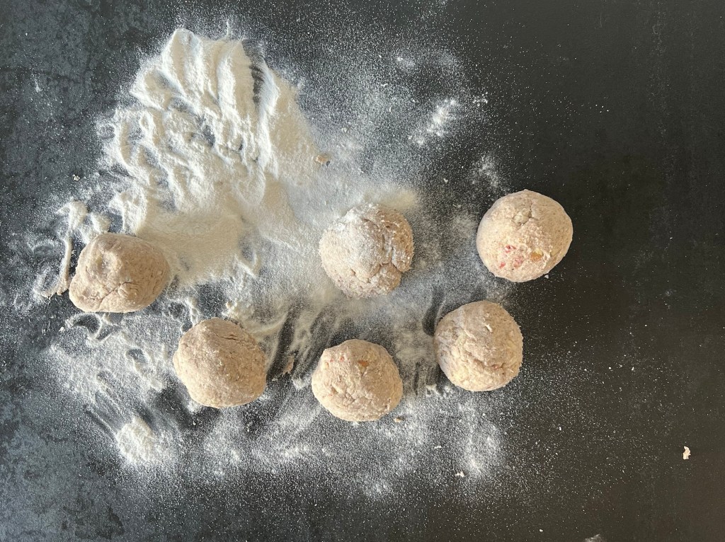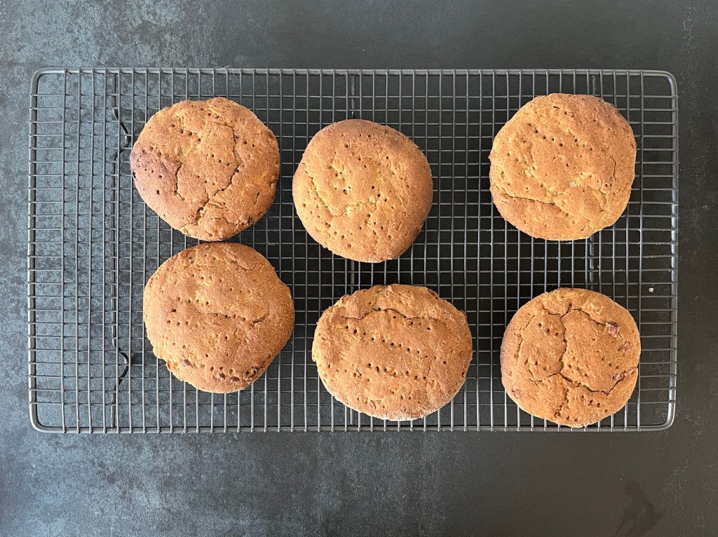 Efter det mjölar jag bänken och väger upp 6st bitar, lika stora. Rullar dem till jämna bollar och lägger på bakplåtspappersklädd plåt. Plattar till dem till jämnstora kakor, ca 3cm höga och naggar med en gaffel innan jag bakar av dem i ca 15min. Efter ugnen får de vila på ett galler och svalna något innan servering