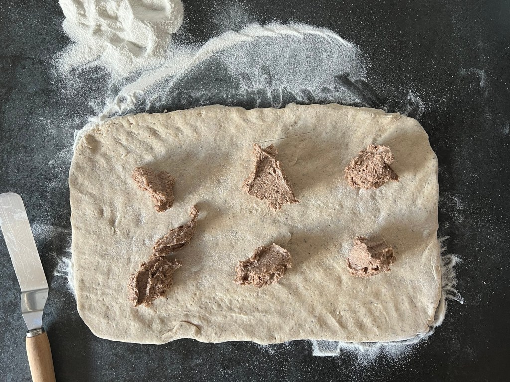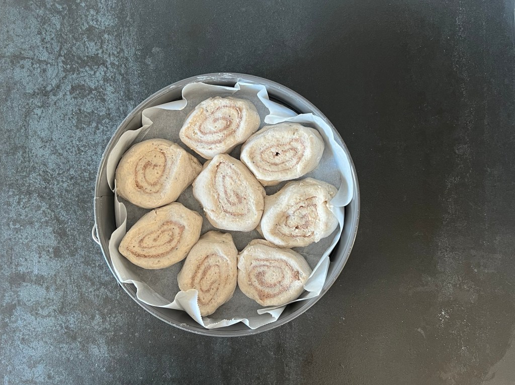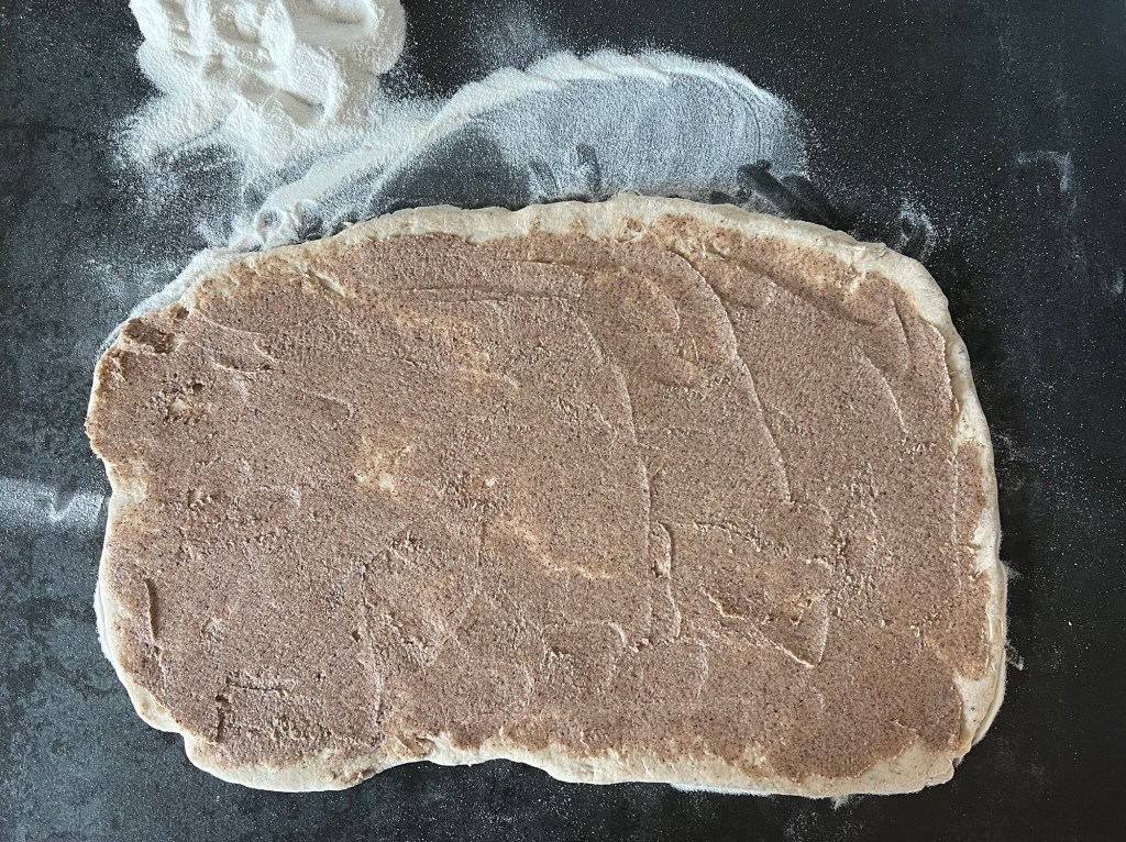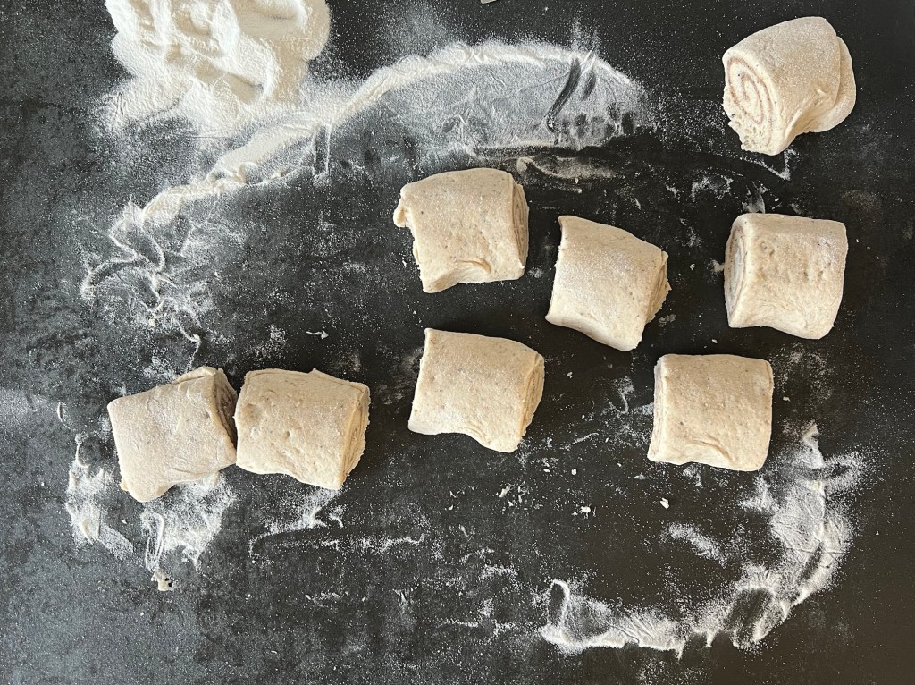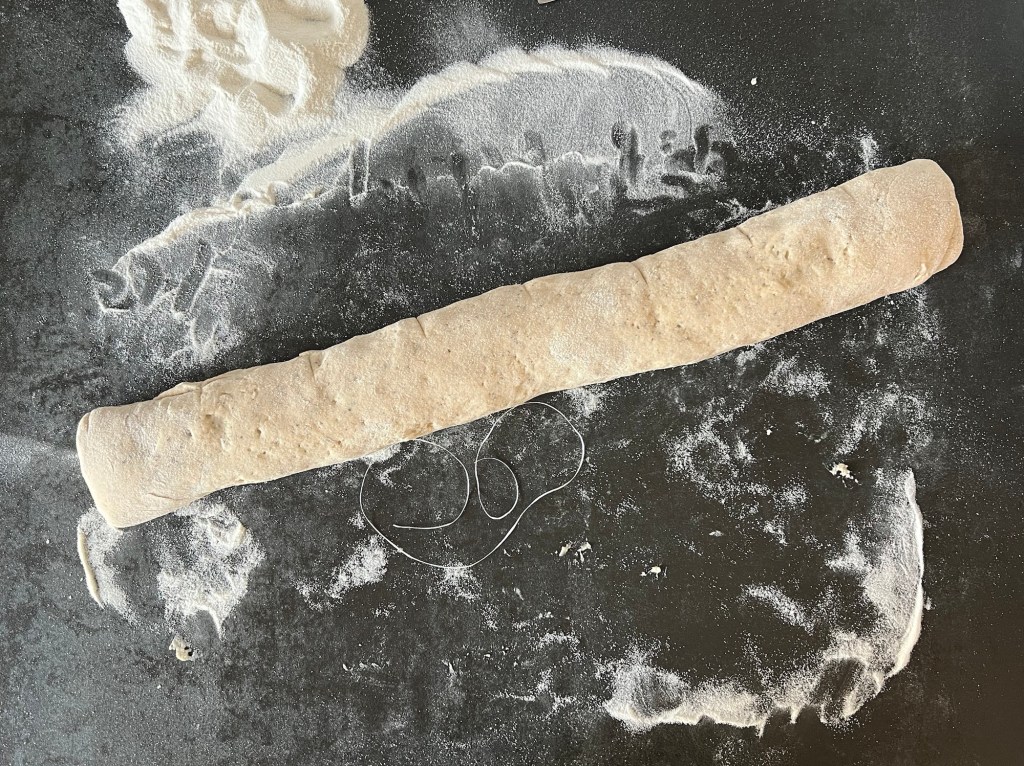 Jag lägger ett jämnt lager över hela degplattan. Sen rullar jag den, rullar metodiskt, mjukt och lugnt, om jag upplever att den sitter fast i bänken så tar jag en mjölad degskrapa och hjälper degen loss från bänken och fortsätter sedan att rulla. Likadant om det är mycket mjöl på degen, då pausar jag och tar en borste och borstar mjukt bort det mesta. När hela degen är rullad, så skrapar jag bort mjölet runt degen och puttar samman den till en jämntjock rulle, ca 50cm lång. Måttar upp 8st bitar om 6cm som jag sedan delar med tandtråd alternativt sytråd, jag skär aldrig genom degen med kniv då snittet inte blir bra.