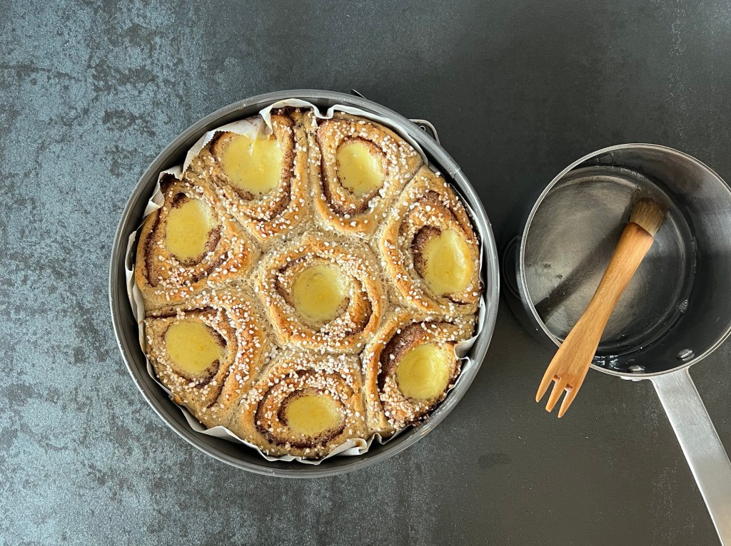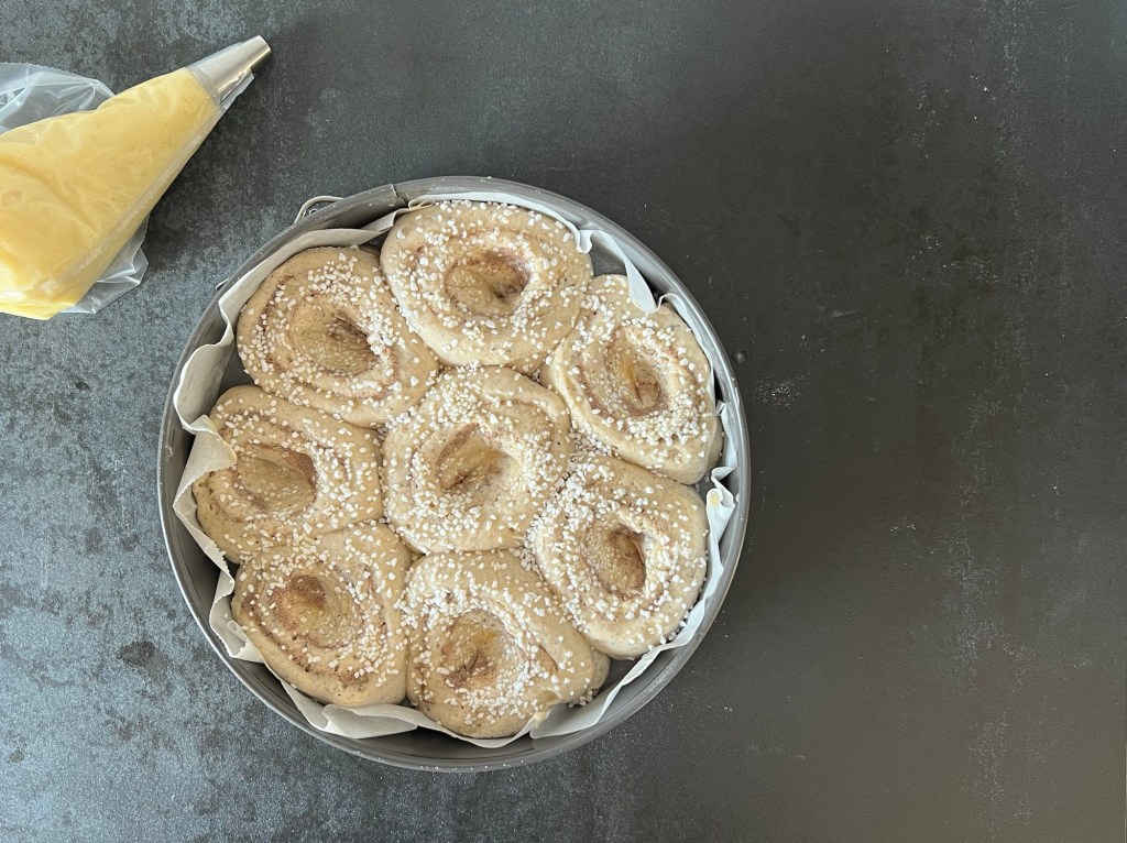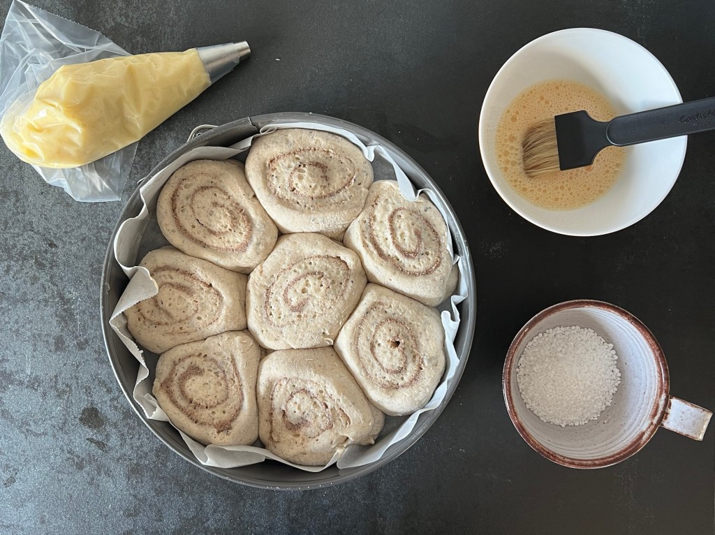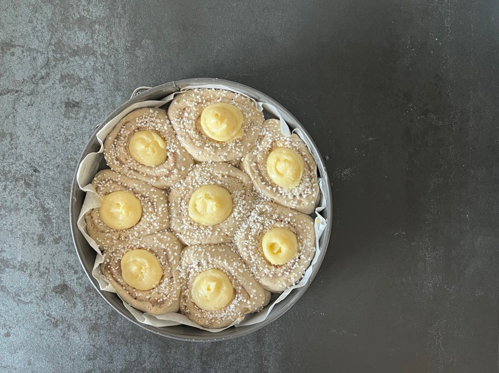 Jag lägger bullarna med ena snittytan nedåt i bakplåtspappersklädd springform. En i mitten och de andra jämnt fördelat runt om, Sen plattar jag till dem lite. . Plastar formen och jäser ca 35-40min. Är det svalt hemma så öka tiden något. När de jäst färdigt blandar jag ägg, vatten och salt, och penslar bullarna med det. Strör över rikligt med pärlsocker och gör sedan en fördjupning i mitten av varje bulle, med en matsked. Fyller fördjupningen med vaniljkräm och bakar sedan av kakan