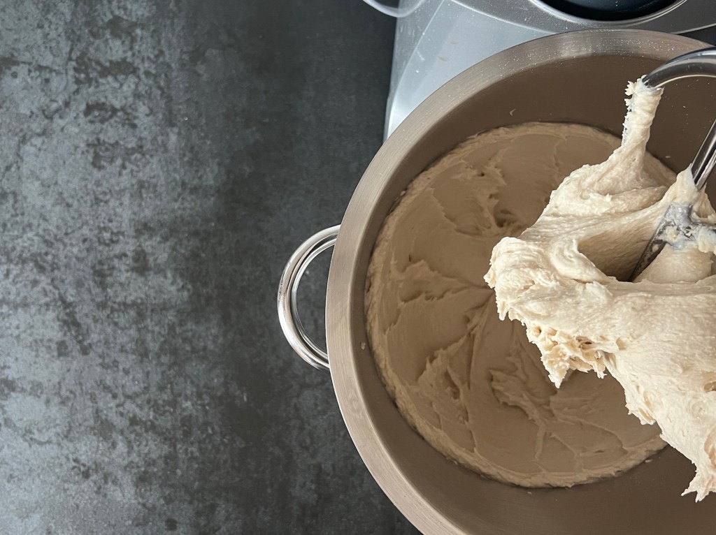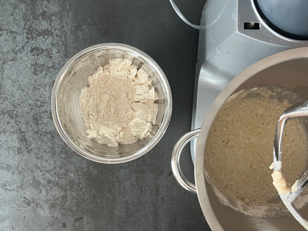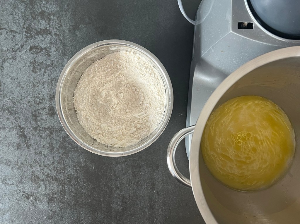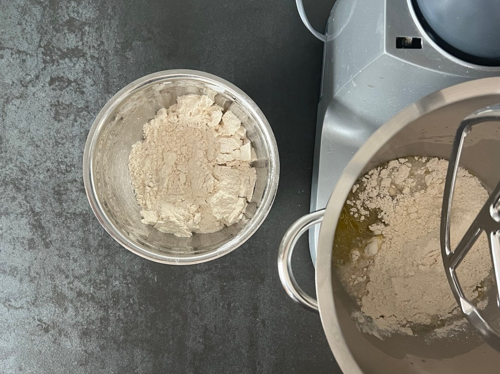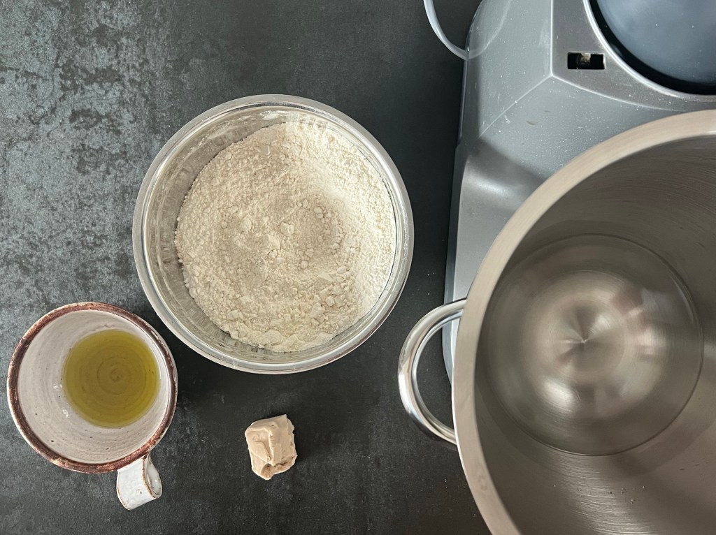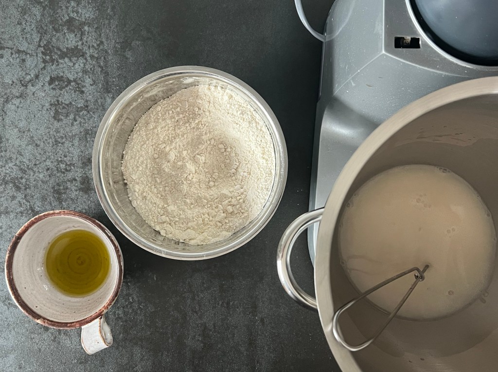 Jag börjar med att väga upp kallt vatten, jäst, olivolja och att öppna mjölpåsen. Löser upp jästen i vattnet och tillsätter olivolja. Sen blandar jag ned hälften av mixen i vatten. Efter det tillsätter jag resten av mjölmixen och kör maskinen, med vingen, på medelhastighet i 4-5min. Skrapar samman degen och låter den vila ca 10min.
