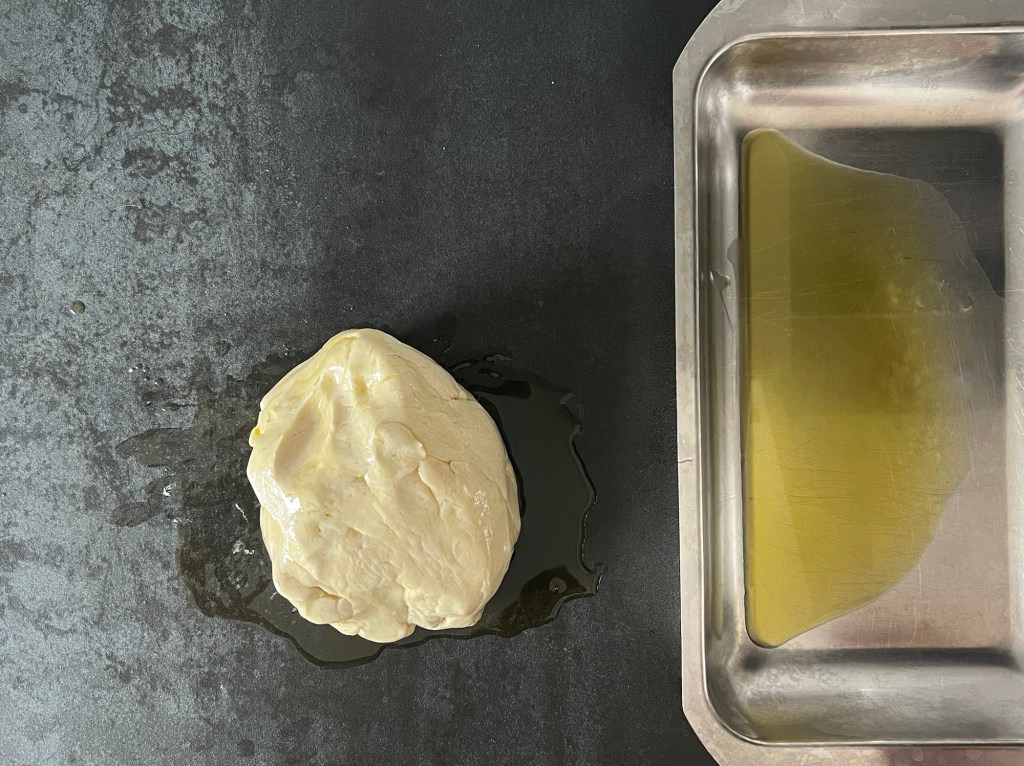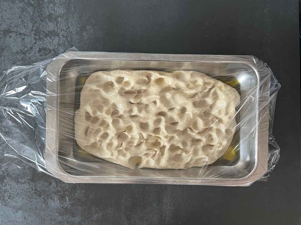 Efter att degen vilat så häller jag lite olivolja på bänken och ca 20g i en ugnsform, sen tar jag upp degen på den oljade bänken. Vänder den i oljan och lyfter över den i formen. Med oljiga fingertoppar gör jag fördjupningar i degen, samtidig som jag plattar ut den så att den fyller formen. Sen plastar jag formen och låter den jäsa.