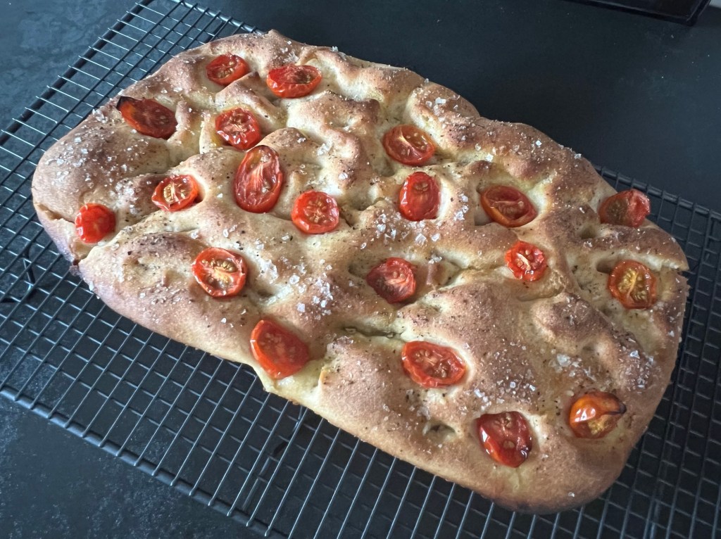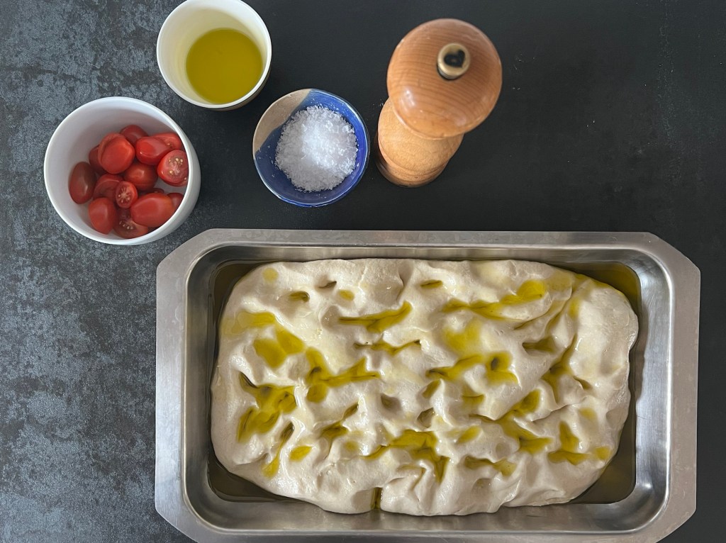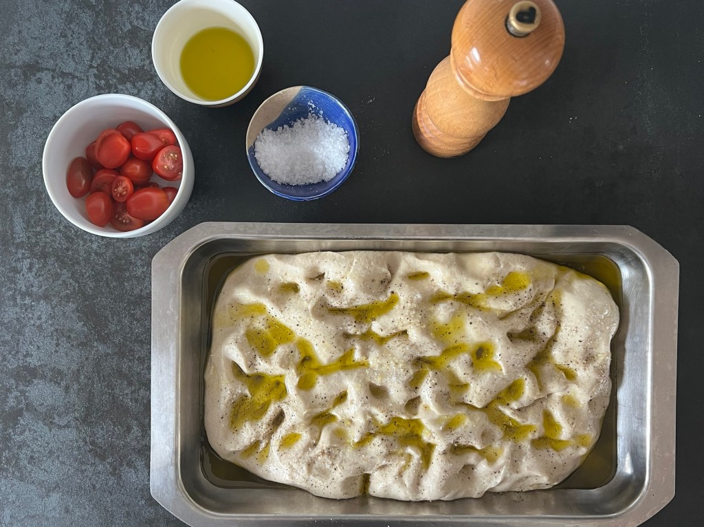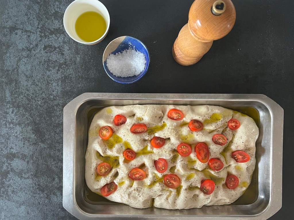 När degen jäst färdigt så häller jag olivolja över den så att den rinner ner i fördjupningarna, sen maler jag svartpeppar över och krossar flingsalt, avslutar med några delade körsbärstomater och bakar av den. Man kan krydda med oliver, färska örter, lök och många andra goda smaker. När den kommer ut ugnen så får den stå i formen ca 10min, så att oljan sugs upp i brödet, efter det lyfter jag ut den på ett galler och låter den svalna innan jag serverar den.