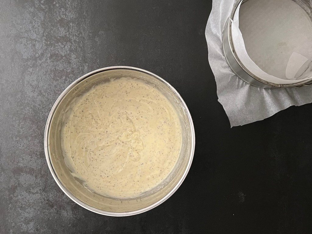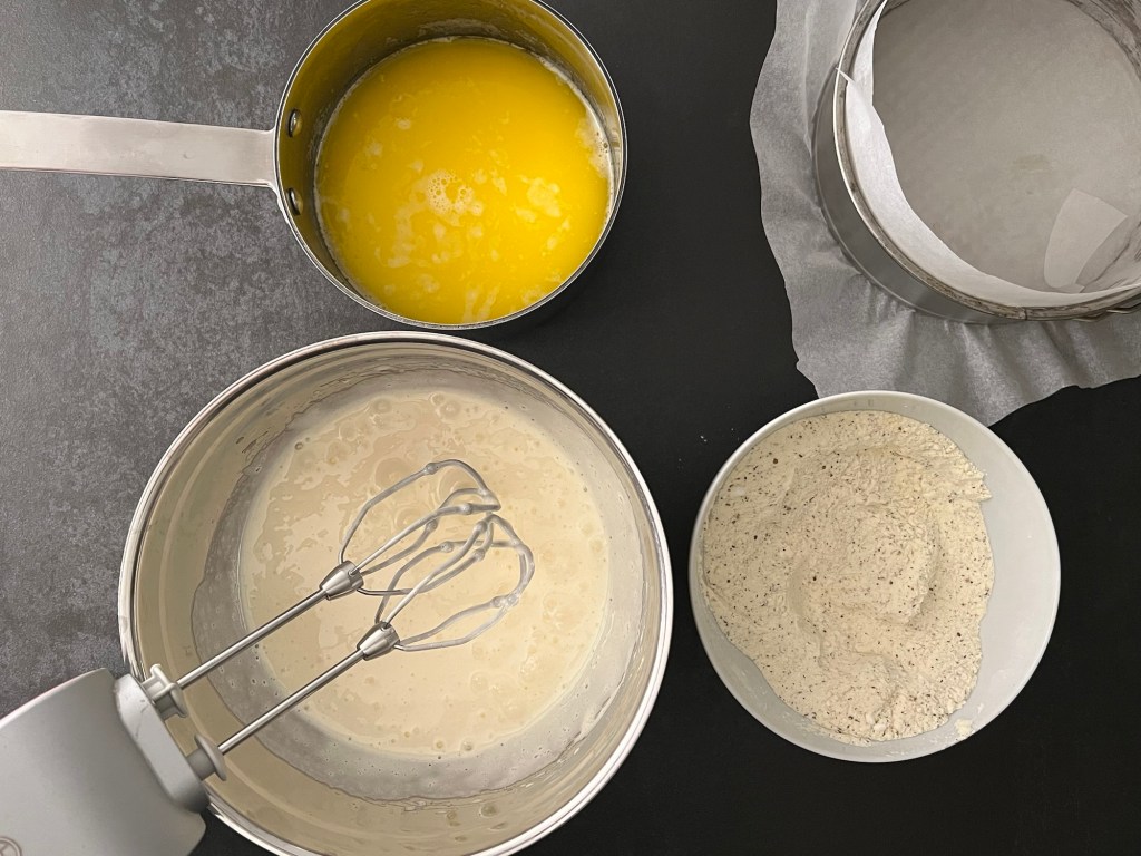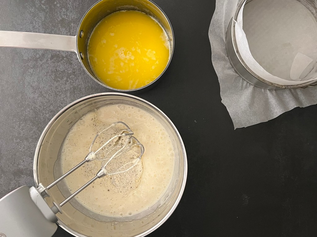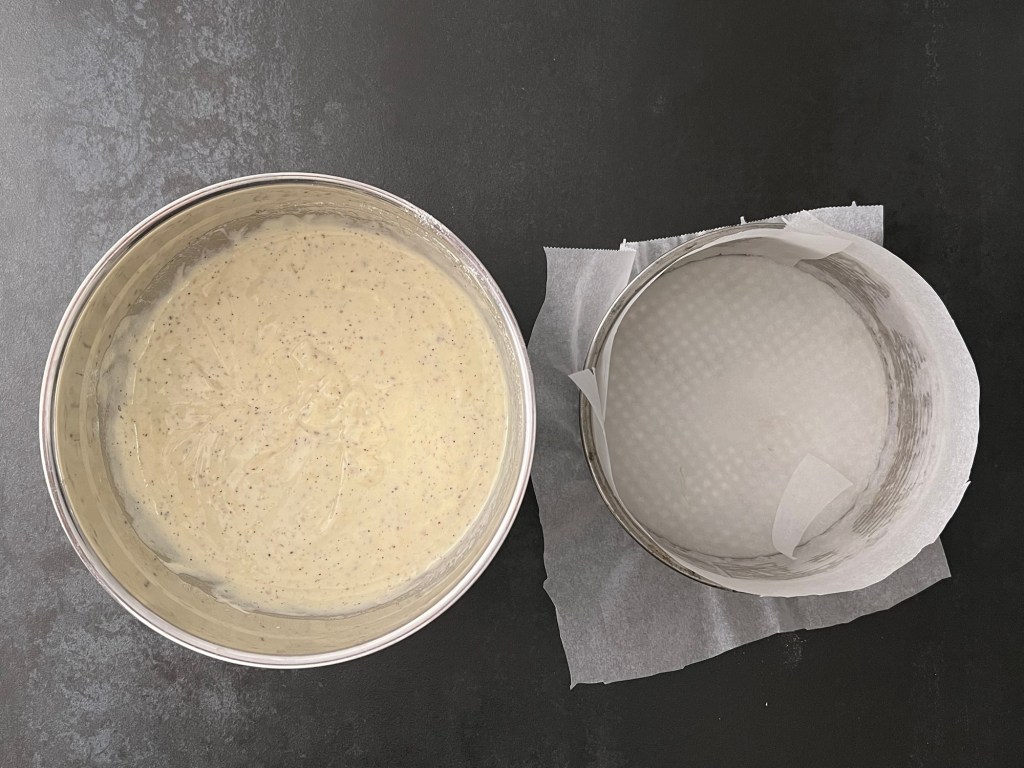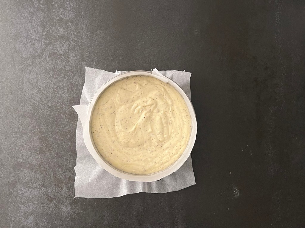 Först börjar jag med chaibotten. Väger upp allt och blandar alla torra förutom sockret till en mix. Smälter smör och tillsätter mjölken i smöret. Sen vispar jag ägg och socker vitt och pösigt, tillsätter mjölmixen och vispar ned på låg hastighet. Efter det vispar jag ned smörmjölken på låg hastighet. Häller upp i en klädd springform och bakar av