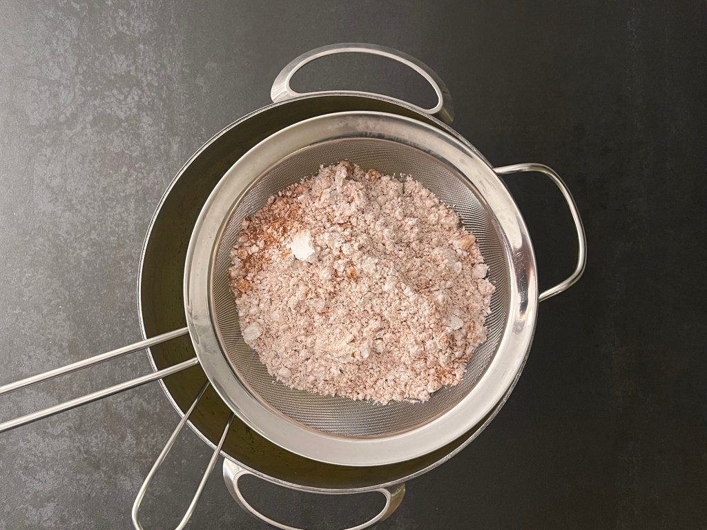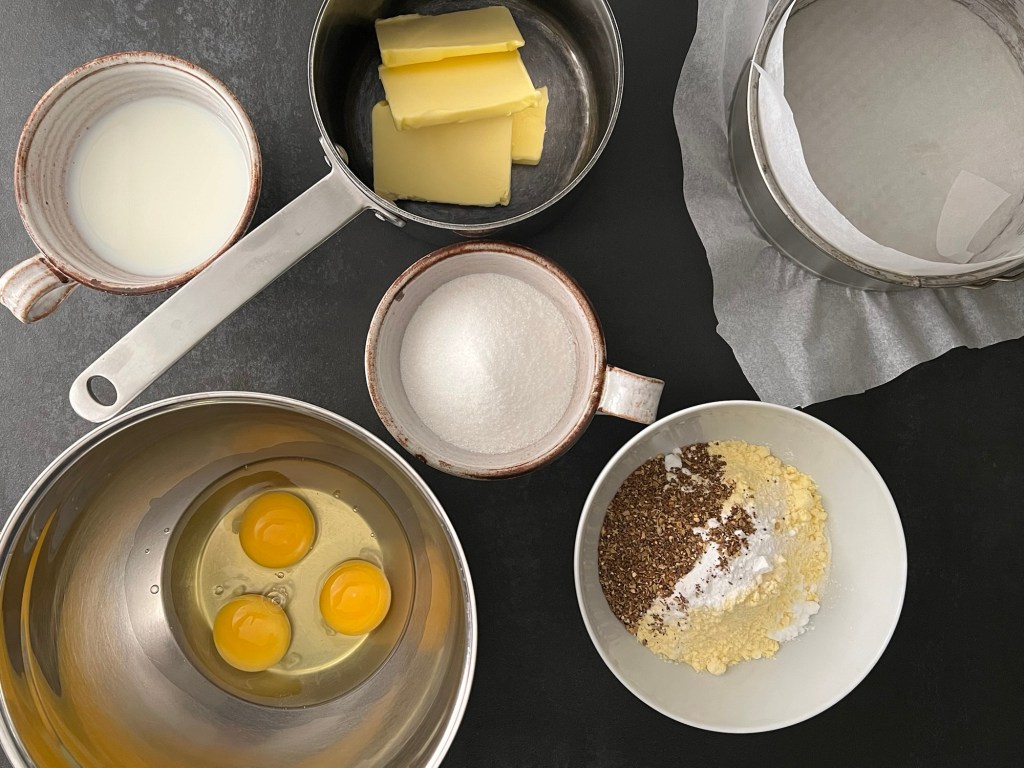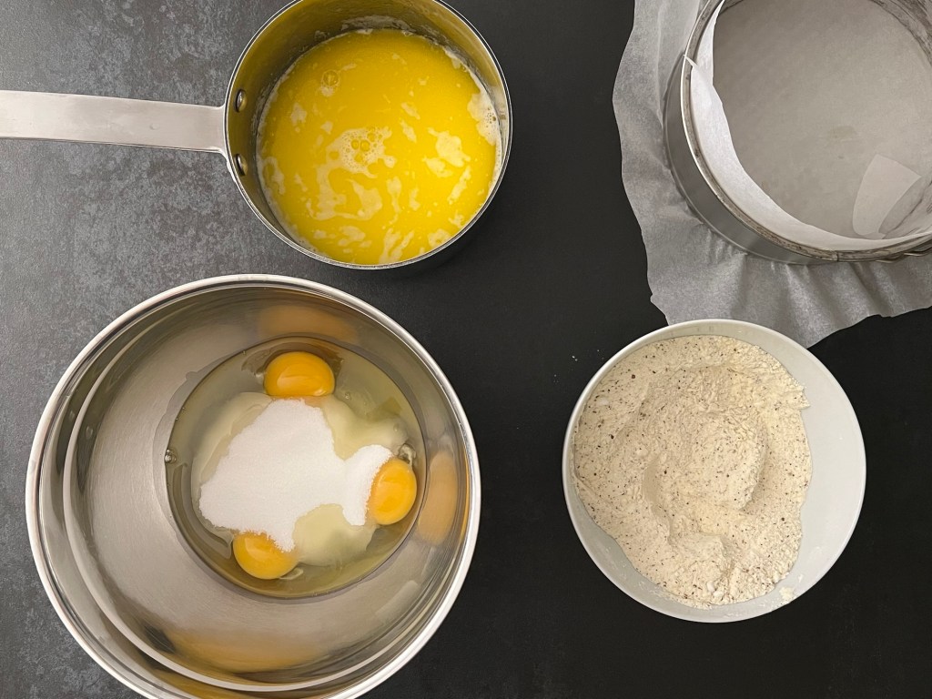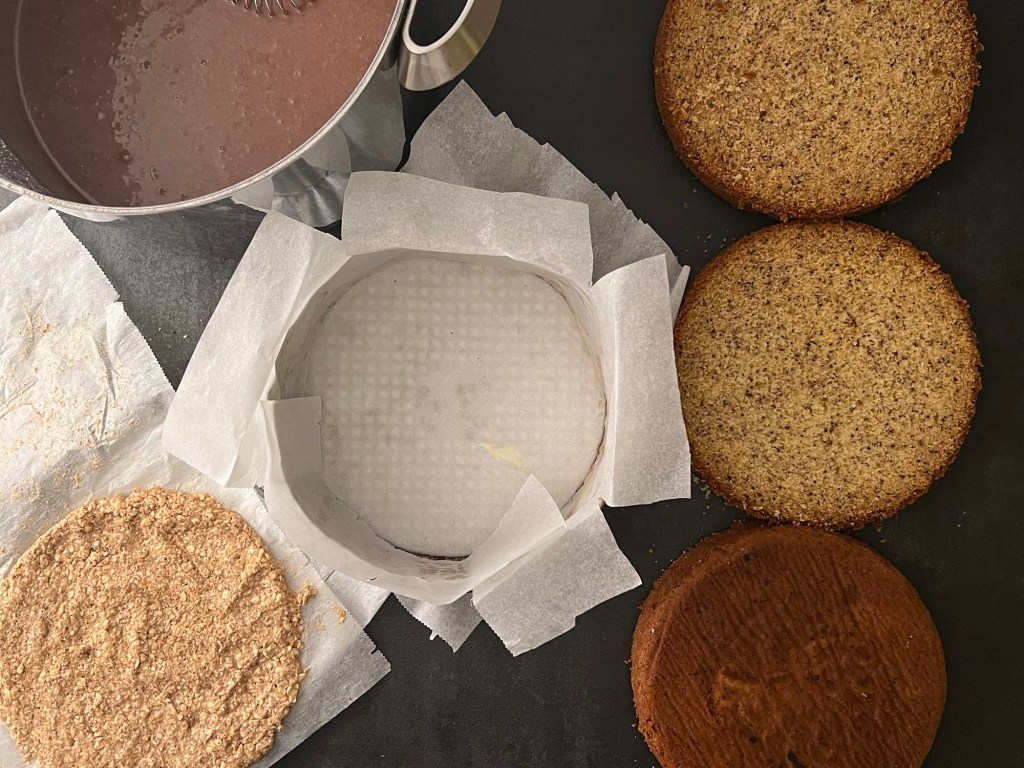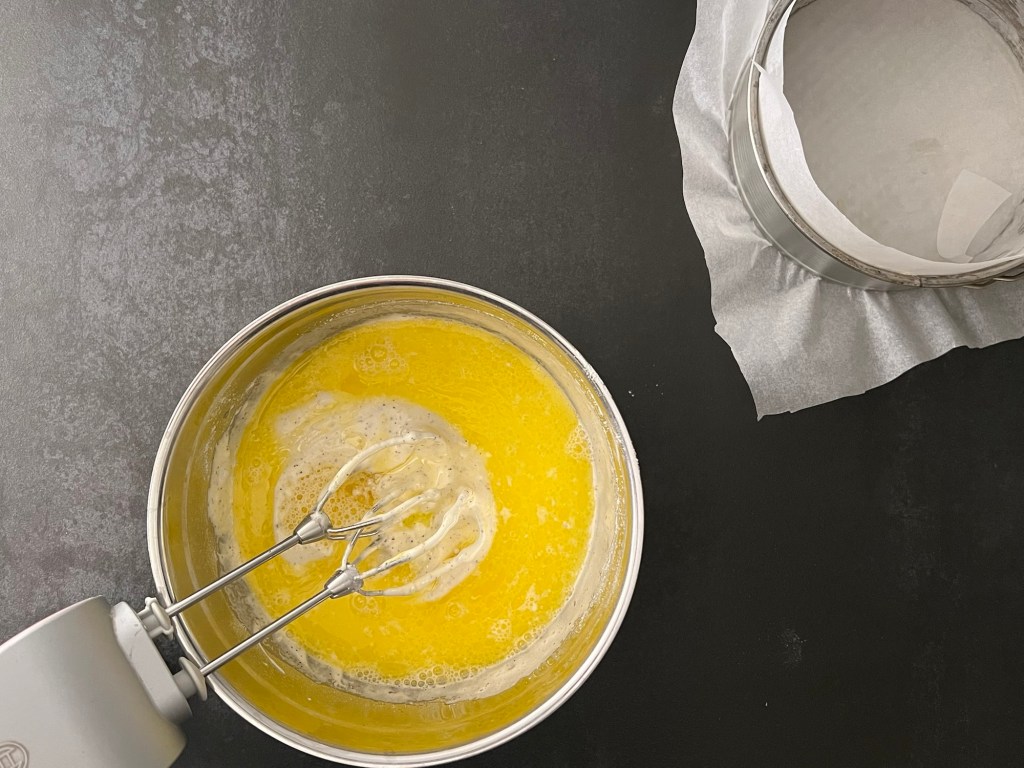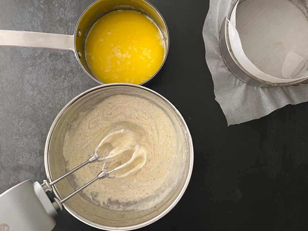 Först börjar jag med chaibotten. Väger upp allt och blandar alla torra förutom sockret till en mix. Smälter smör och tillsätter mjölken i smöret. Sen vispar jag ägg och socker vitt och pösigt, tillsätter mjölmixen och vispar ned på låg hastighet. Efter det vispar jag ned smörmjölken på låg hastighet. Häller upp i en klädd springform och bakar av
