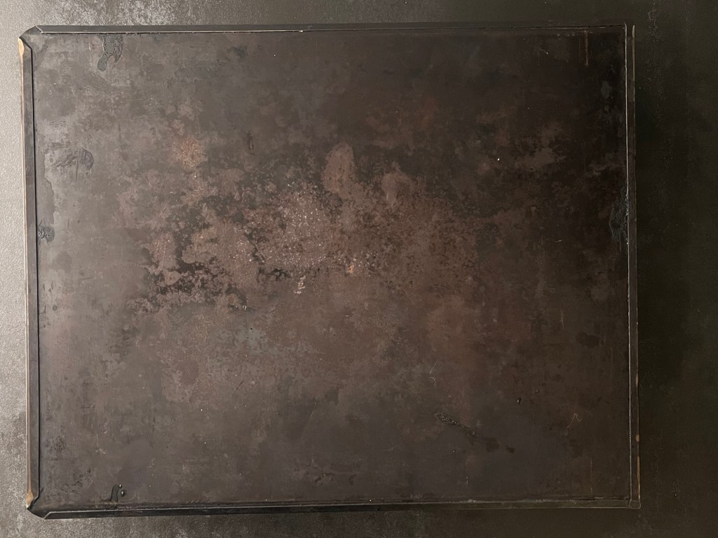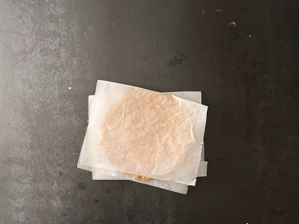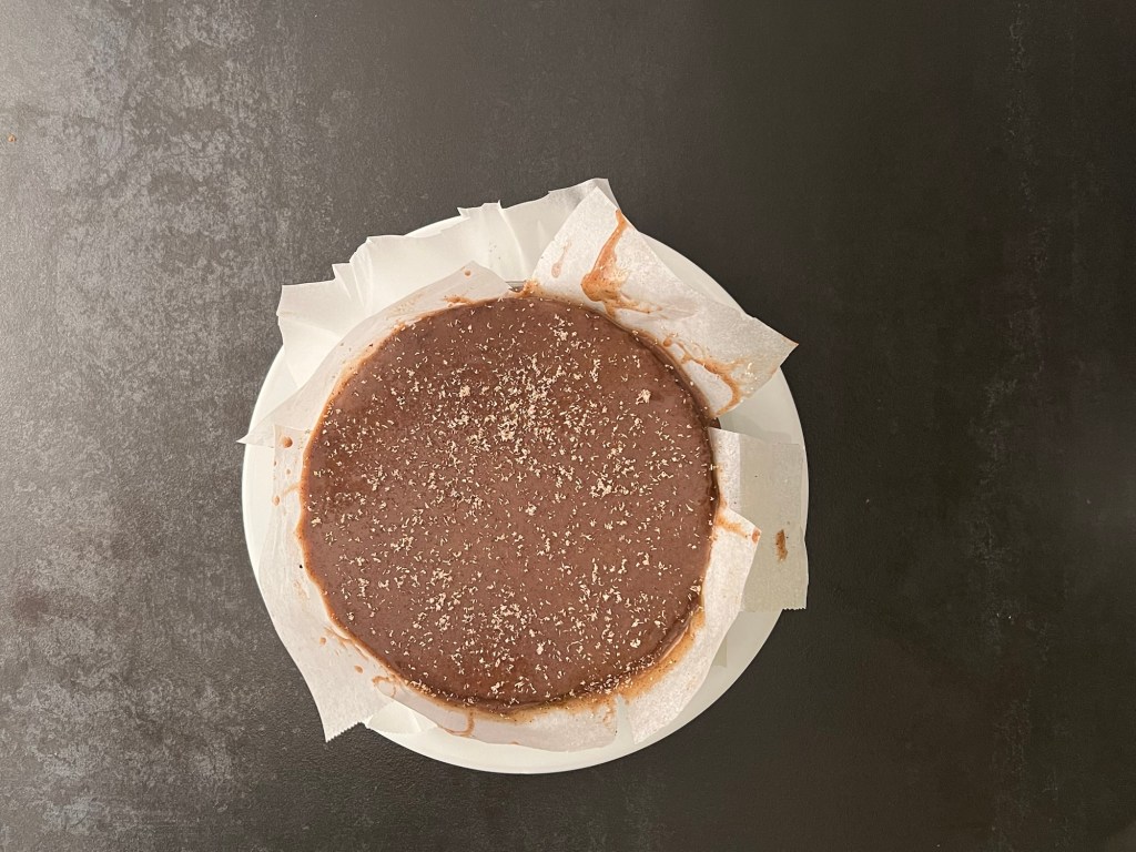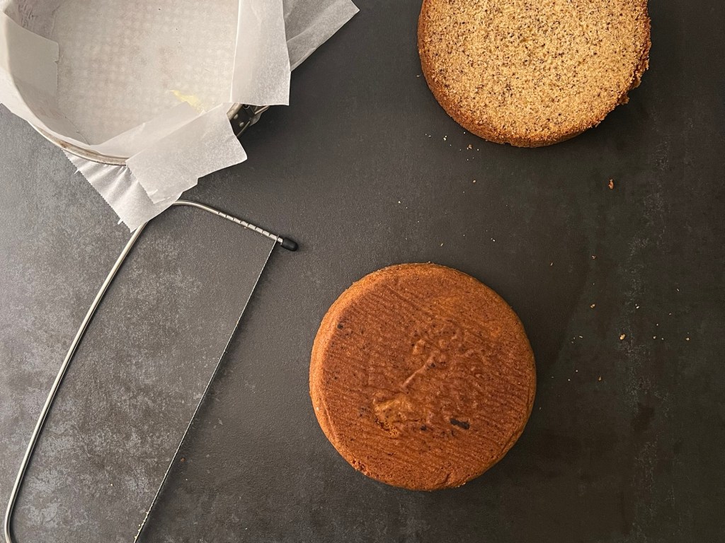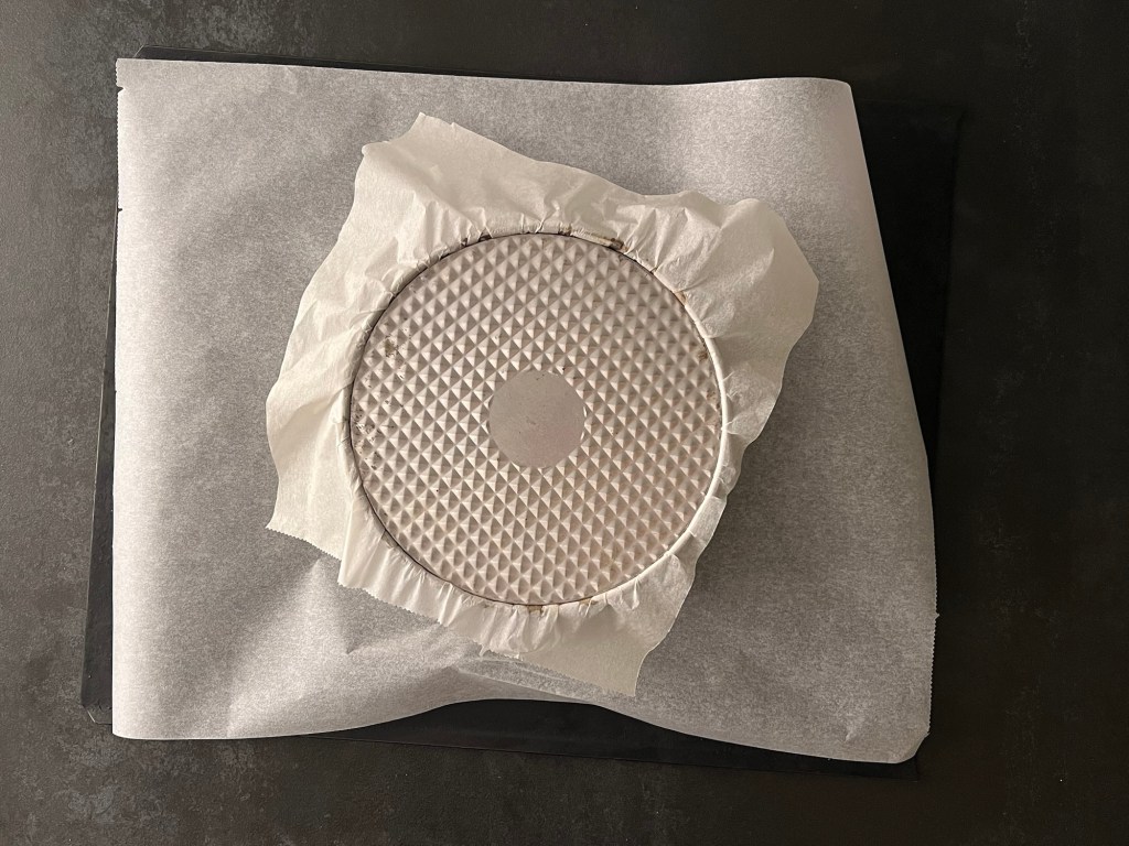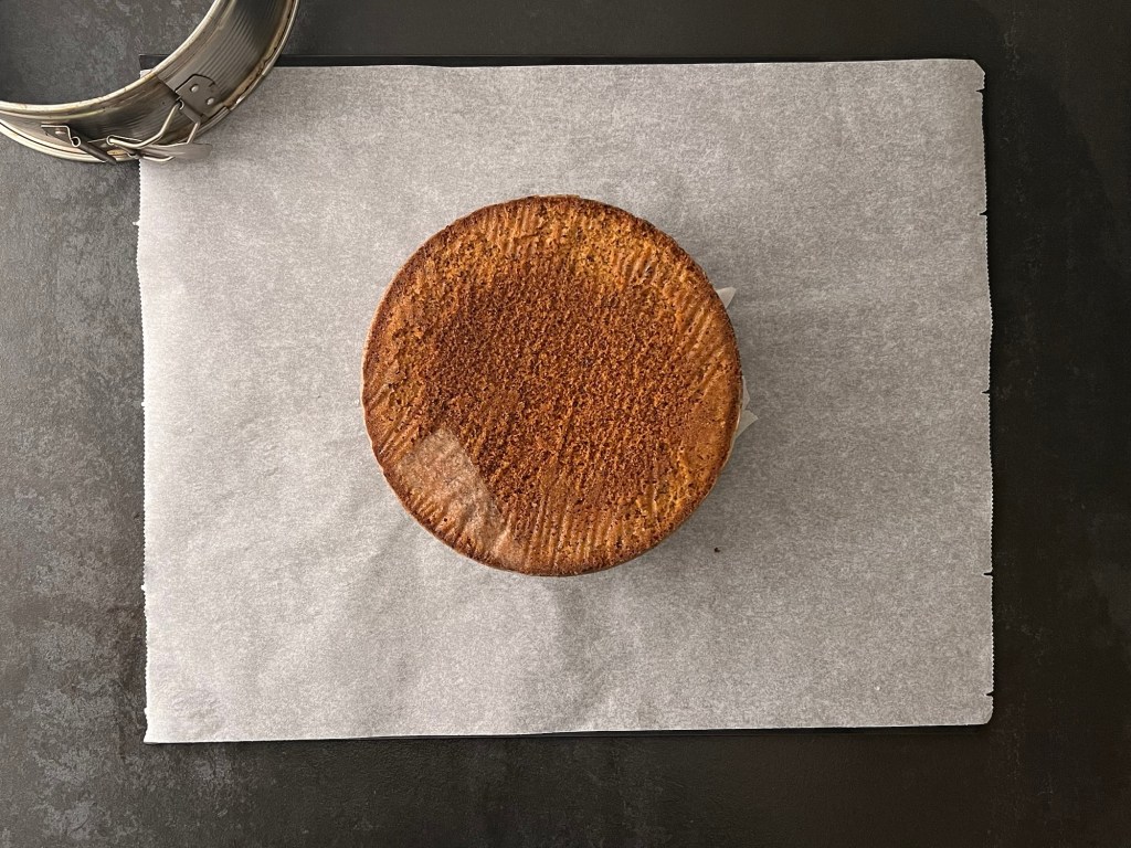 När kakan är färdig lägger jag en bakplåtspappersklädd plåt ovanpå och vänder allt upp och ner. Ställer åt sidan för att kallna