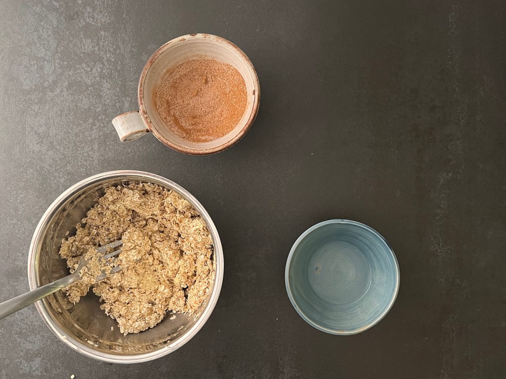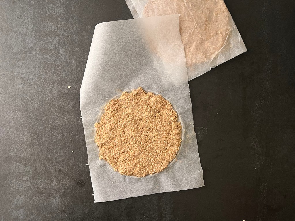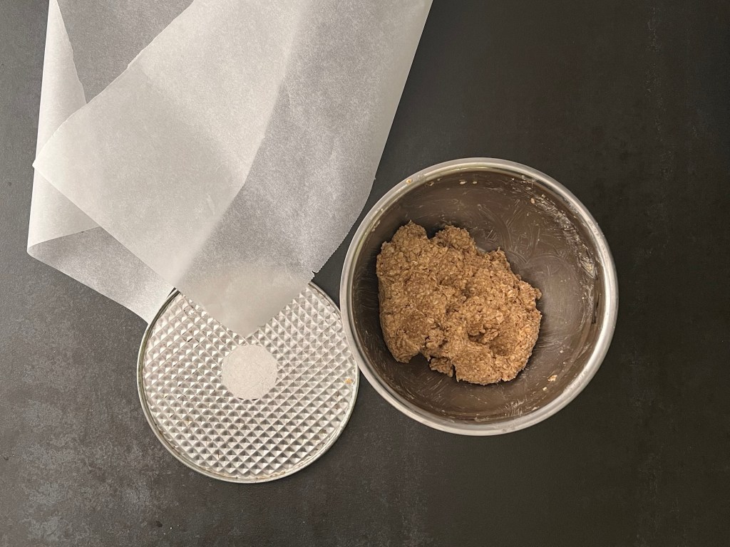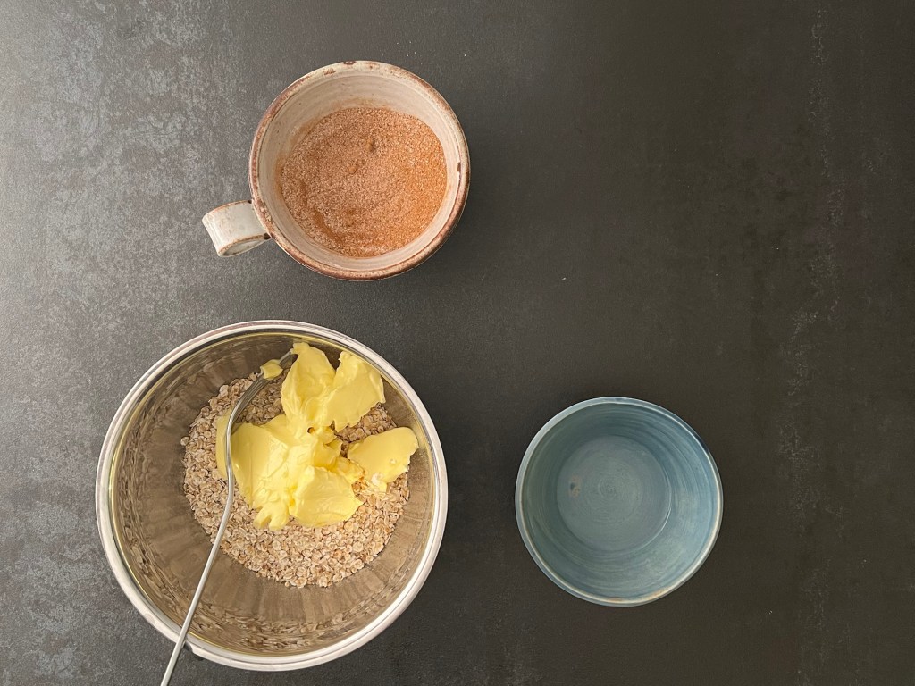 Medan kakan kallnar så gör jag muskotnöts – & kanelbollsbottnarna. Jag använder små havfregryn, eller så mixar jag dem. Arbetar ned det mjuka smöret i grynen. Tillsätter socker som jag blandat med muskot och kanel, samt vatten och arbetar samman allt till en krämig massa. Väger upp två lika stora delar av massan och plattar ut till två runda plattor, förvarar mellan bakplåtspapper och lägger i frysen eller kylen, om de stelnar är det mycket enklare att montera tårtan