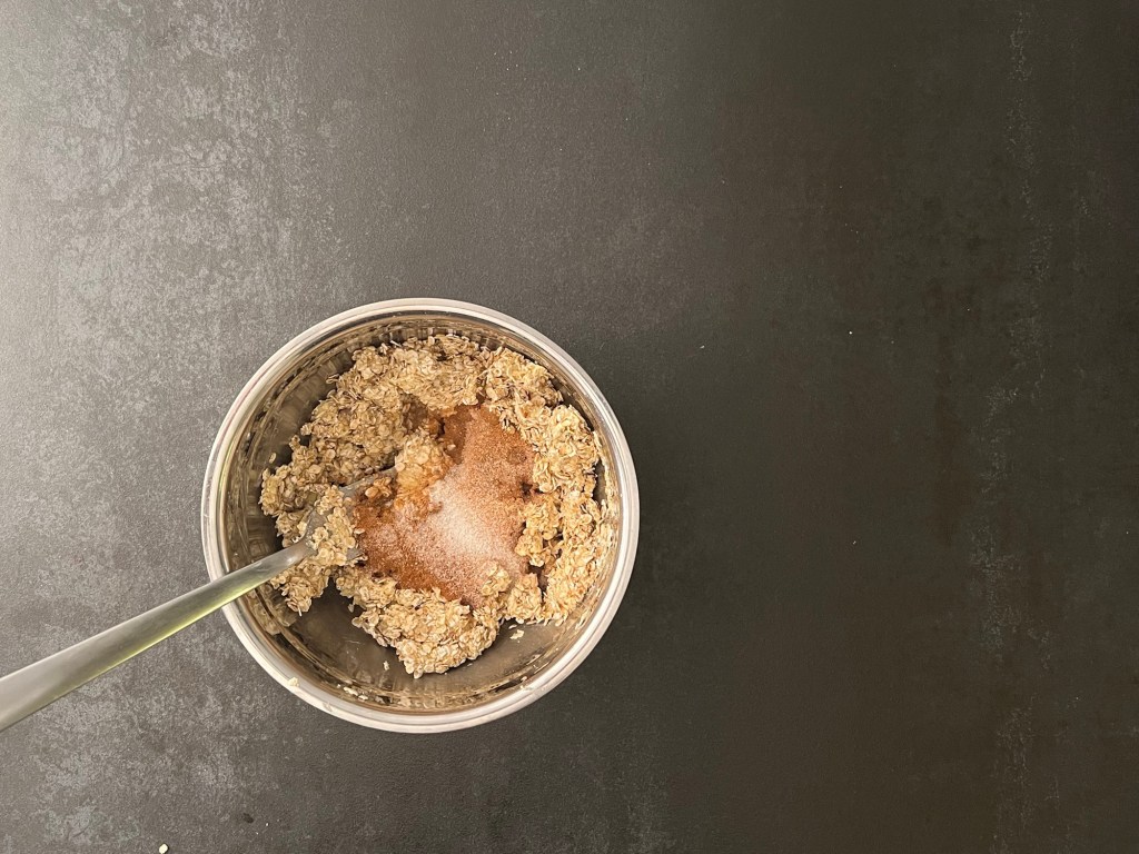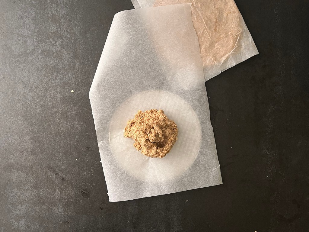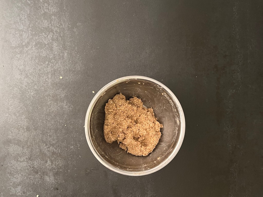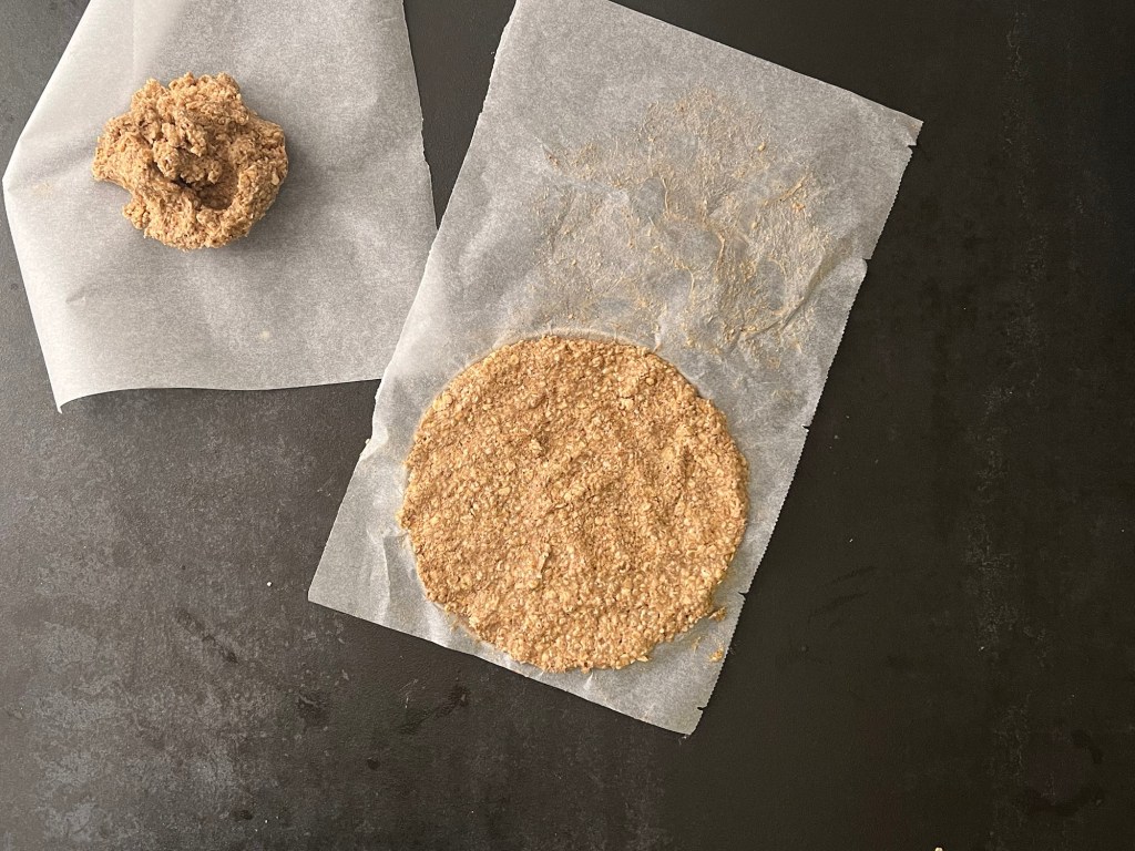 Medan kakan kallnar så gör jag muskotnöts – & kanelbollsbottnarna. Jag använder små havfregryn, eller så mixar jag dem. Arbetar ned det mjuka smöret i grynen. Tillsätter socker som jag blandat med muskot och kanel, samt vatten och arbetar samman allt till en krämig massa. Väger upp två lika stora delar av massan och plattar ut till två runda plattor, förvarar mellan bakplåtspapper och lägger i frysen eller kylen, om de stelnar är det mycket enklare att montera tårtan