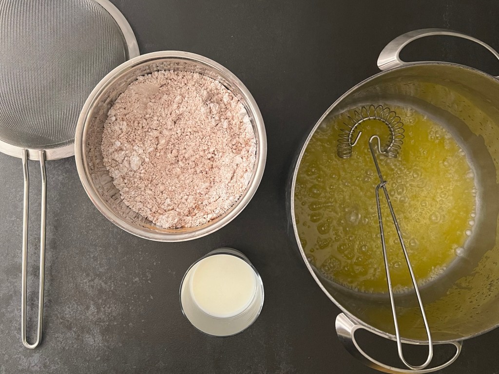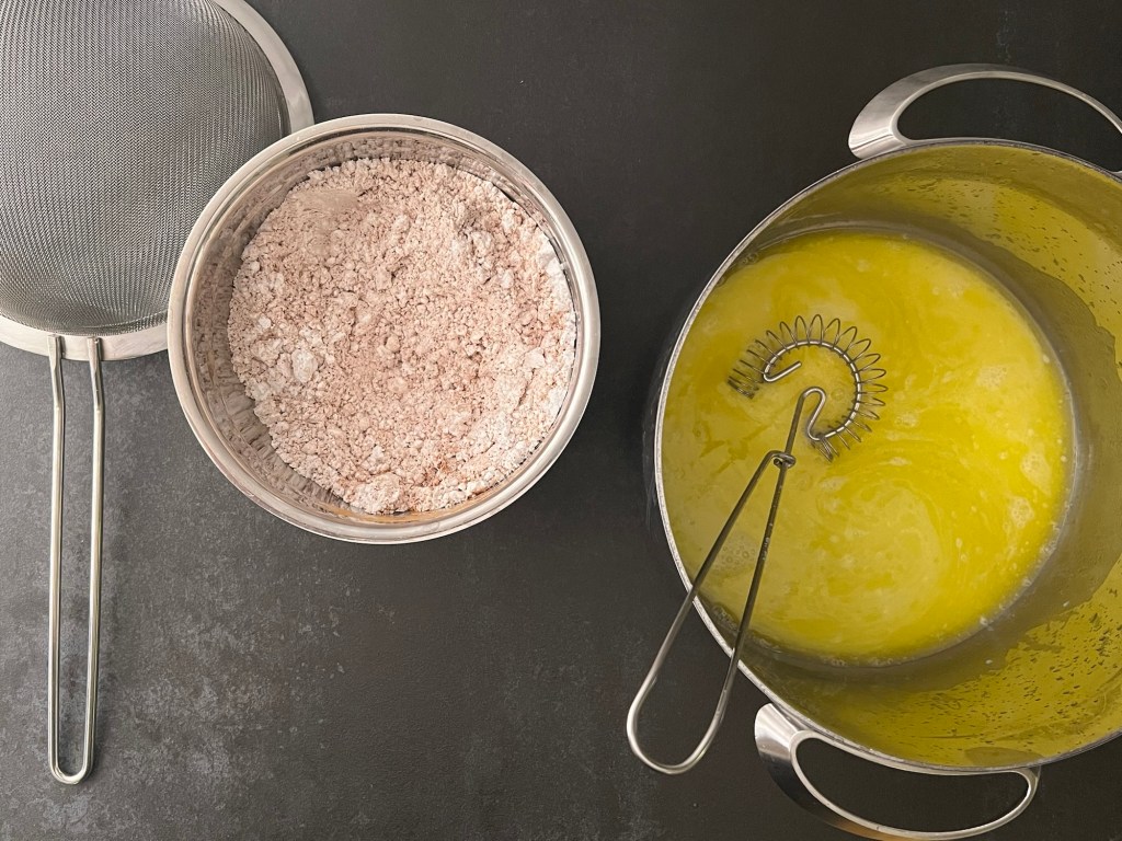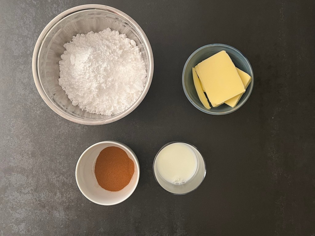 När kakan kallnat och plattorna stelnat så blandar jag glasyren. Smälter smöret, tillsätter mjölken, blandar kanel med florsocker och siktar ned i smörmjölken. Vispar samman och behåller ljummen till monteringen.