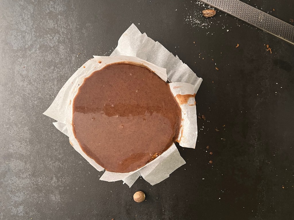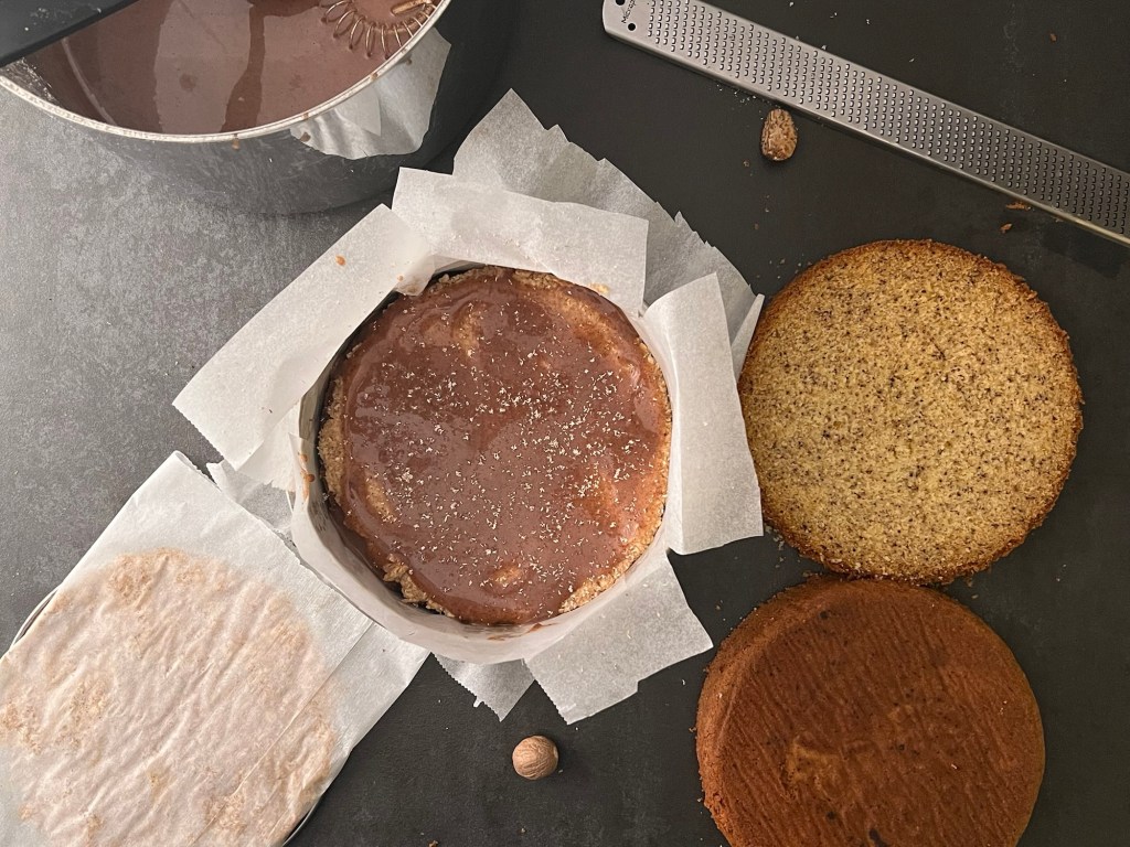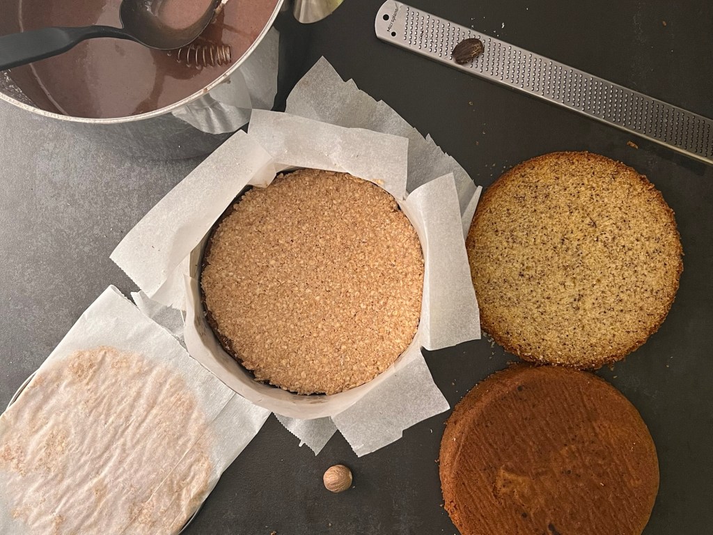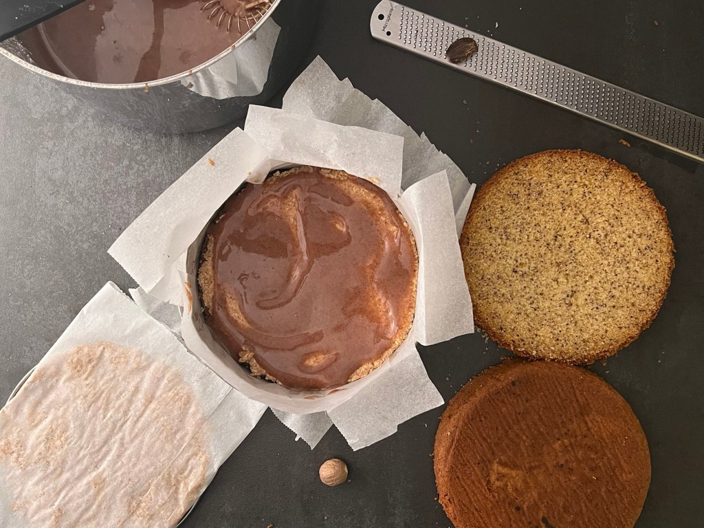 Montering. Först delar jag kakan i 3 lika tjocka delar. Klär om springformen i nytt bakplåtspapper. Lägger en del av kakan i botten, skedar på glasyr ovanpå kakan och finrivet hel muskotnöt ovanpå glasyren. Lägger en platta muskot- & kanelbulleboll ovanpå glasyren, öser på mer glasyr ovanpå plattan och river mer muskotnöt ovanpå den glasyren. Sen en ny kaka, glasyr, muskotnöt, muskot- & kanelbullebollplatta, glasyr, muskotnöt. Sista kakan och sista glasyren, överst river jag ännu mer muskot