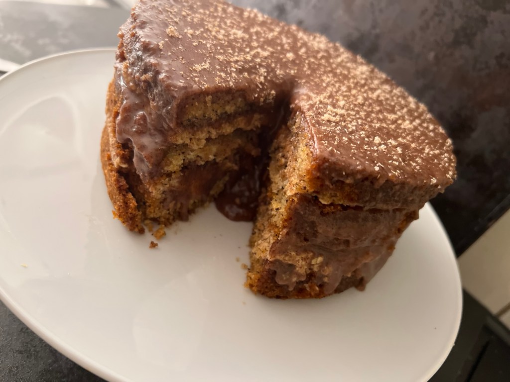 Jag fick under hösten en förfrågan om att göra en glutenfri version av Taylor Swifts trendande cookies. En chaikryddad luftig torr kaka med en glasyr som smakar kanel och toppad med nyriven muskot. Ett recept som jag ännu inte är helt nöjd med, framförallt för att kakan behöver bli lite bättre. Men smakerna är så bra tillsammans, lätta, kryddiga, mjuka och varma. Så till min frus födelsedag i början av november bakade jag en tårta, inspirerad av dessa kakor, den blev verkligen bra. Jag använder mig av en favoritmetod med bottnar som varvas med glasyr och en ”chokladbollssmet”, denna gången minus chokladen.