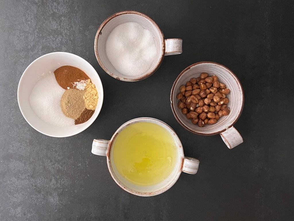 Jag börjar med att väga upp alla ingredienser till pepparkaksmarängen. Sen torkar jag ur bunken med ett papper fuktat med vinäger. Mixar hasselnötterna till ett finkornigt mjöl. Blandar kryddor, majsstärkelse, socker och nötmjölet.