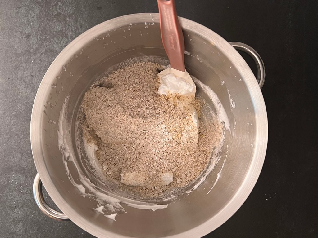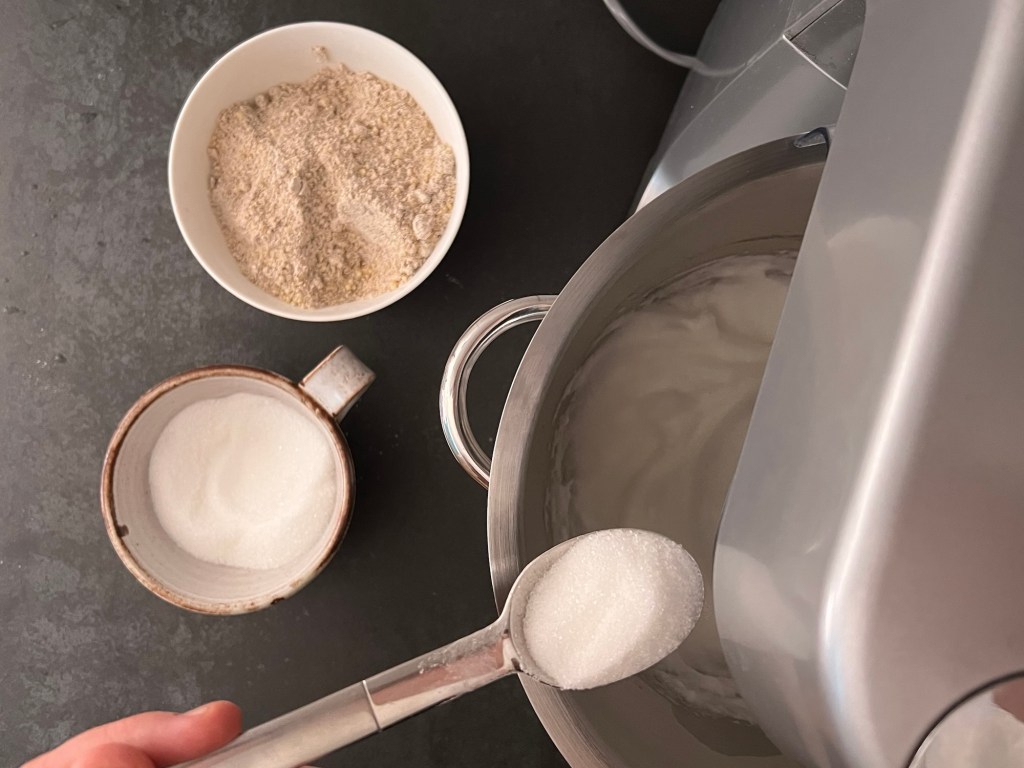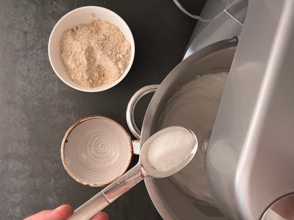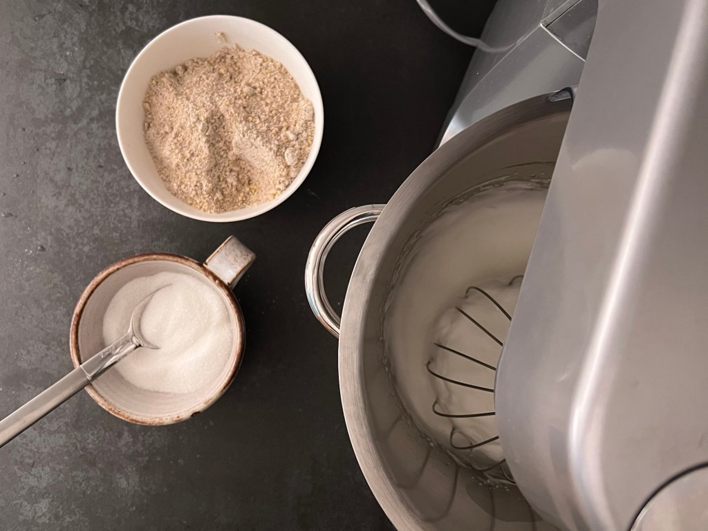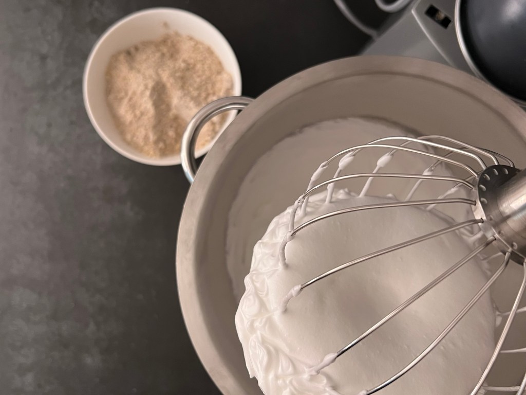 Sen vispar jag äggvitan till ett fast skum. När den är fast tillsätter jag sockret, en matsked i taget samtidigt som jag fortsätter att vispa. När allt socker är i ägget så vispar jag på hög hastighet i cirka en minut till. Stannar maskinen, skrapar samman marängen och vänder ned nötmjölsblandningen med en slickepott.