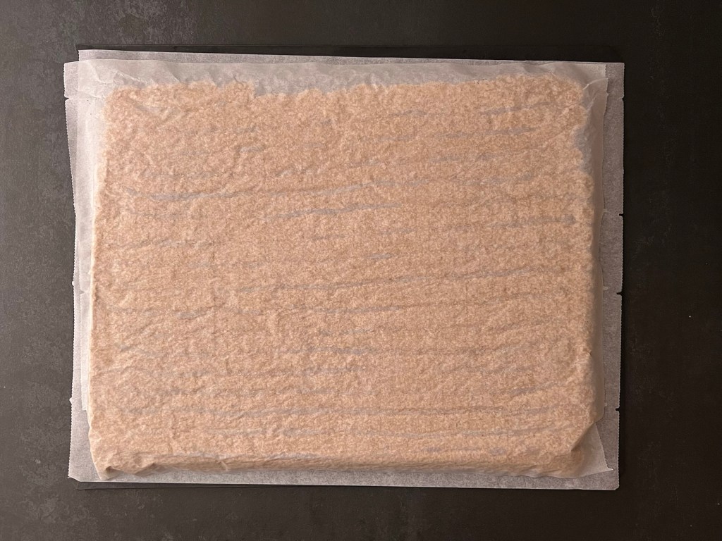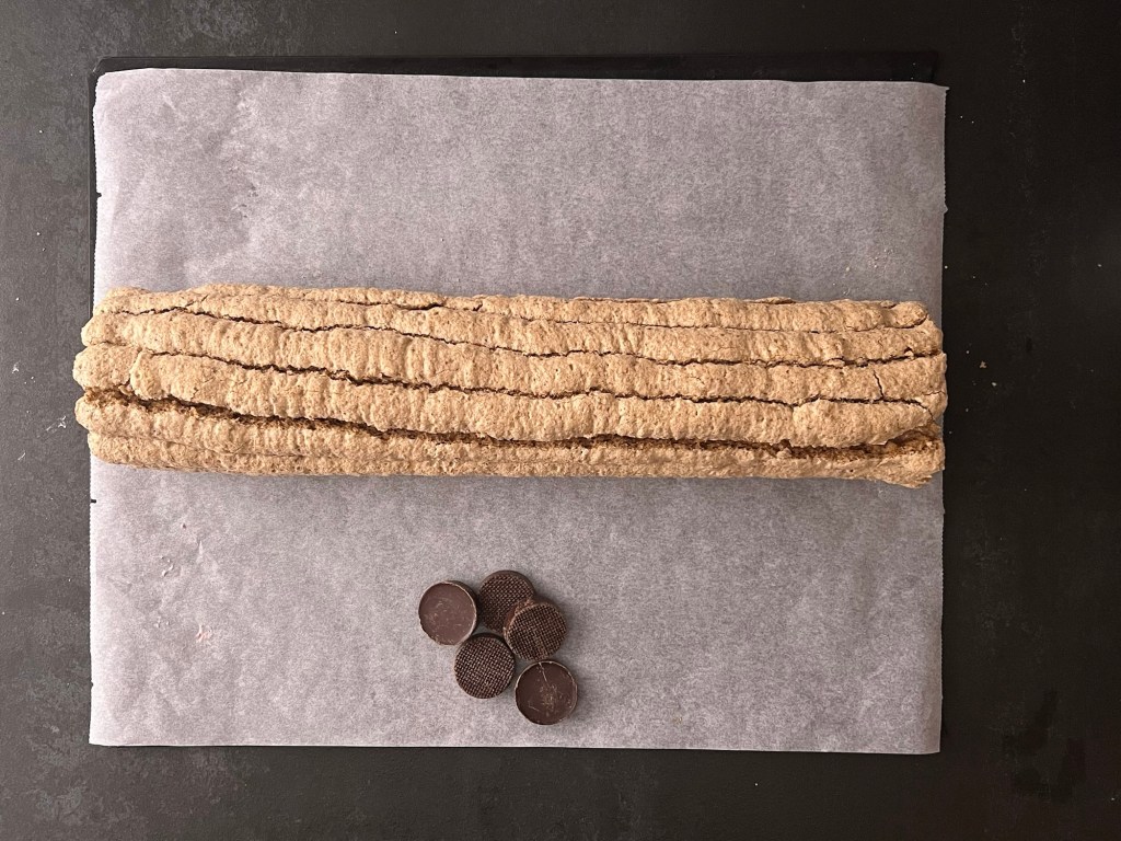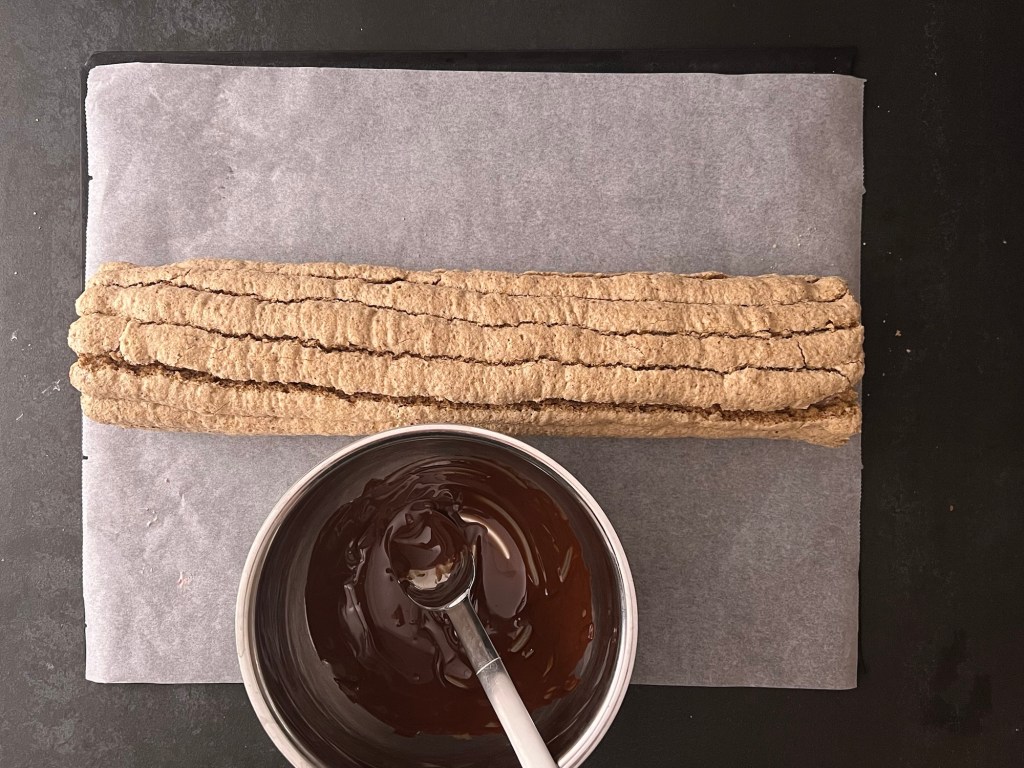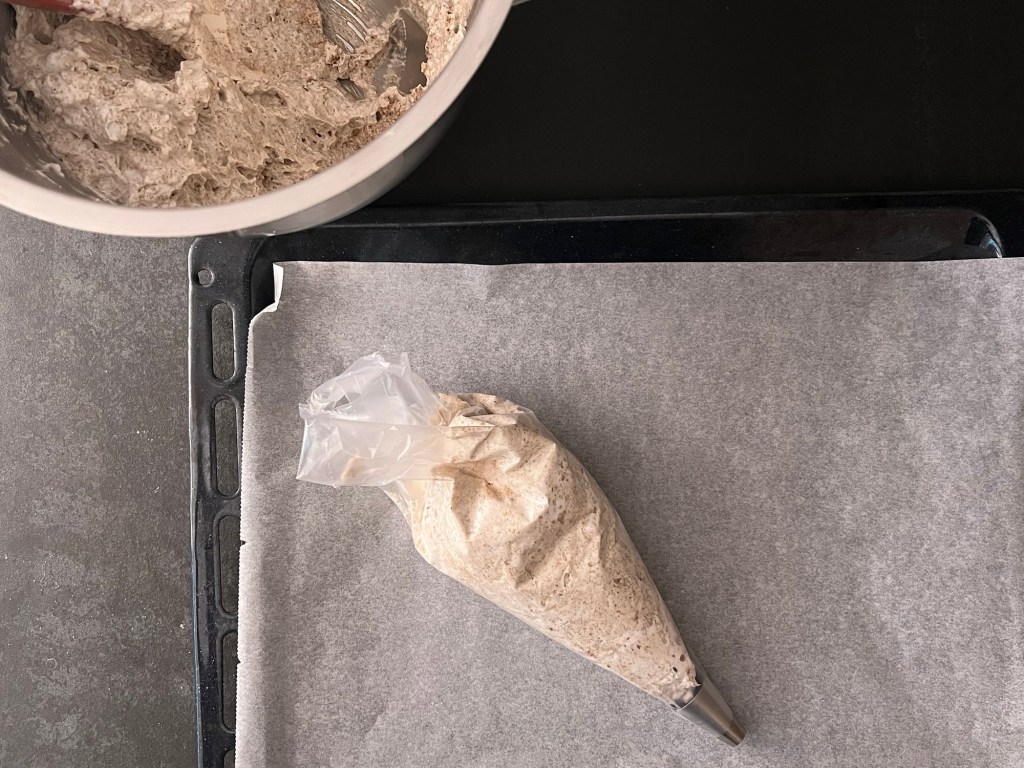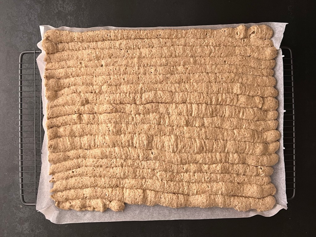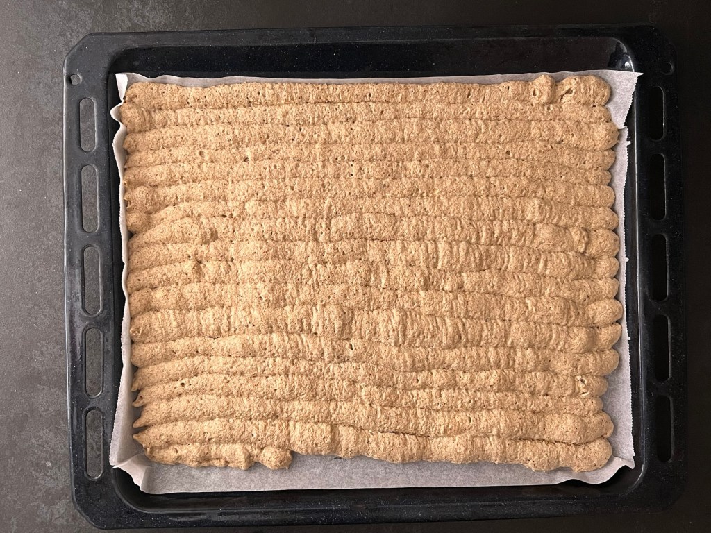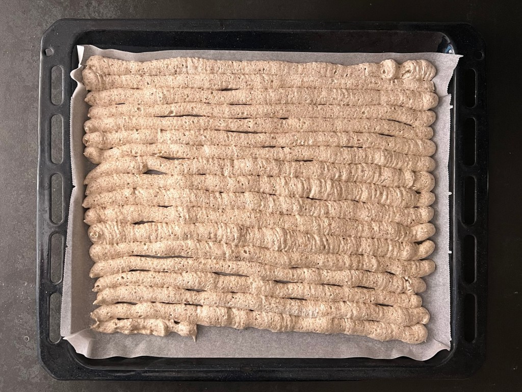 Efter det för jag över marängen i en spritspåse med en rund tyll (man kan klippa ett hål också om man inte har en rund tyll). Sen spritsar jag jämntjocka längder på en bakplåtspappersklädd plåt och bakar av i ugnen. När jag tar ut plåten ur ugnen får marängen svalna på ett galler. Sedan vänder jag den genom att lägga ett bakplåtspapper och en plåt ovanpå och vända allt. Pillar bort bakplåtspappret.