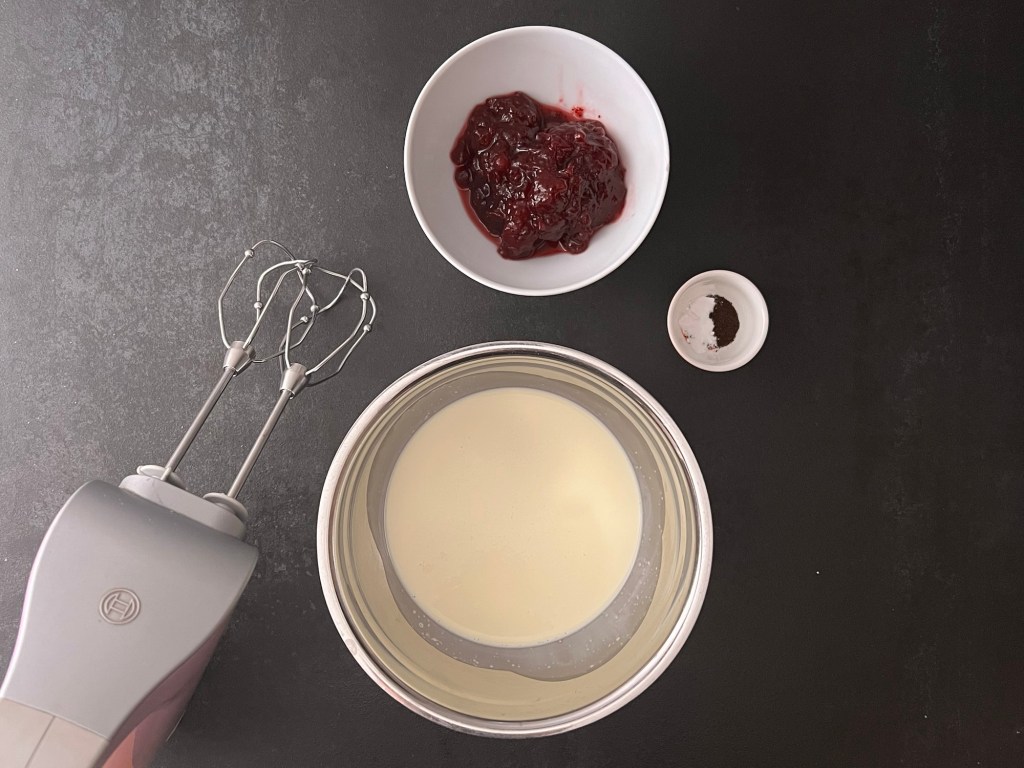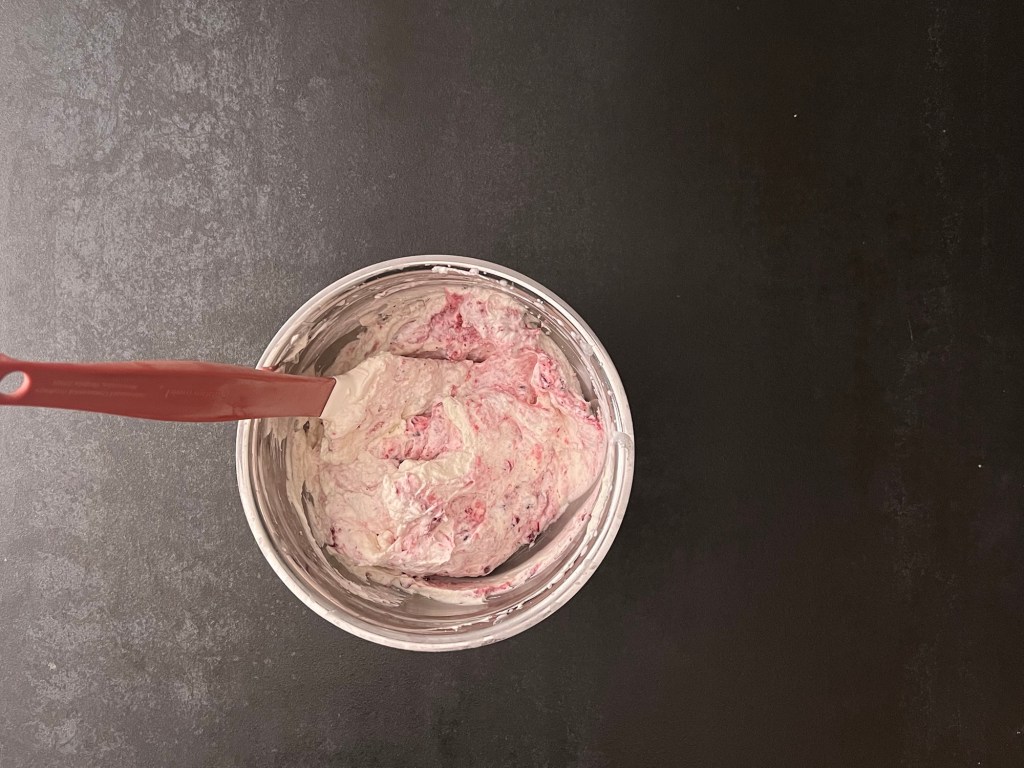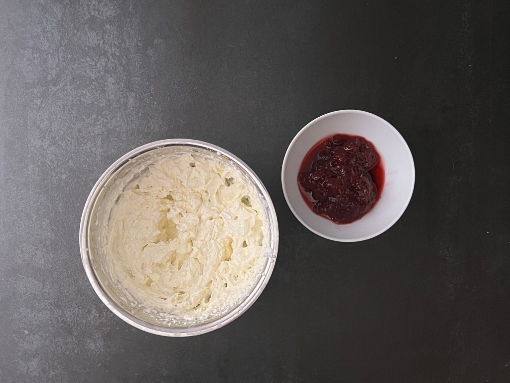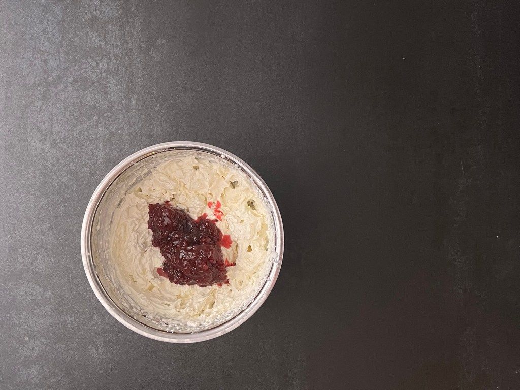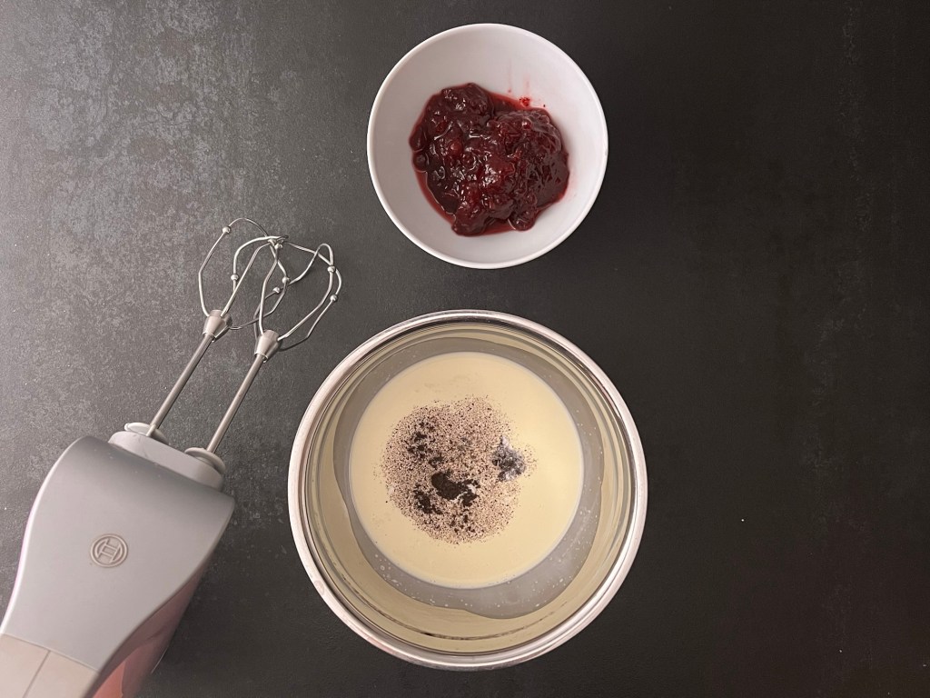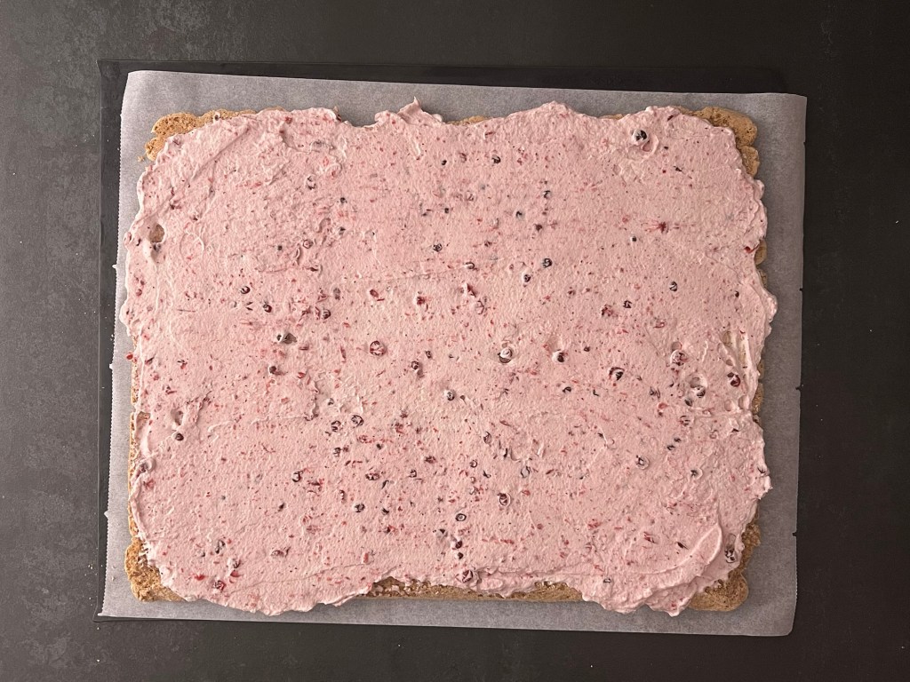 När marängen nu har svalnat och är utan bakplåtspapper så vispar jag grädden fast. Jag vispad deb med lite vaniljpulver och lite bakpulver. Sen vänder jag ned en fast lingonsylt/rårörda lingon.