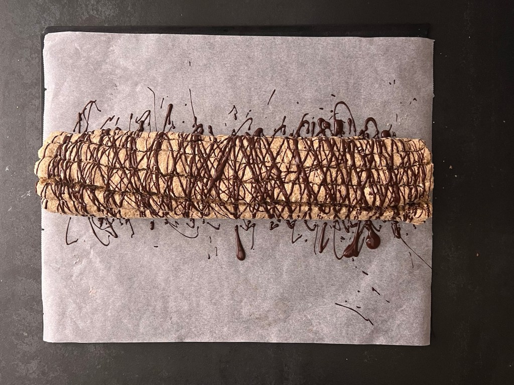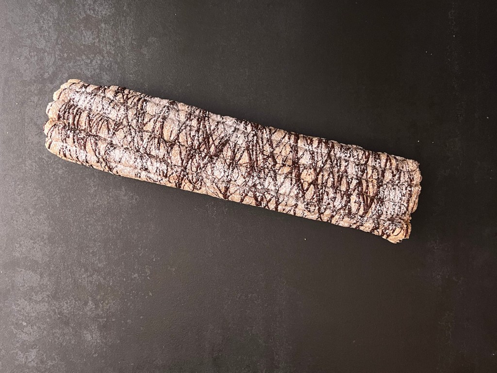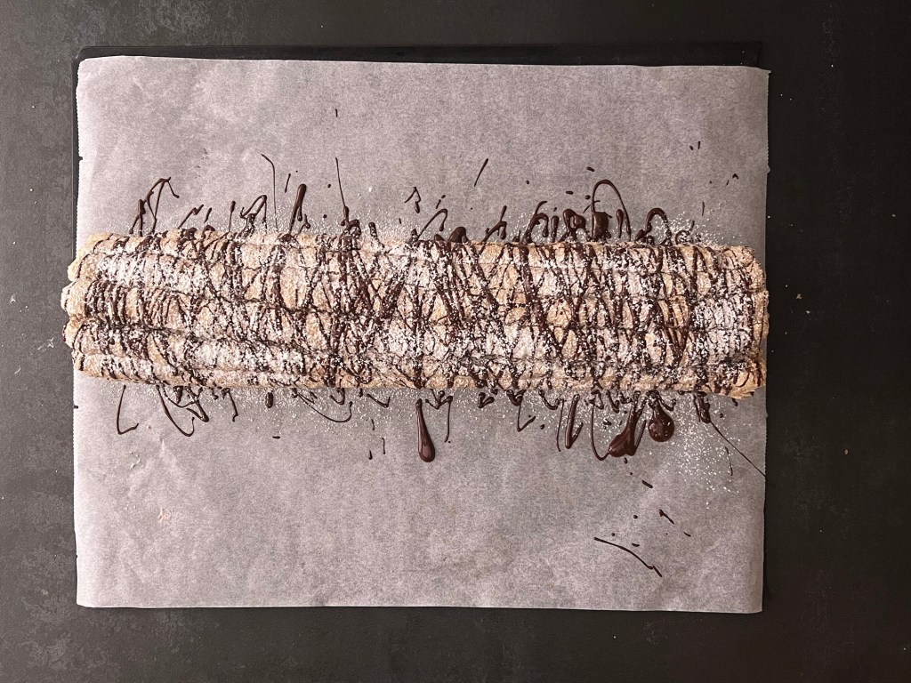 Jag brer en jämnt laget över hela marängen. Rullar samman den och dekorerar med smält choklad och florsocker.