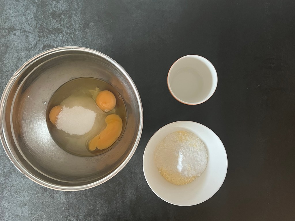 Rulltårtsbotten är enkelt att göra och så tacksamt, för det går så fort. Starta ugnen och väg upp ägg och socker i en bunke. Blanda de övriga torra ingredienserna i en skål och värm vatten, jag brukar använda vattenkokaren. Förbered en plåt med bakplåtspapper. Sen vispar jag ägg och socker vitt och pösigt.