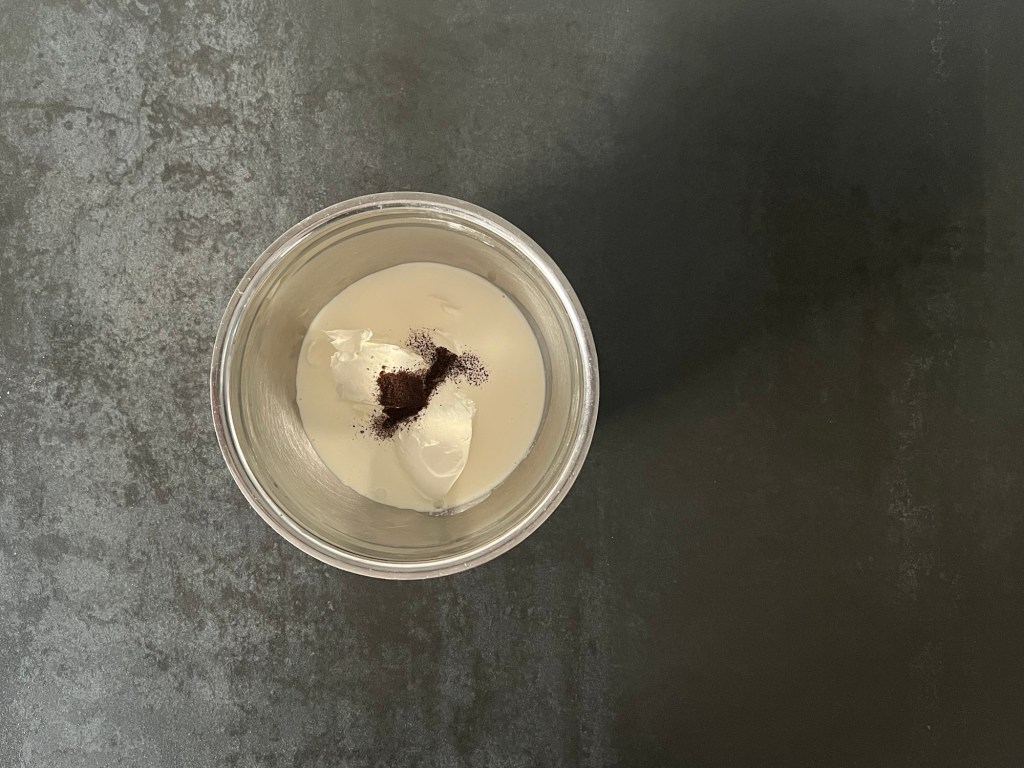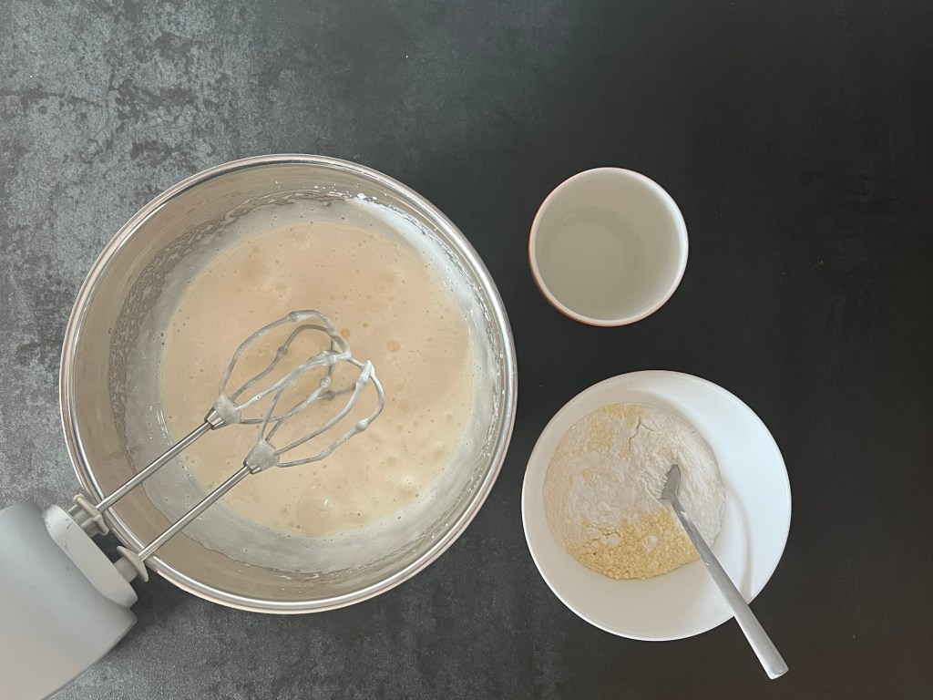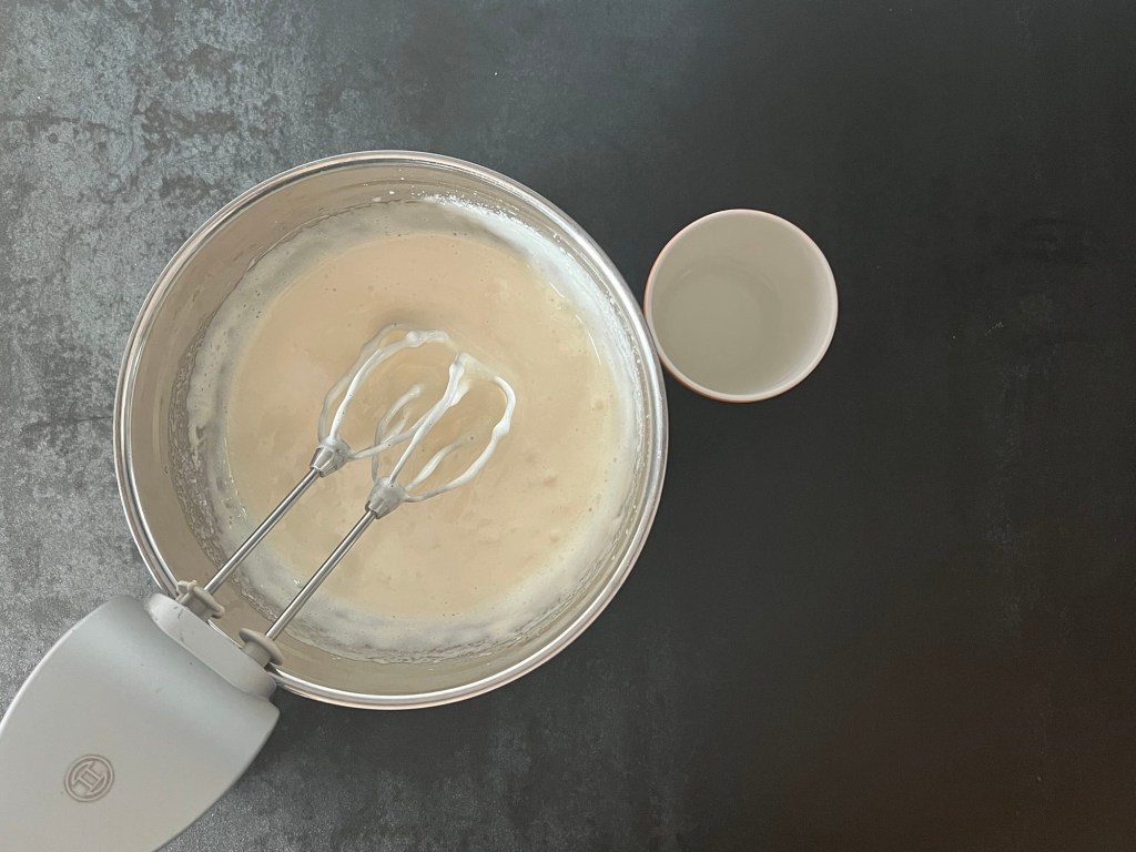 Tillsätter mjölmixen och vispar slätt på låg hastighet, efter det tillsätter jag hett vatten och vispar återigen slätt på låg hastighet.