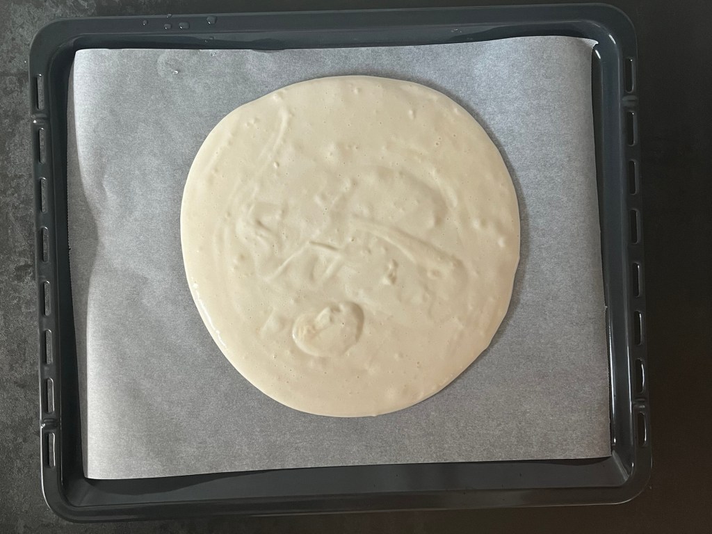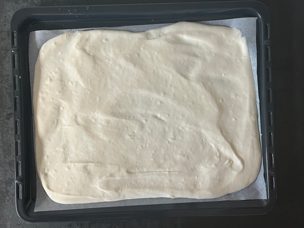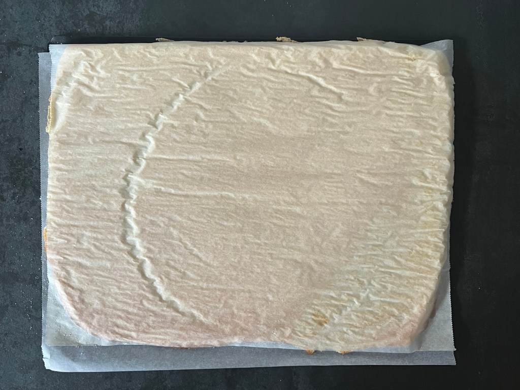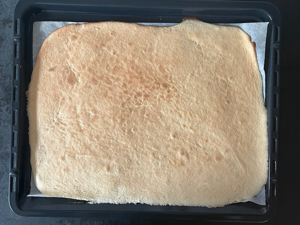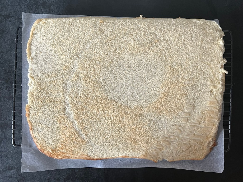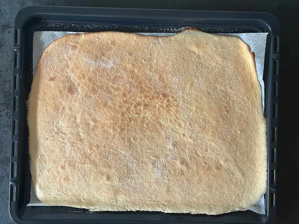 Häller upp smeten på den bakplåtsklädda plåten och fördelar den jämnt över hela pappret. Bakar av i ca 5min och tar sedan ut kakan. Stör socker ovanpå, lägger ett bakplåtspapper och sedan en plåt över kakan och vänder allt upp och ner.