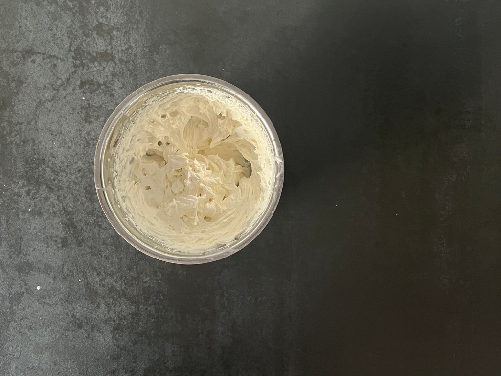 Först börjar jag med att vispa färskostcremen, men man kan vispa den när rulltårtan svalnar också. Lika delar vispgrädde och färskost vispas fast med lite vaniljpulver. Förvarar den i kylen tills det är dags att montera rulltårtan.