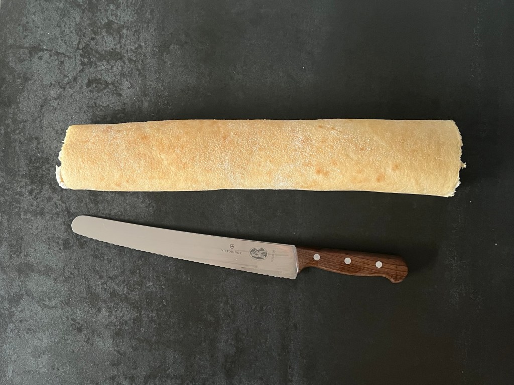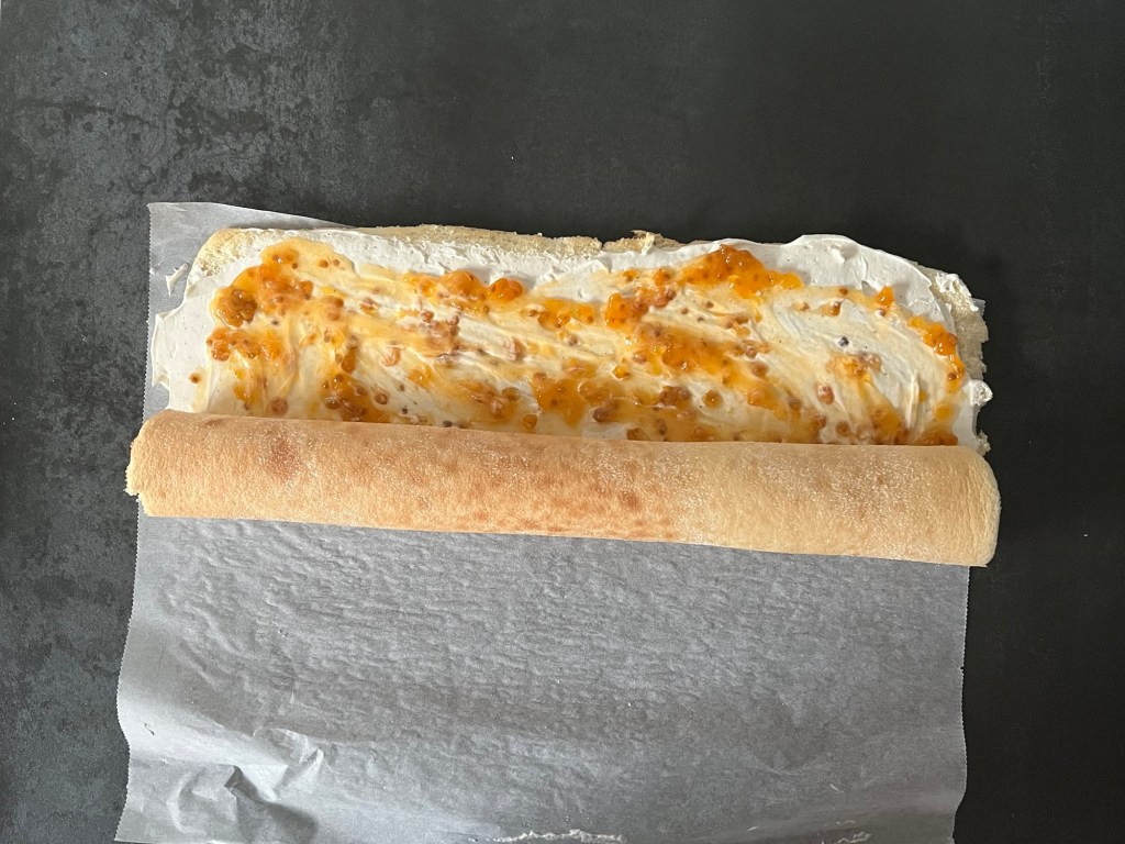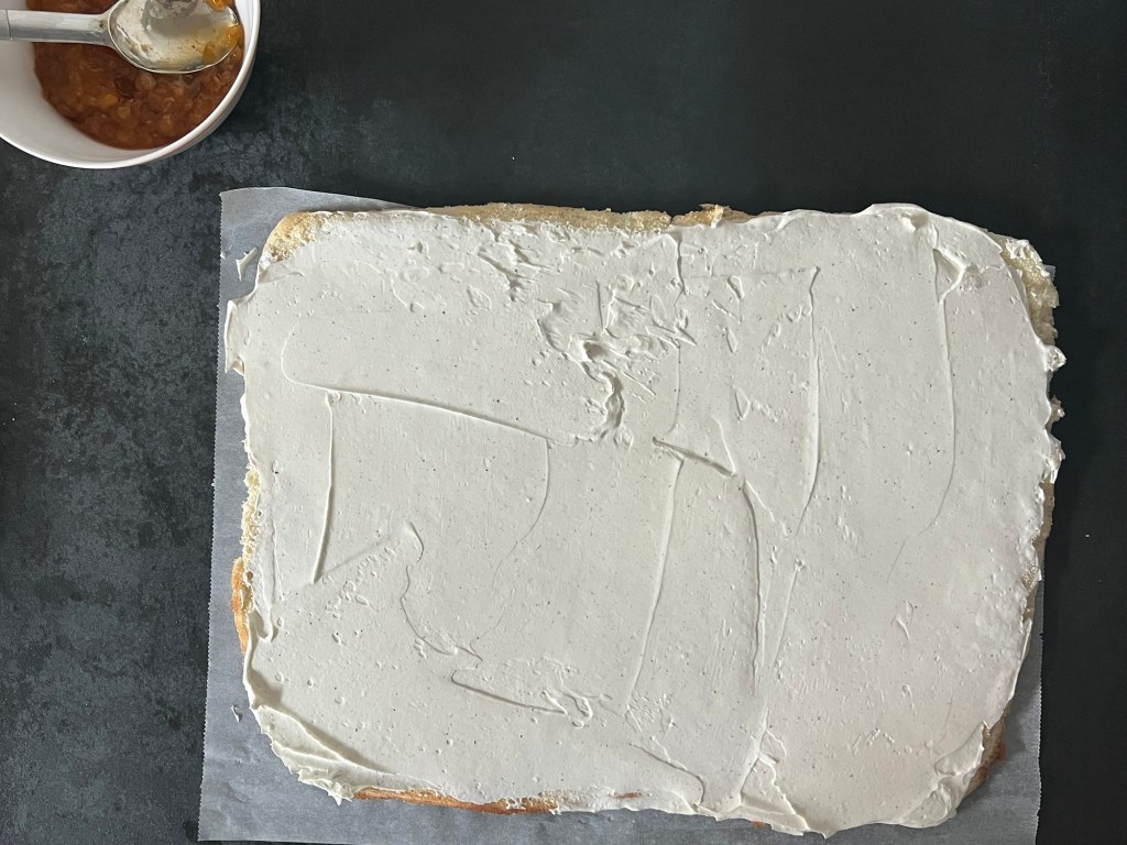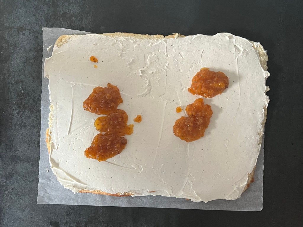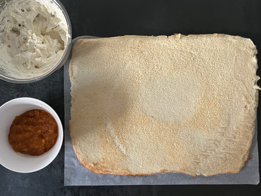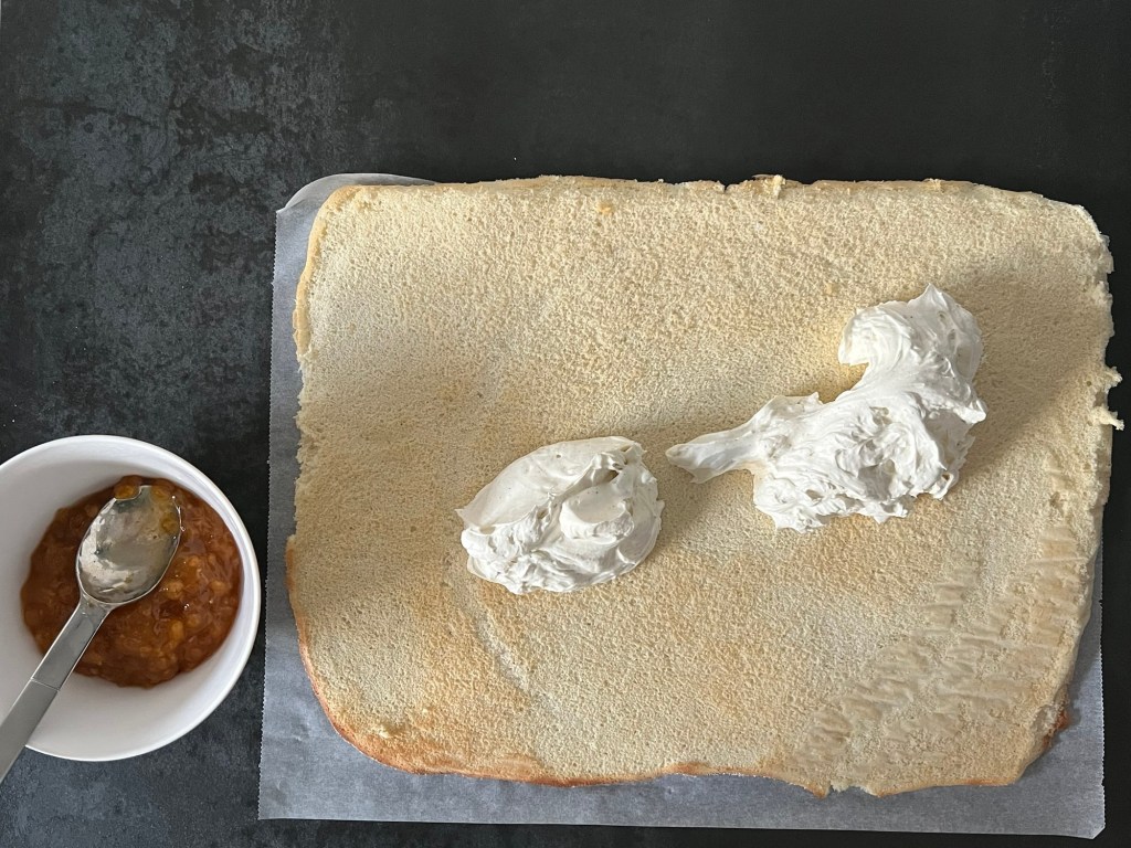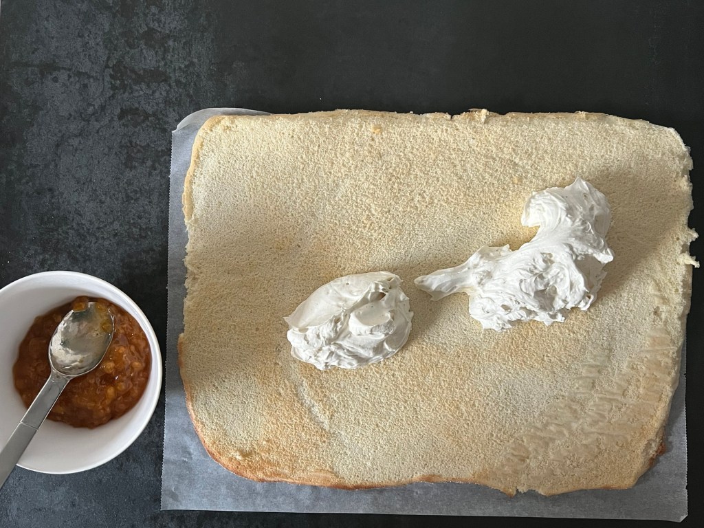 Lirkar av pappret, och låter botten svalna på ett galler innan jag fyller den. När den kallnat breder jag ut färskostcremen i ett jämnt lager och ovanpå färskosten breder jag ut sylten. Rullar sedan samman rulltårtan och låter den vila i kylen i minst 15 minuter innan servering, så att den sätter sig.