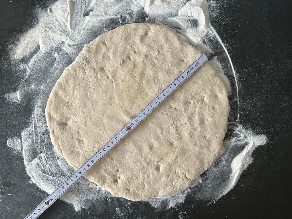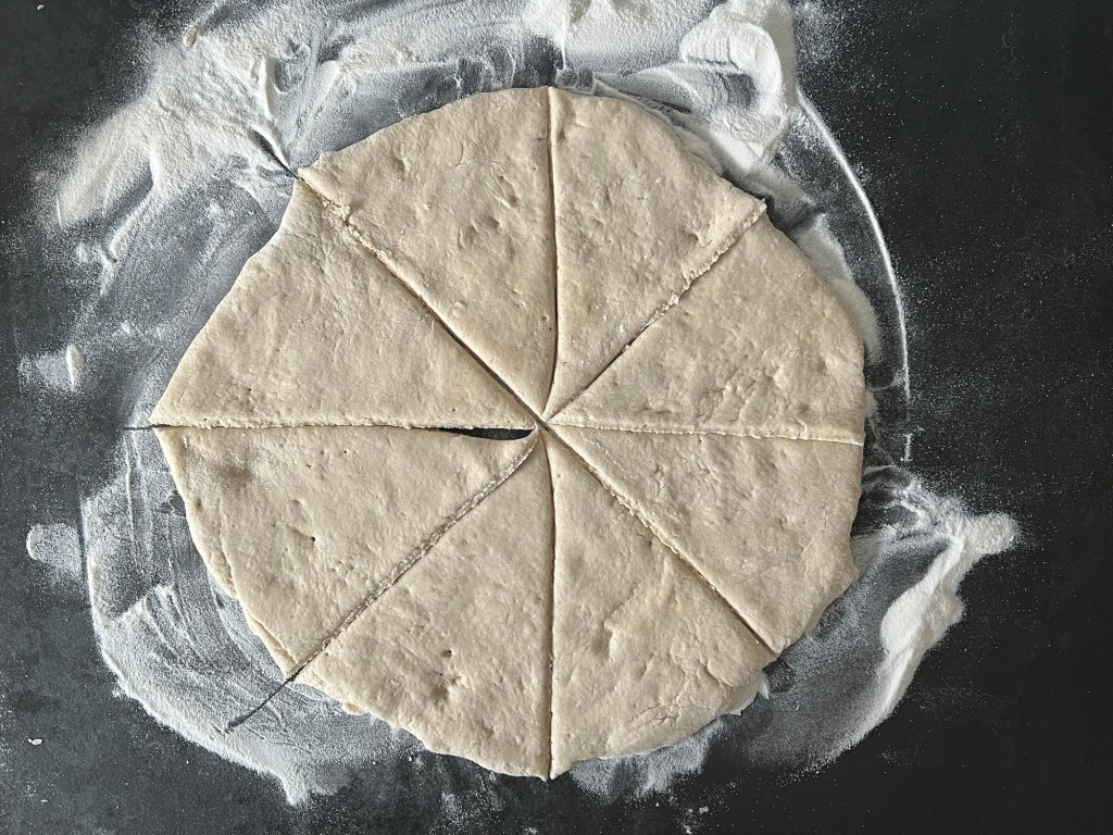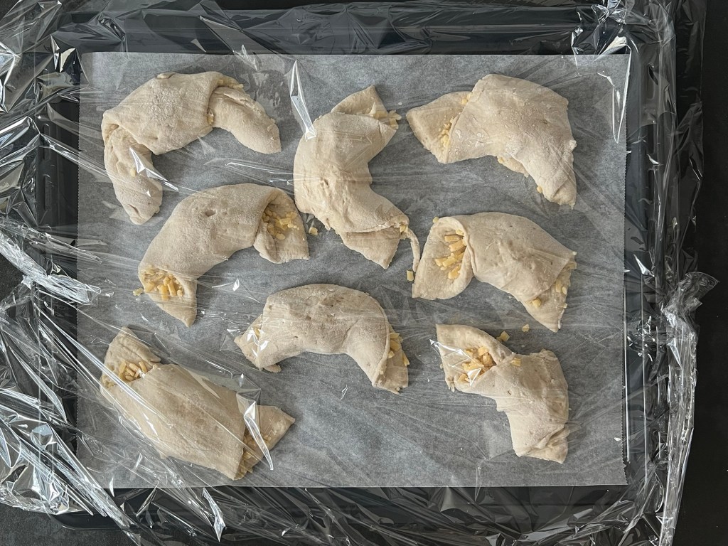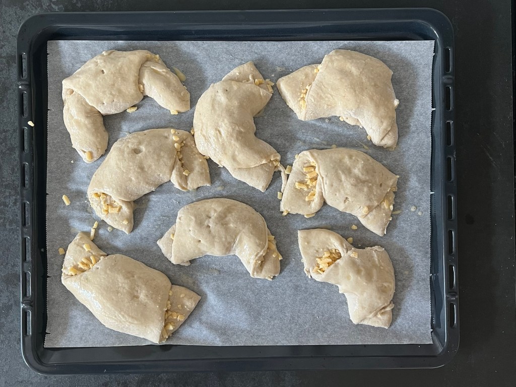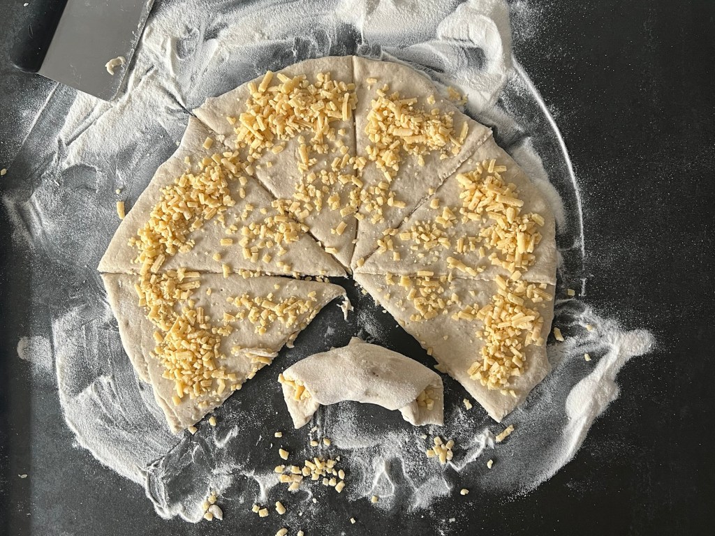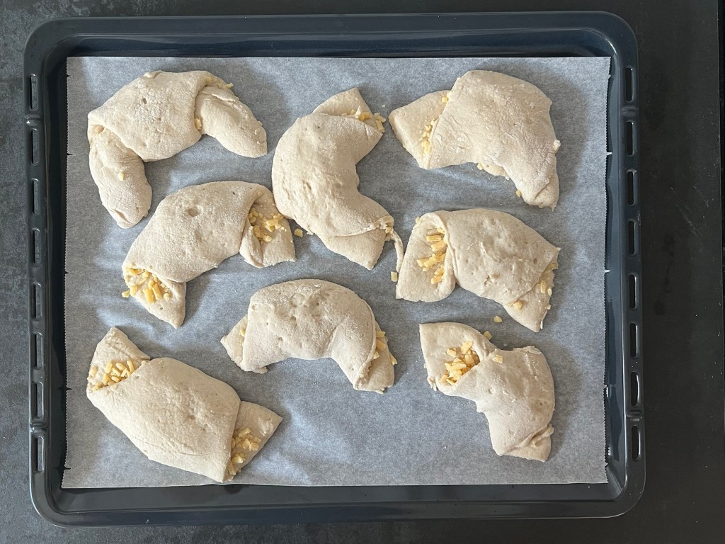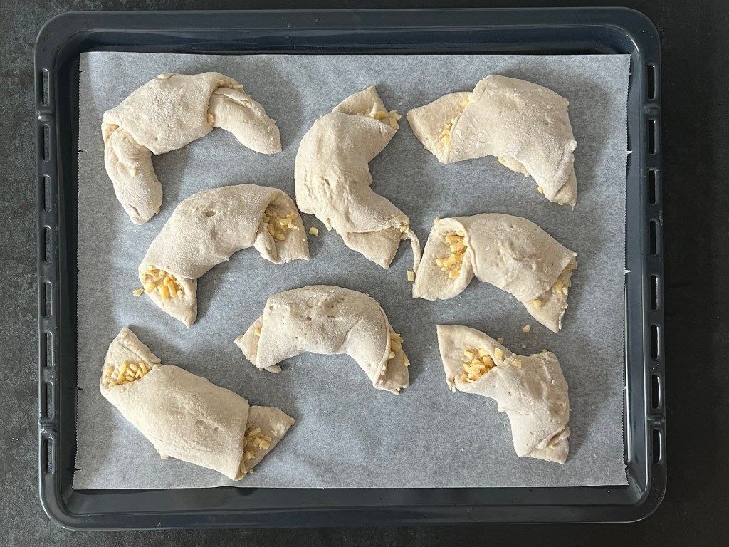 När degen vilat tar jag upp den på mjölad bänk, formar den med mjuka händer tillen slät boll. På rikligt mjölad bänk plattar jag ut den till en rund botten, ca 35-40cm i diameter. Lyfter den lätt runt om i kanten och säkerställer att den inte fastnat i bänken. Delar den i 8st bitar. Osten fördelar jag i en tjockare linje i utkanten på plattan och strör resten över hela. Sen rullar jag dem med mjuka händer, och formar den i lätta bågar, lägger dem på en bakplåtspappersklädd plåt som jag sen plastar lätt. Om de sitter fast i varandra eller i bänken så använd en mjölad degskrapa eller stekspade och lossa dem försiktigt