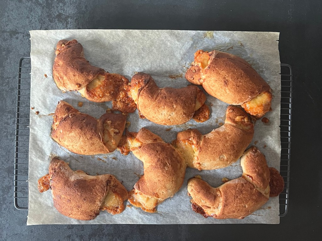 När de jäst färdigt under plasten så penslar jag dem med ägg och bakar av dem. Efter ugnen får de ligga ca 10min på bakplåtspapper, på ett galler innan jag tar bort pappret. Osten är fettig och kladdig när den är så pass varm, men det stelnar sen och då kladdar det mindre