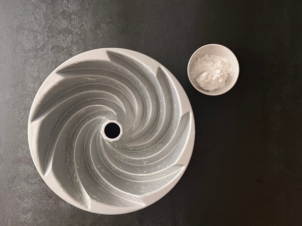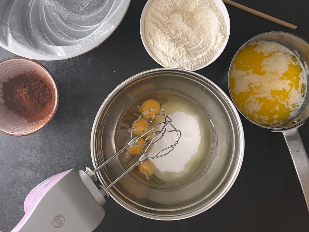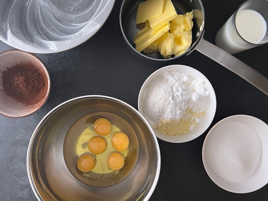 Jag börjar med att väga upp alla ingredienser. Blandar alla torra förutom kakao och socker, till en mjölmix. Sen smörjer jag formen, använder en pensel och mjukt smör, som jag penslar i formens alla vinklar och hörn, sen pudrar jag med potatismjöl och knackar bort överflödigt mjöl. Smälter smöret och tillsätt mjölken i smöret. Efter det vispar jag ägg och socker vitt och pösigt.