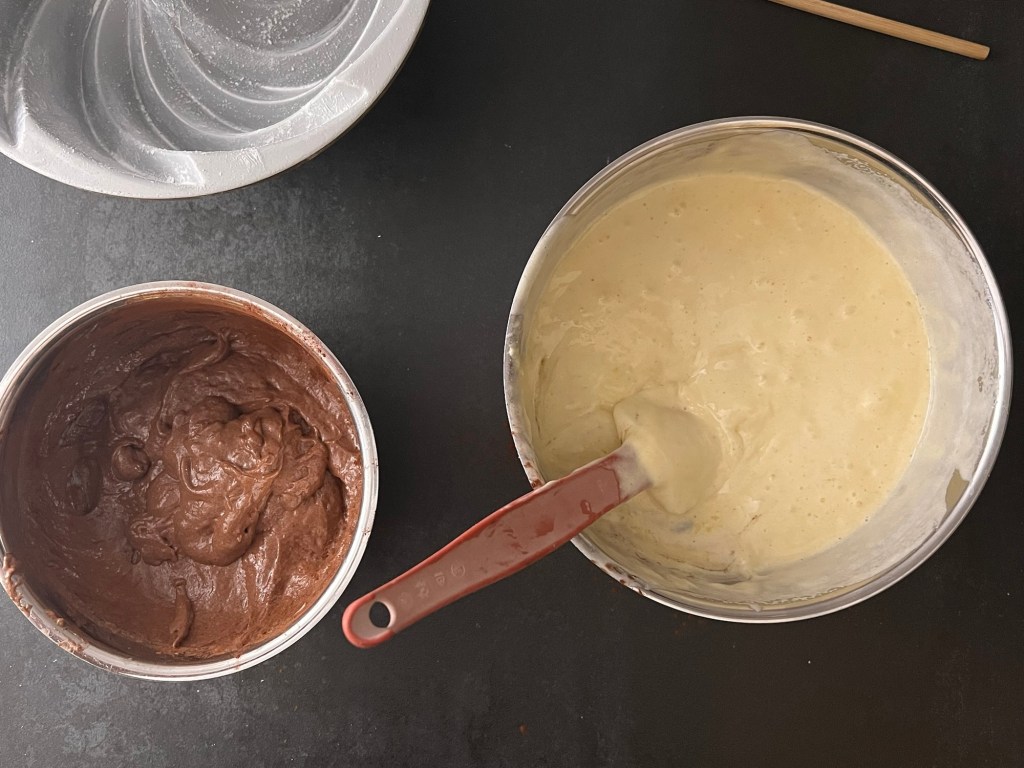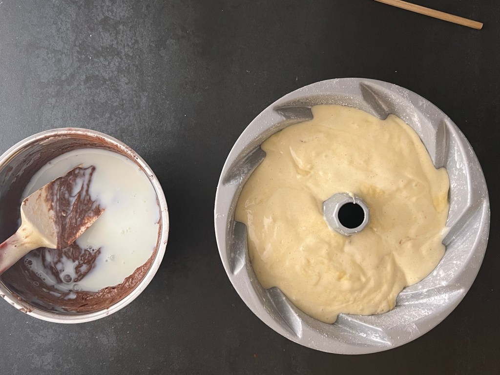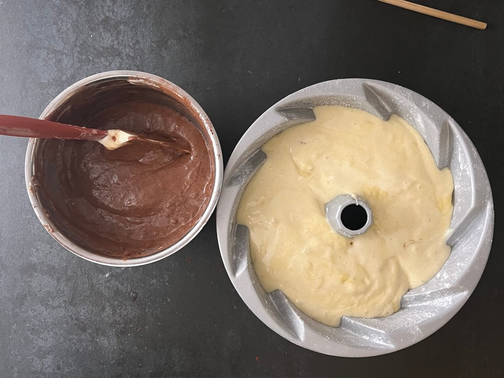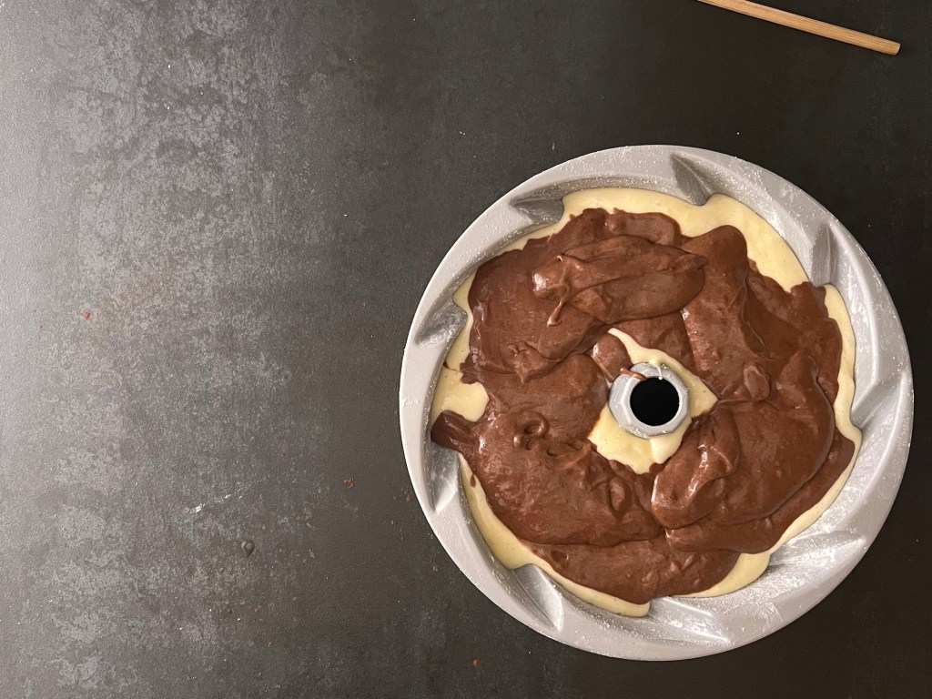 Häller sockerkakssmeten i den smorda formen och fördelar chokladsmeten runt om i sockerkakssmeten. Sen tar jag en pinne eller något annat långt och smalt som inte skadar formen och rör runt lite i chokladen, så att den fördelas i kakan, stoppar sedan in den i en förvärmd ugn.
