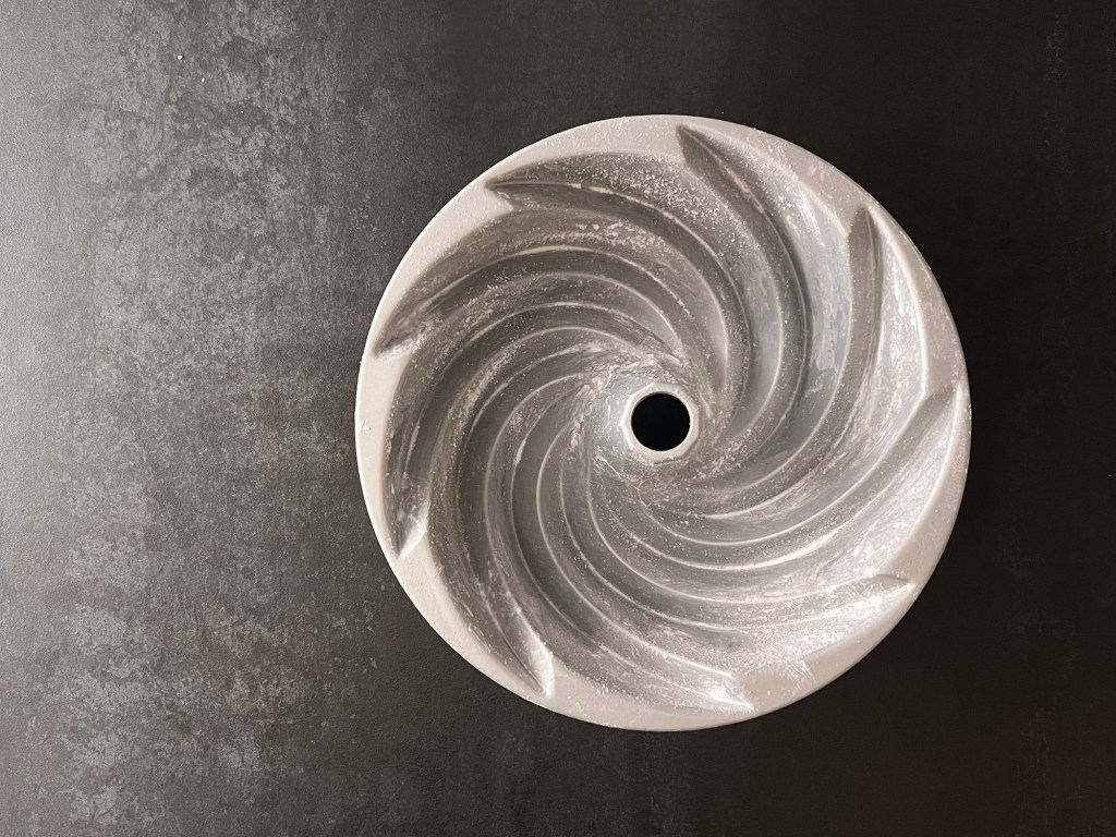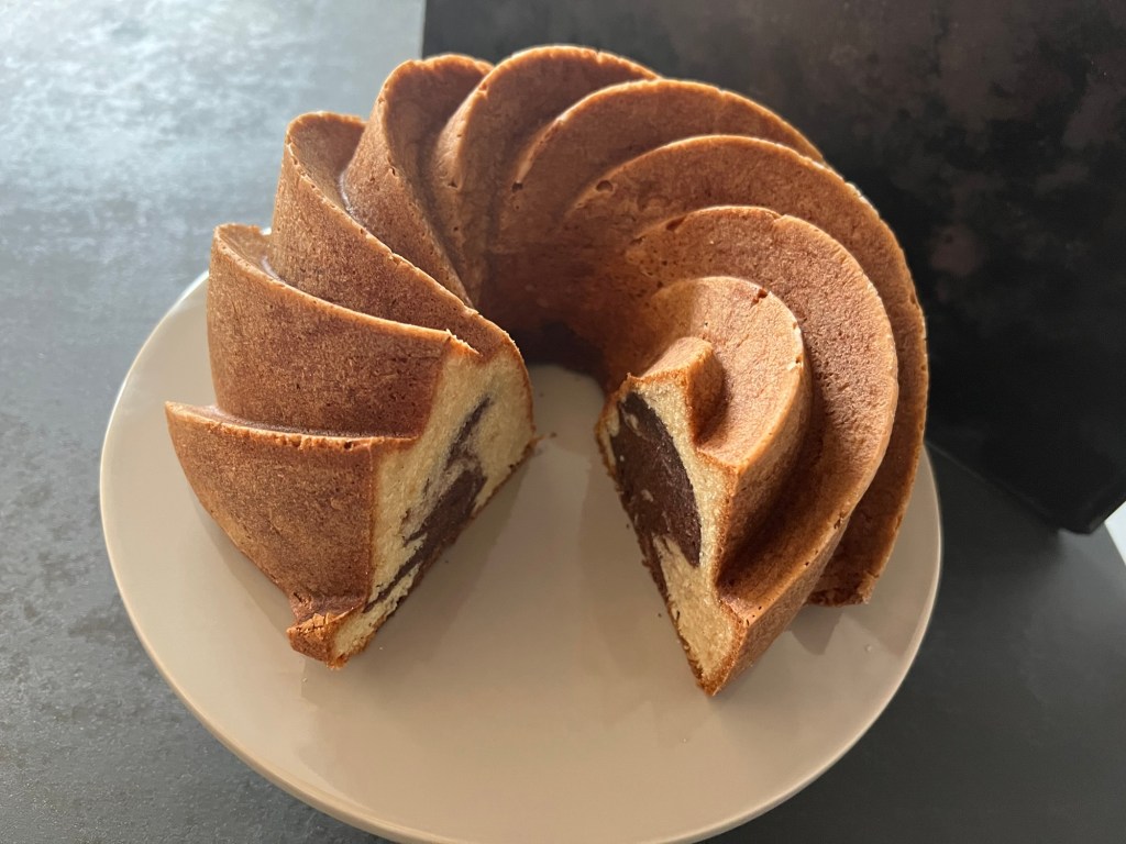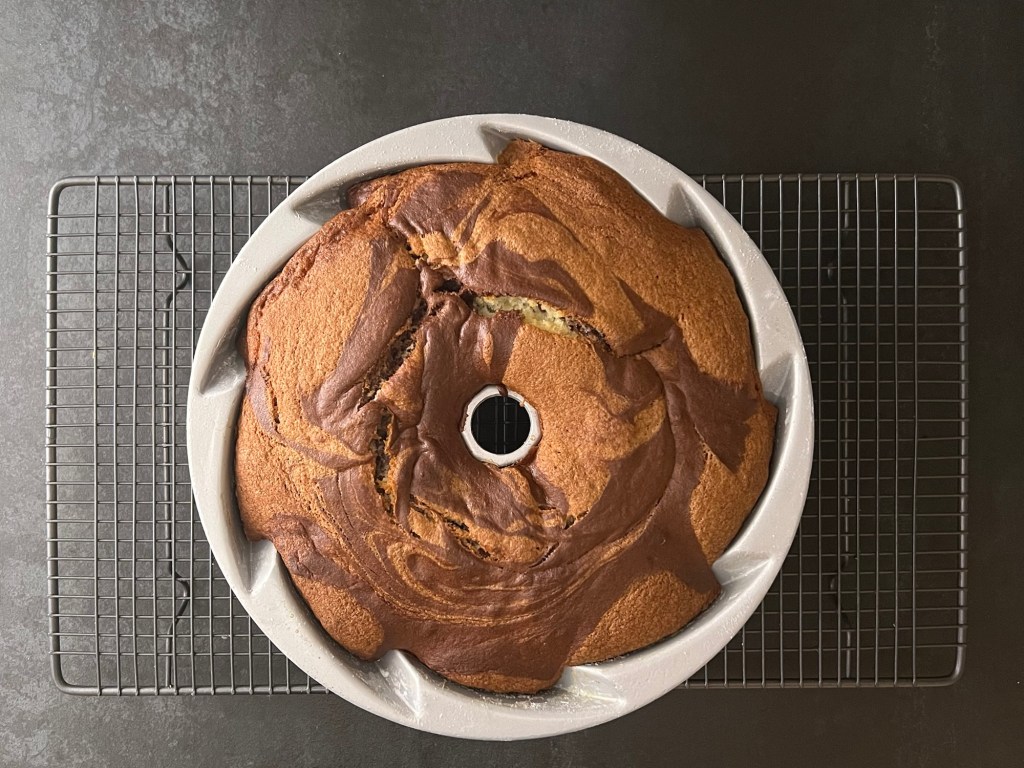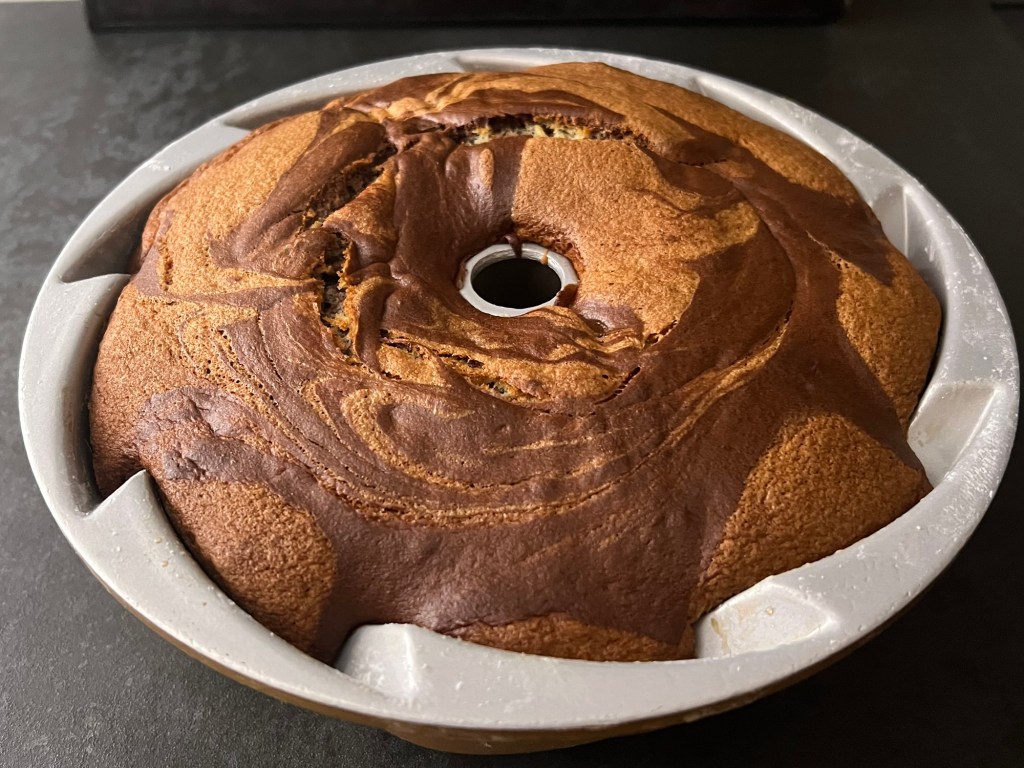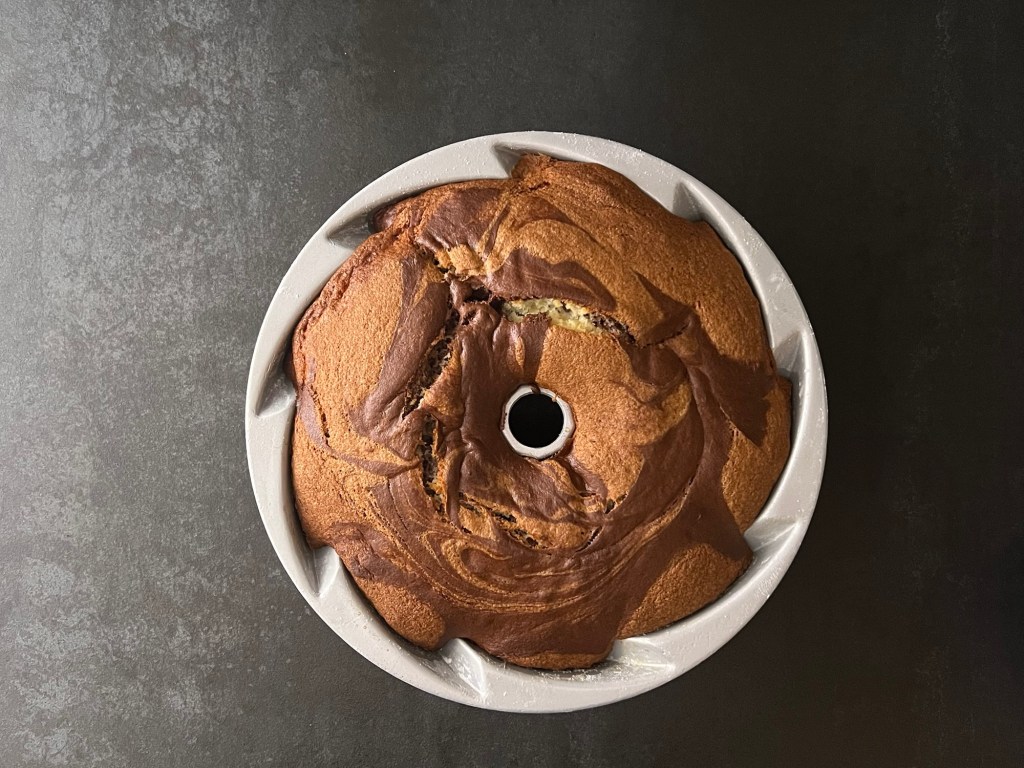 Häller sockerkakssmeten i den smorda formen och fördelar chokladsmeten runt om i sockerkakssmeten. Sen tar jag en pinne eller något annat långt och smalt som inte skadar formen och rör runt lite i chokladen, så att den fördelas i kakan, stoppar sedan in den i en förvärmd ugn.