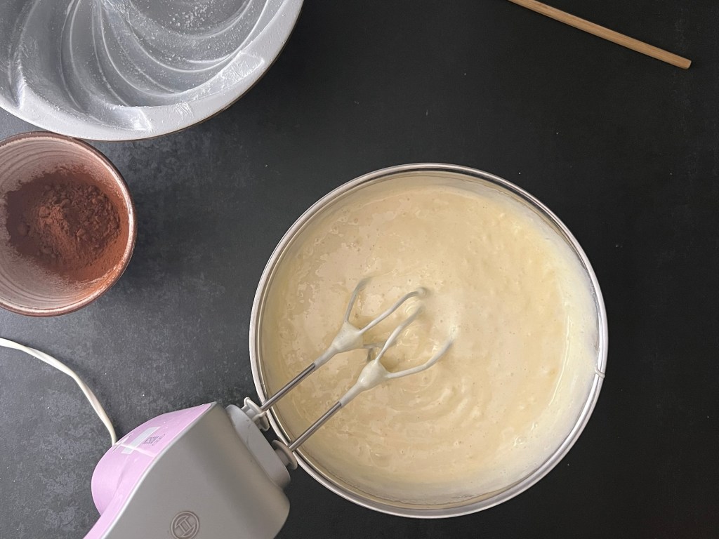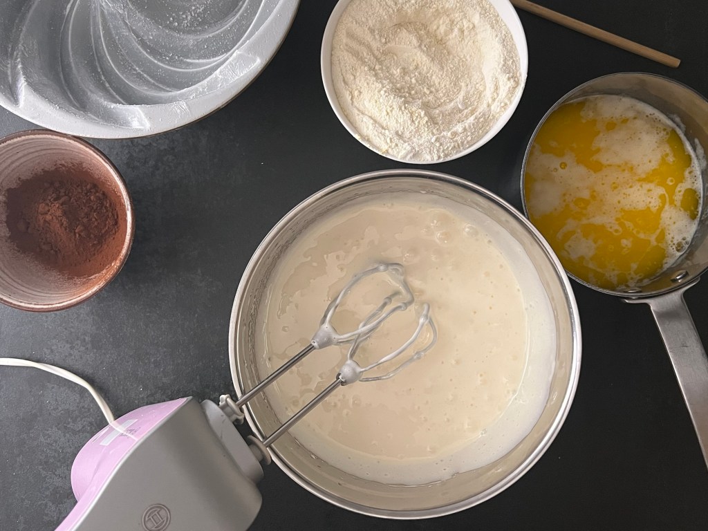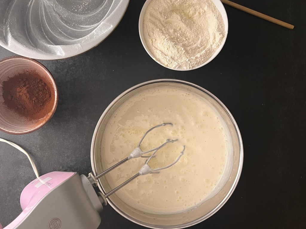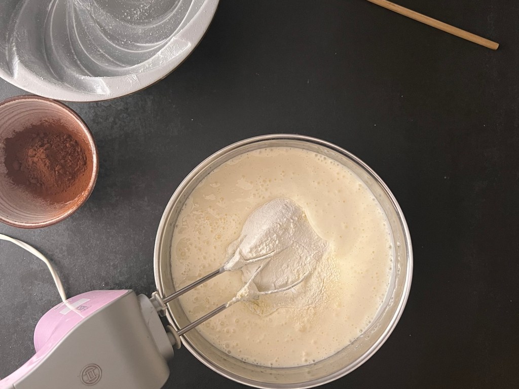 Väger upp en del av smeten i en egen bunka, siktar i kakaon och vispar samman på låg hastighet. Tillsätter mjölken och vänder samman med en slickepott.
