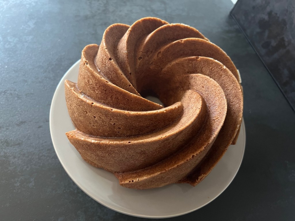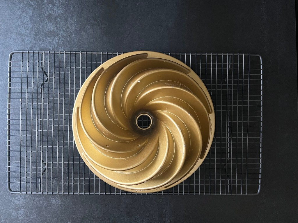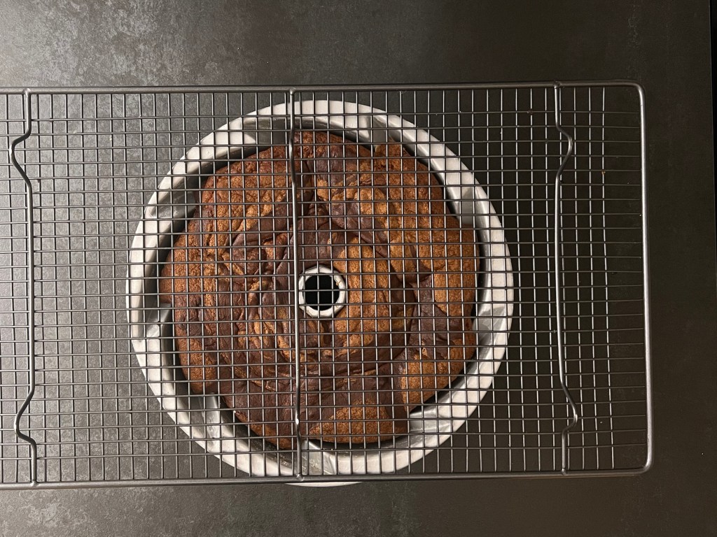 När kakan kommer ur ugnen får den svalna i formen, på ett galler i ca 15min, sedan vänder jag upp den på gallret och tar bort formen, låter den svalna så, öppen på gallret. Servar först när den verkligen svalnat.