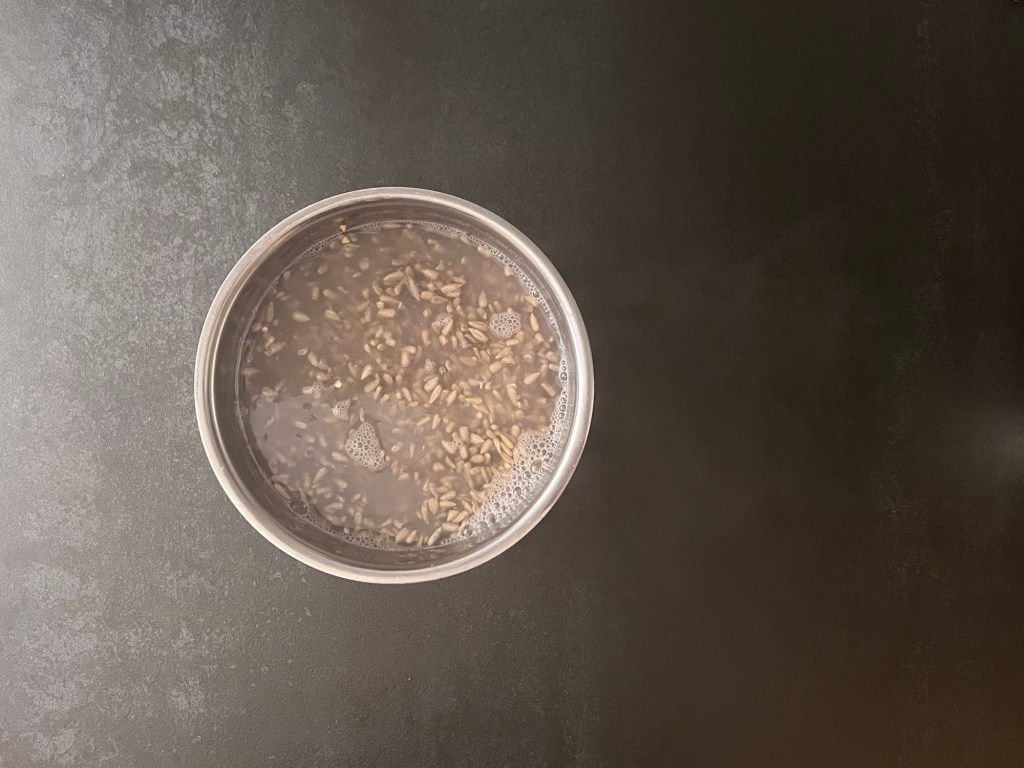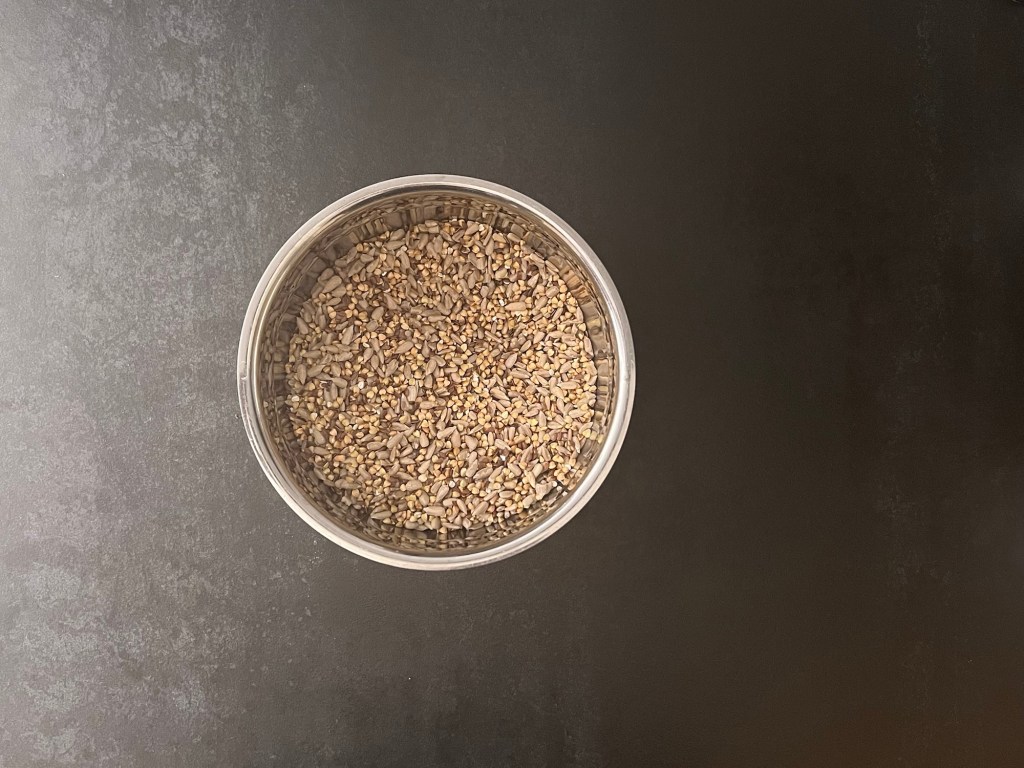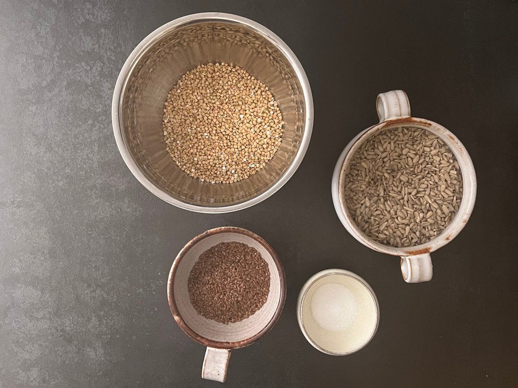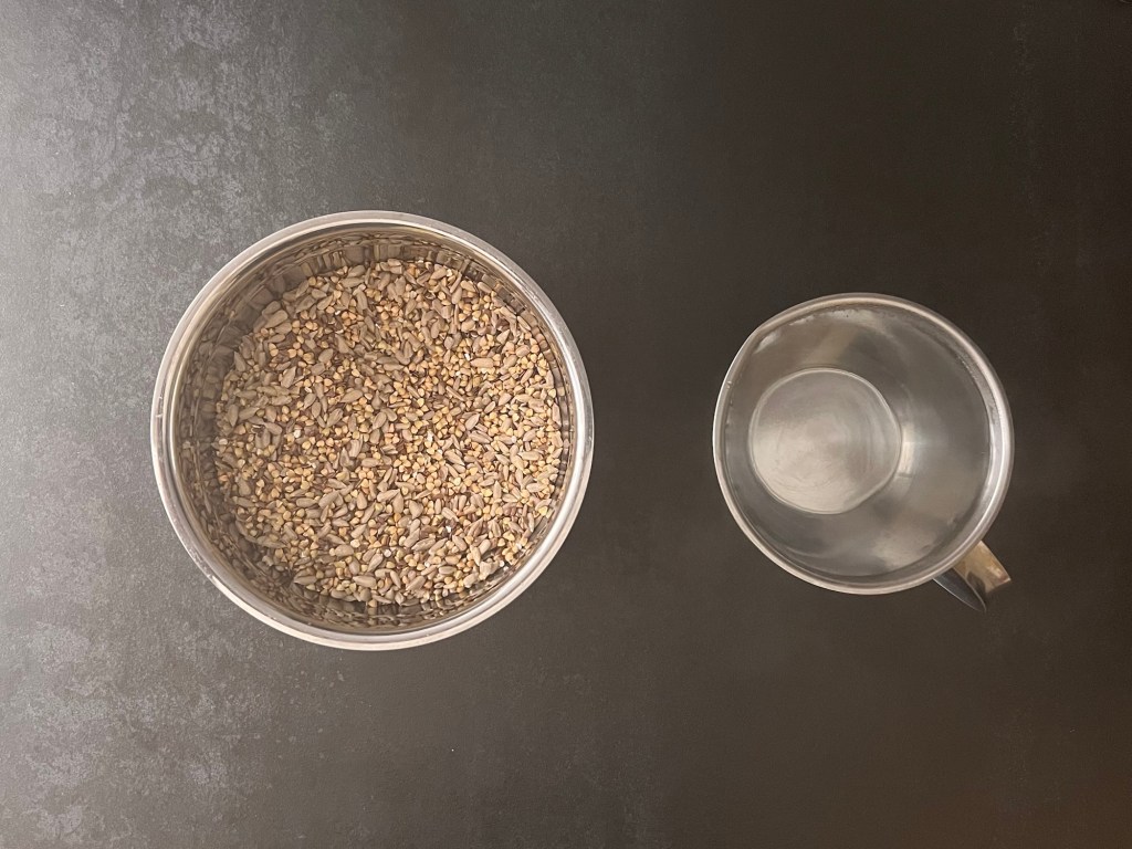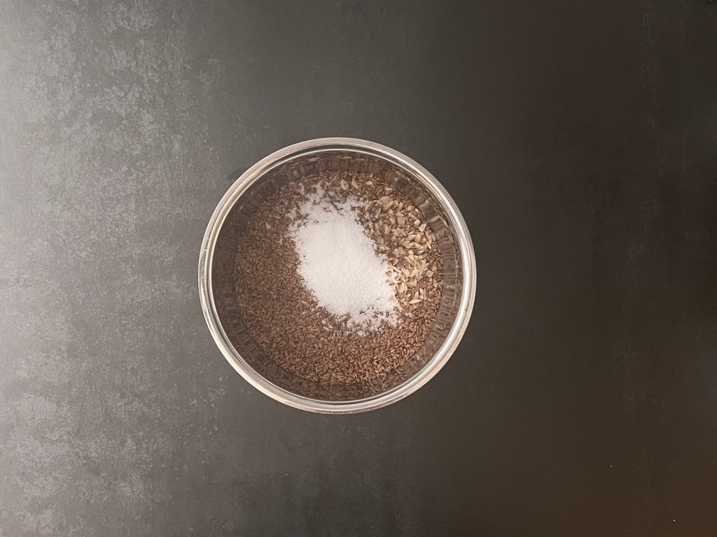 Jag väger upp frön och salt, blandar i en bunke. Kokar upp vatten och slår över fröna. Rör runt och plastar direkt, sen får bunken stå framme i köket i ca 12h innan jag fortsätter med Dag 2.
