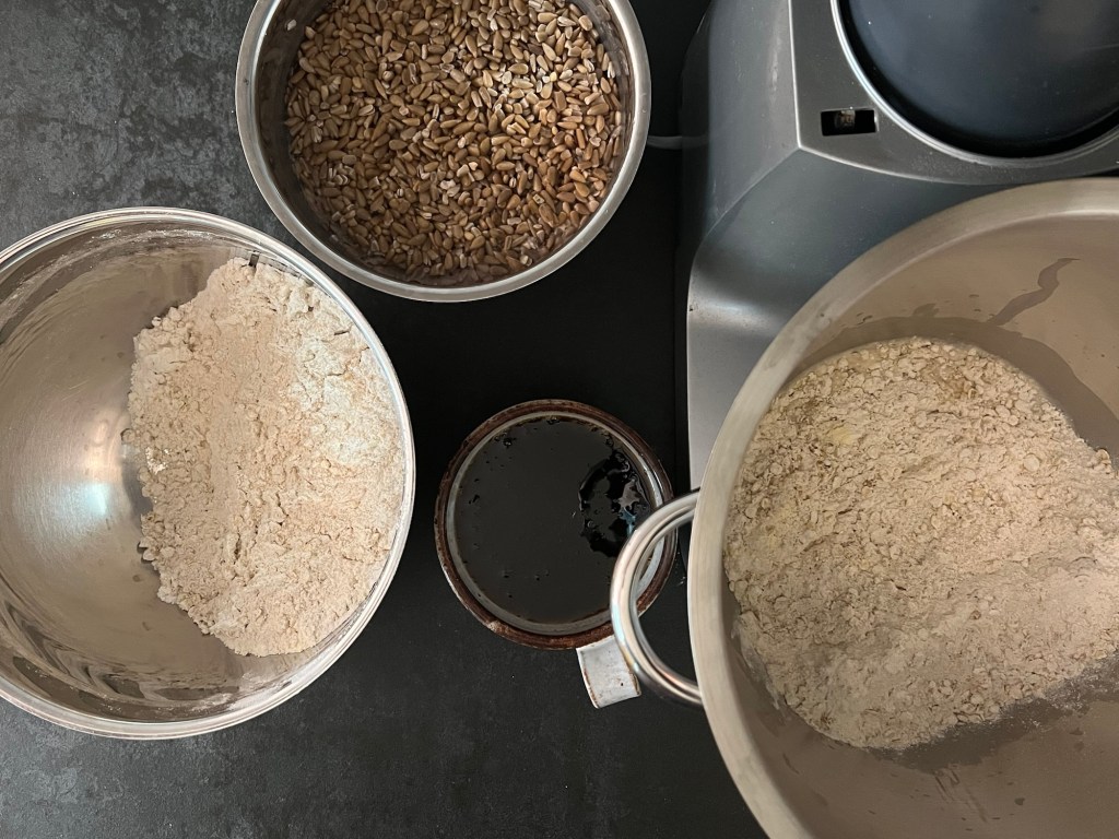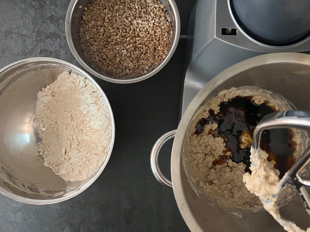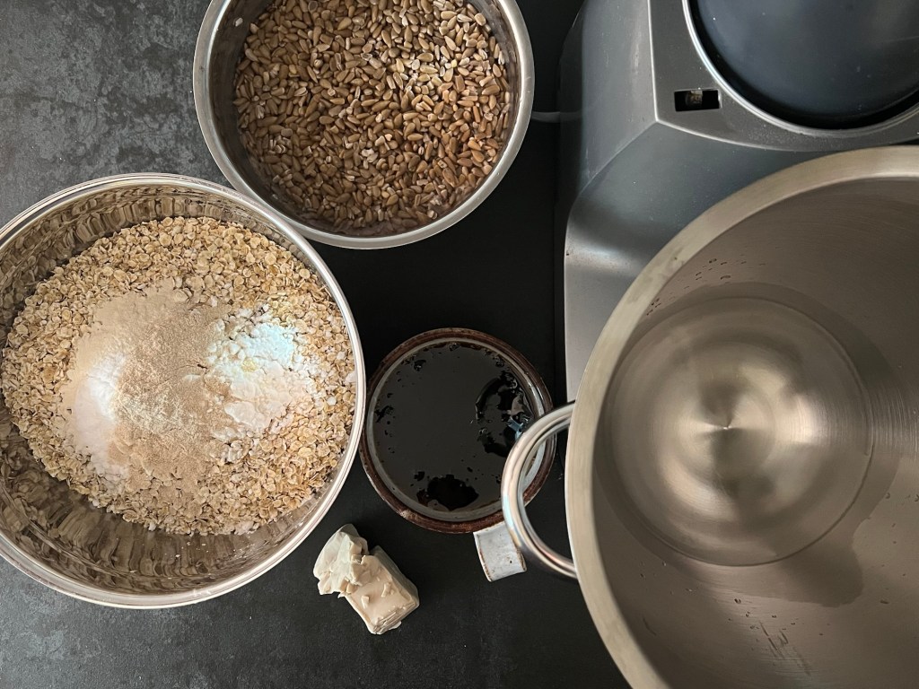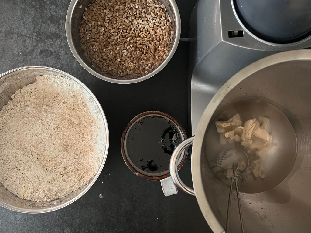 Jag väger upp alla delar, de torra blandar jag till en mjölmix, sirap, jäst och vatten väger jag upp för sig. Sen löser jag upp jästen i vattnet.