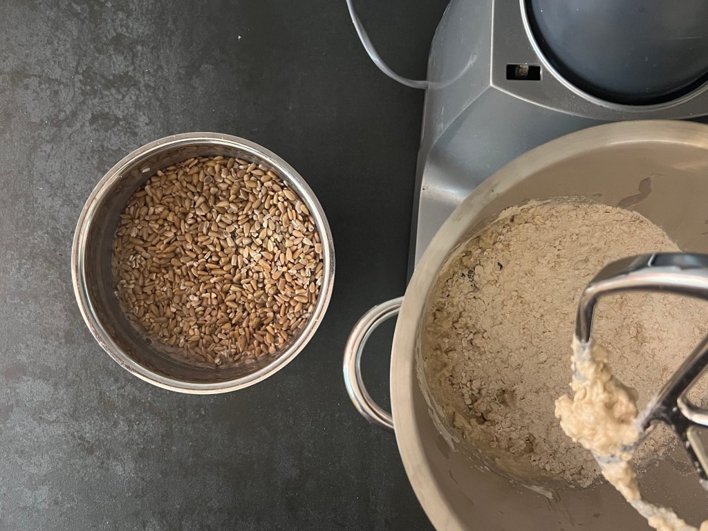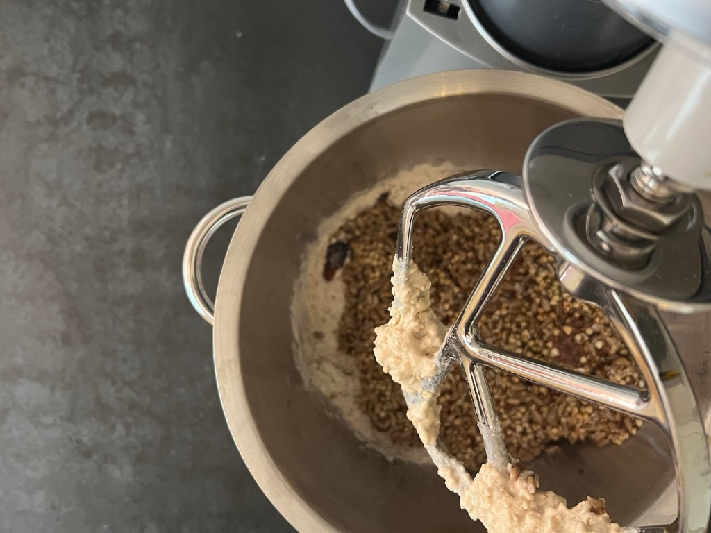Tillsätter sen hälften av mjölmixen och kör samman, sen adderar jag sirap, resten av mjölmixen samt frömixen och den återstående vätskan som är kvar i den mixen. Blandar samman på medelfart och låter maskinen köra med vingen i 6-8min.