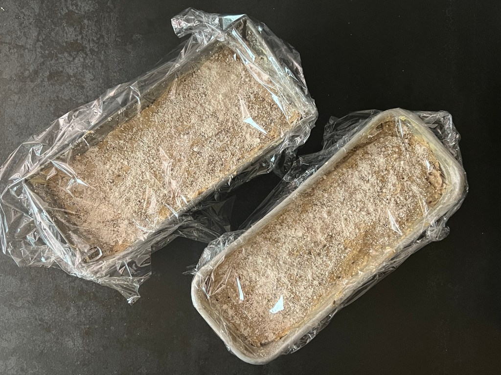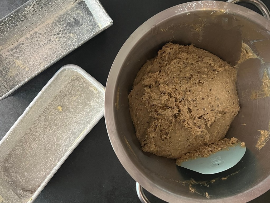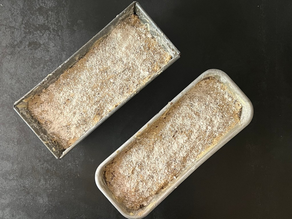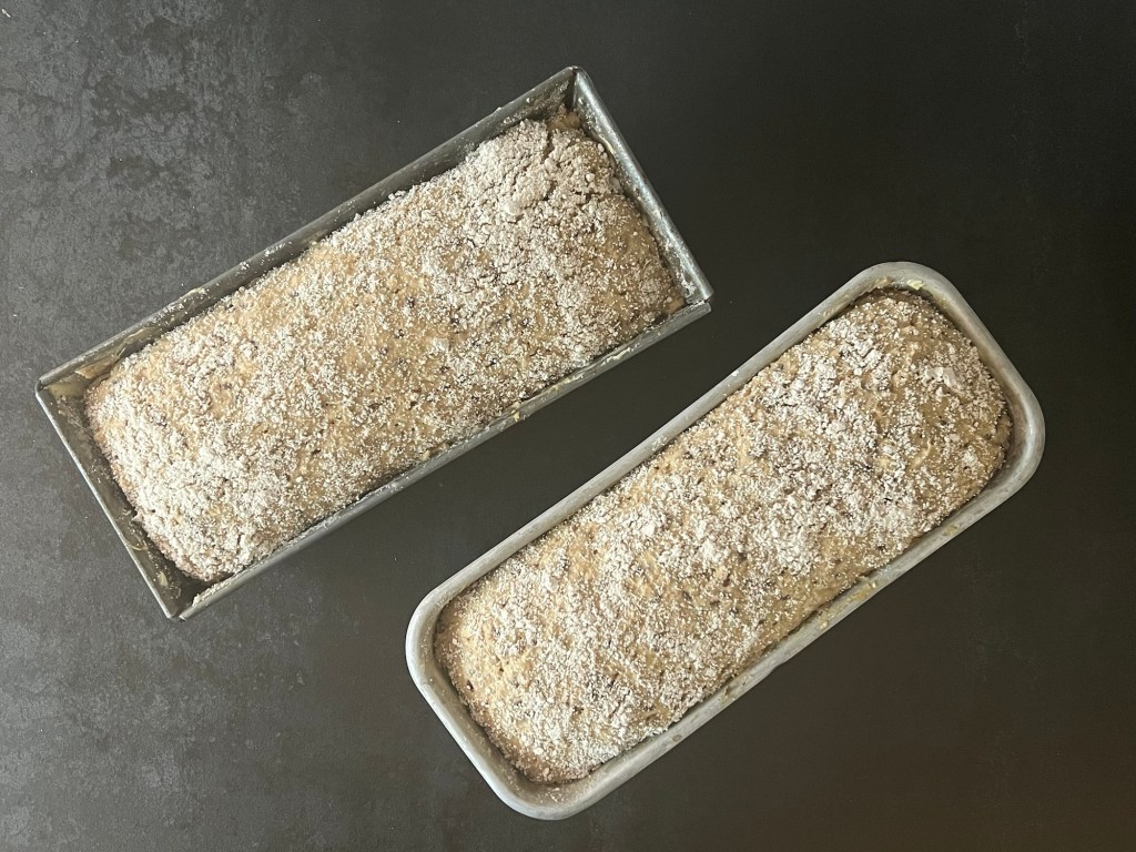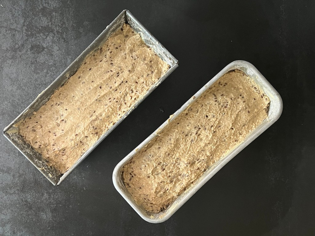 Medan degen blandas så smörjer och mjölar jag två formar. Jag använder havremjöl men det går lika bra med rismjöl. Fördelar degen i de två formarna, och med fuktiga händer så plattar jag ner degen i formen. Mjölar med havremjöl på toppen och plastar lätt, sen får de jäsa.
