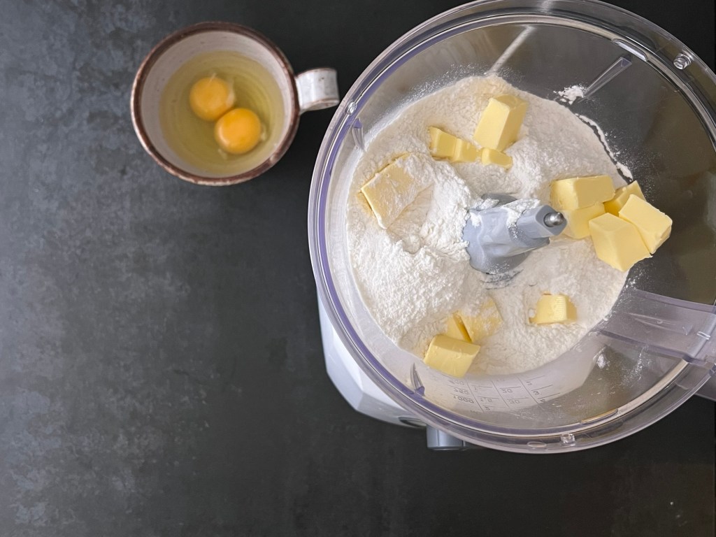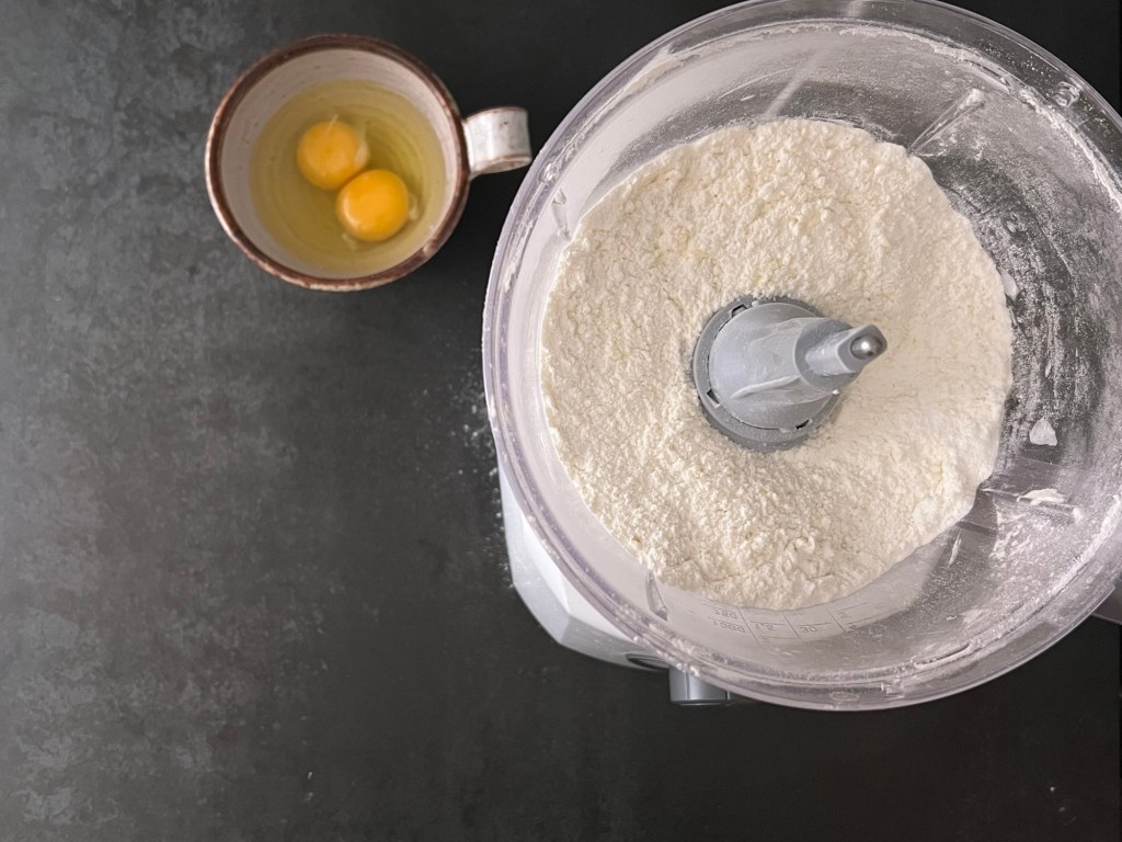 Först blandar jag alla torra ingredienser till en mjölmix, väger upp och tärnar smöret och väger upp äggen. Sen mixar jag mjölmixen med smöret i en matberedare. Lite kort så att de blir fingrynigt.