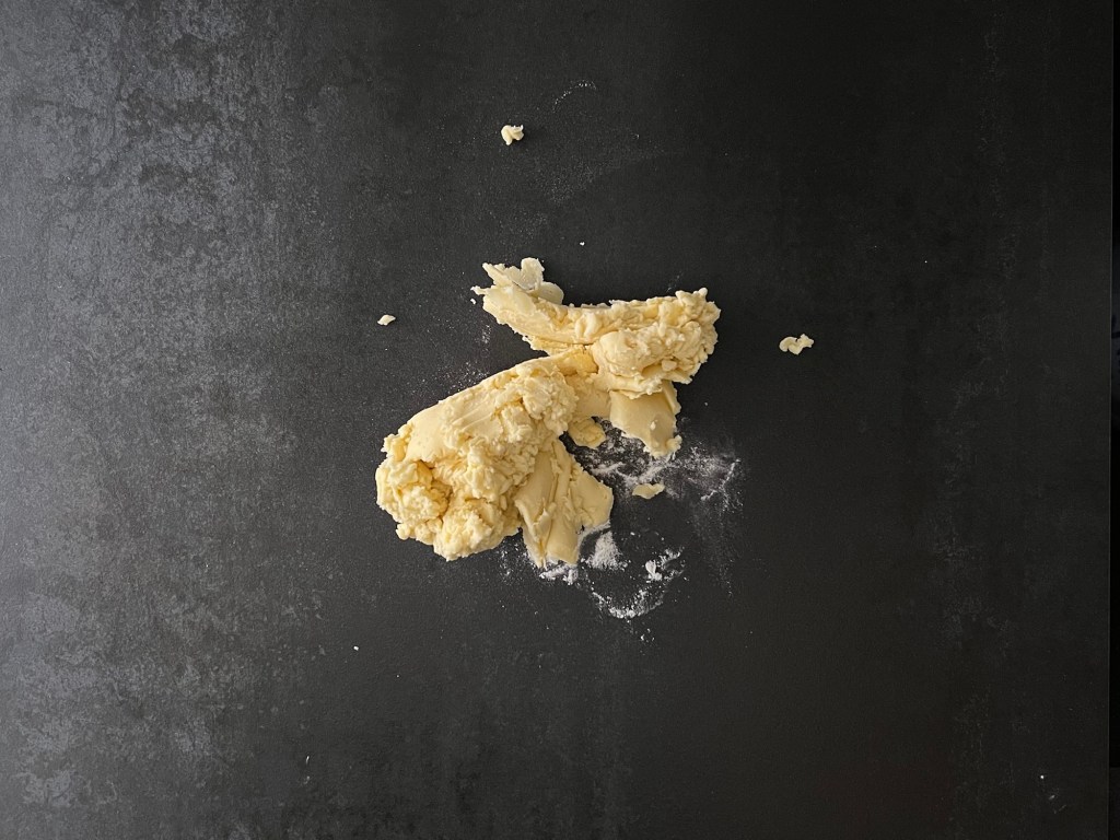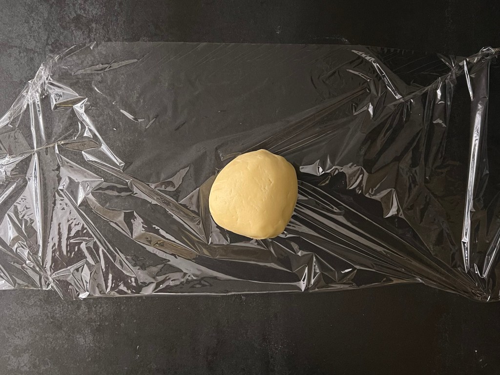 Efter det tillsätter jag äggen och mixar samman tills det blir en deg. Knådar klart degen på bänken, plastar och kyler den.