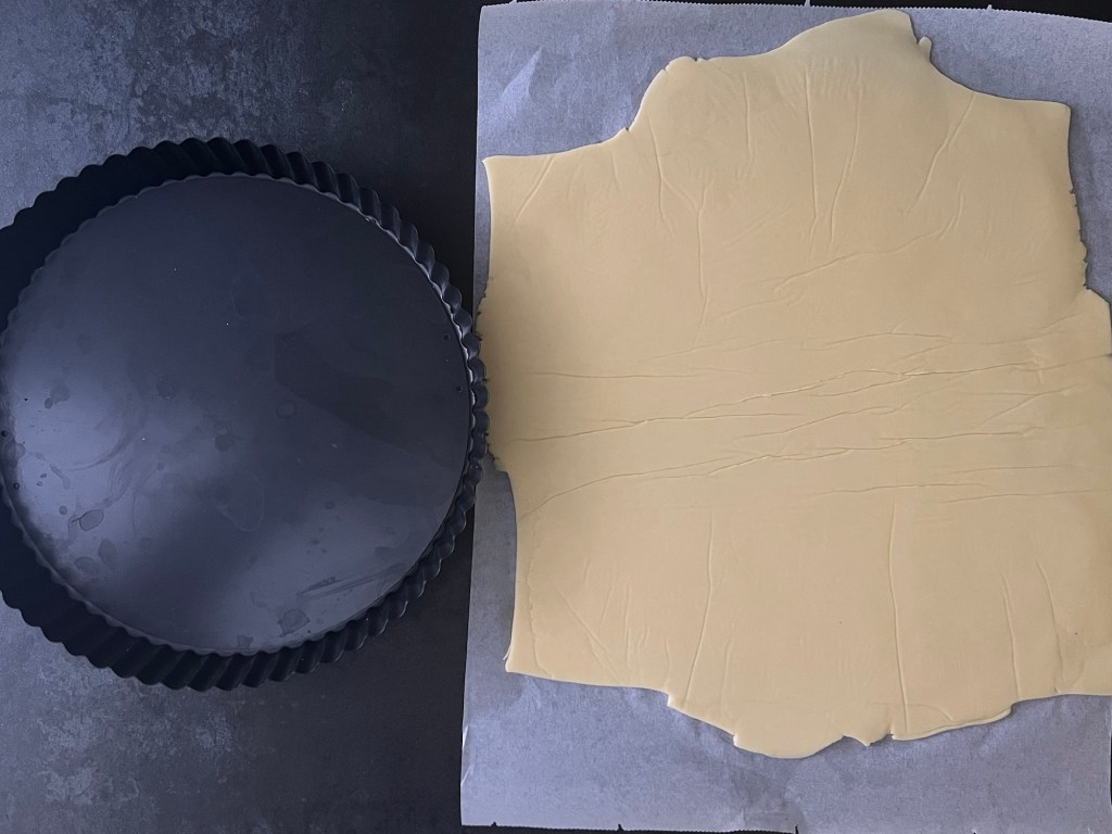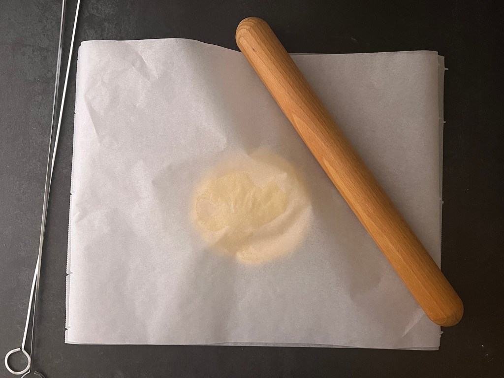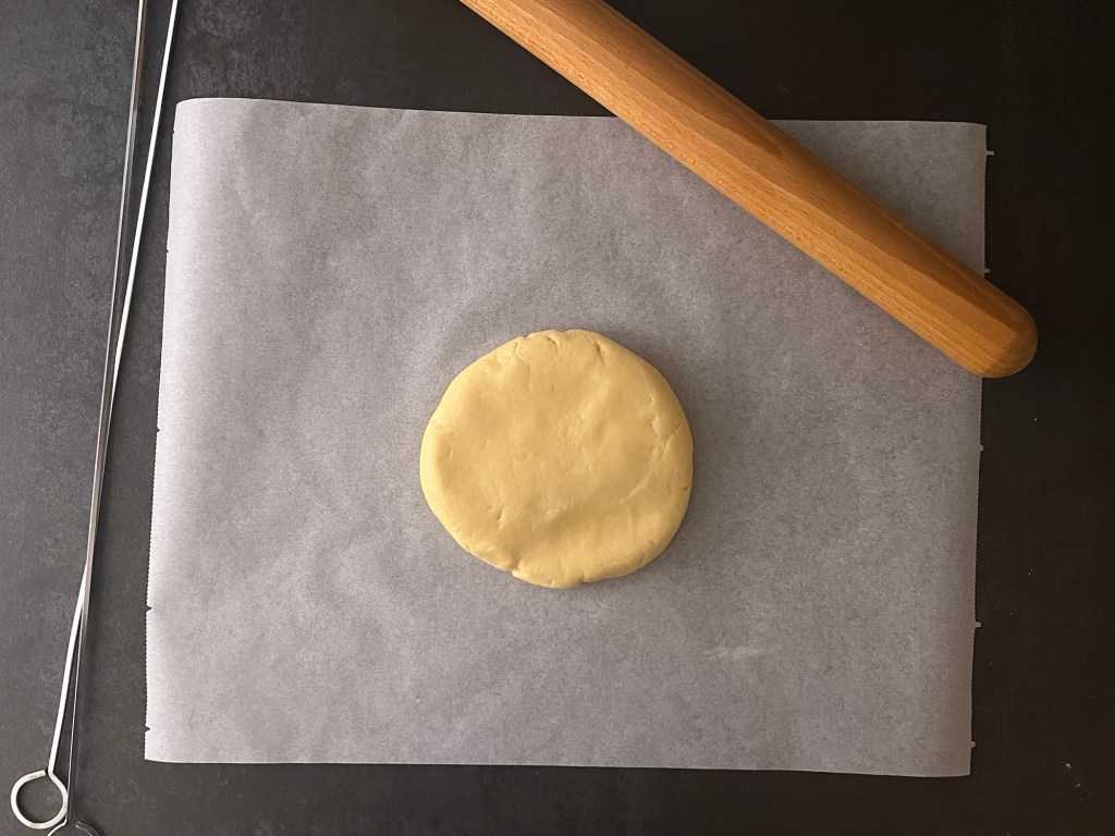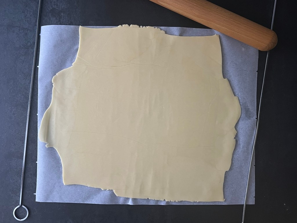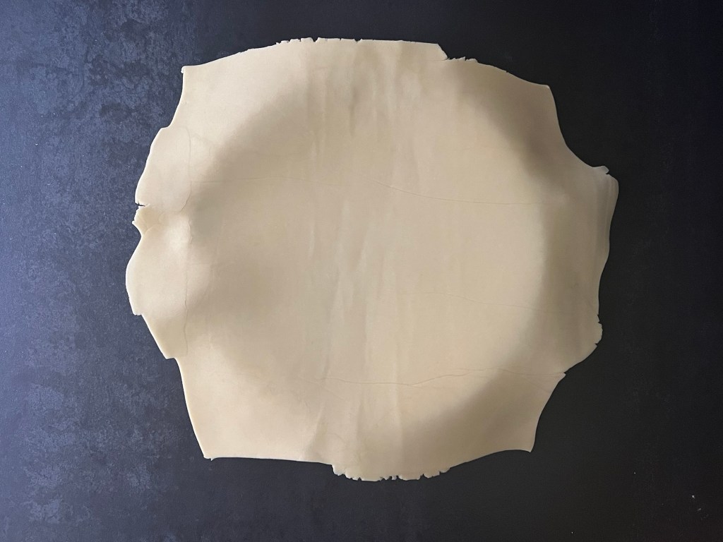 När den vilat i kylen så kavlar jag ut den mellan två bakplåtspapper, så att den blir jämntjock, ca 2mm. För att få den jämn i storlek så skär jag till de kanter som sticker iväg och lägger på de platser som behöver mer deg. När plattan klar så kyler/fryser jag den en kort stund, så att den blir lättare att hantera.