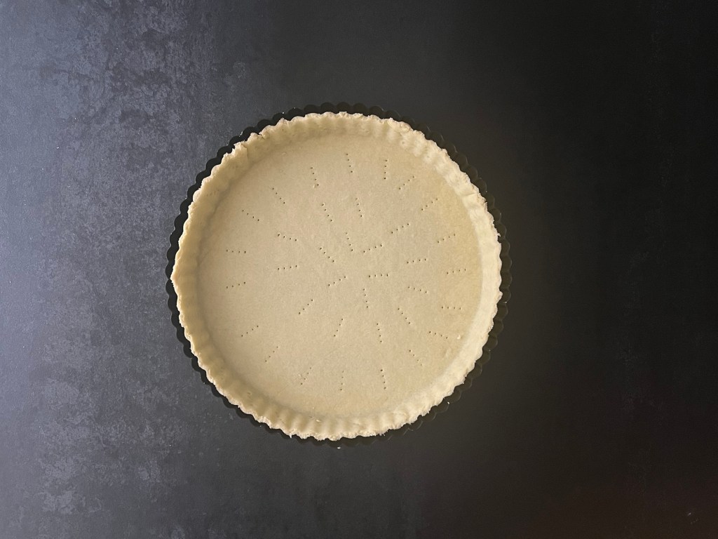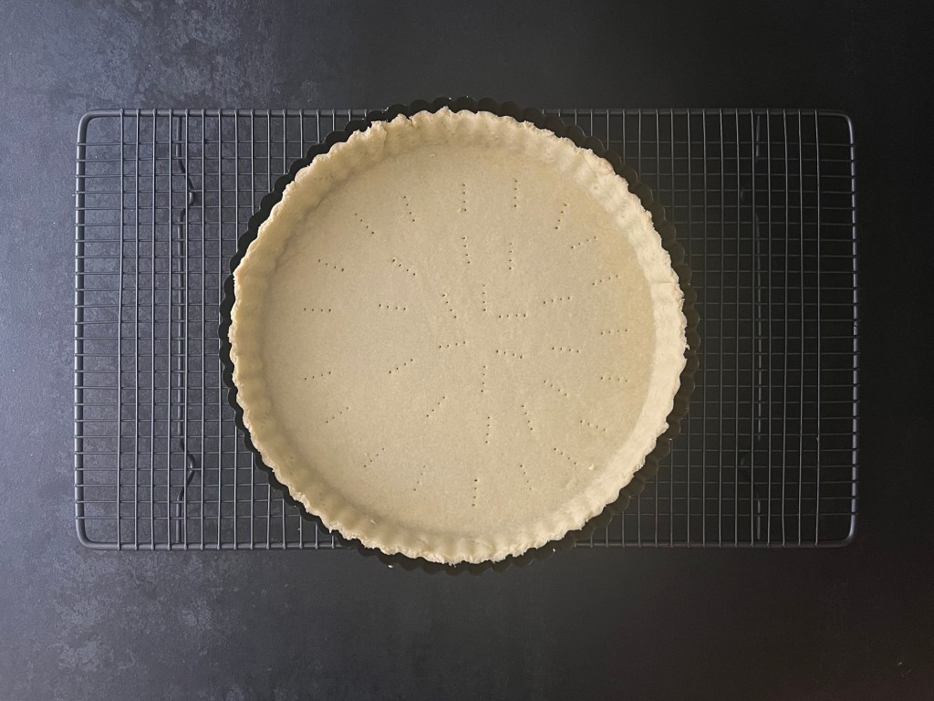 Sen tar jag ut den och klär en form med löstagbar botten, ca 26cm, med botten. Lyfter ned den och pressar ut i hörnen och mot kanten, så att alla eventuella luftbubblor försvinner. Naggar den i botten och runt kanten, fryser formen i ca 15min och bakar sedan av den i förvärmd ugn. Låter den svalna i formen på ett galler och fyller den sedan med något gott och bakar av den.