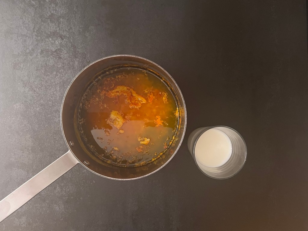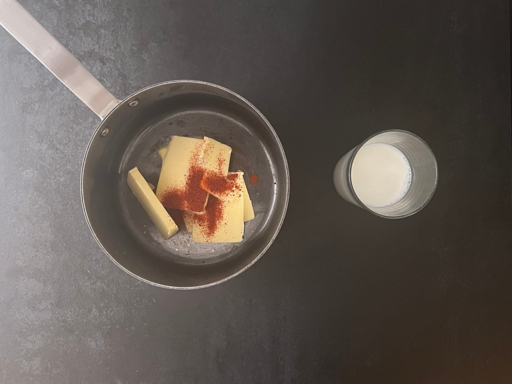 Jag börjar med att väga och smälta smöret, tillsammans med saffranen, när smöret smält tillsätter jag mjölk och sen tar jag av kastrullen från värmen och låter den vila och dra smak medan jag väger upp resten. Jag passar på att starta ugnen i detta steget, så att den är varm och redo.