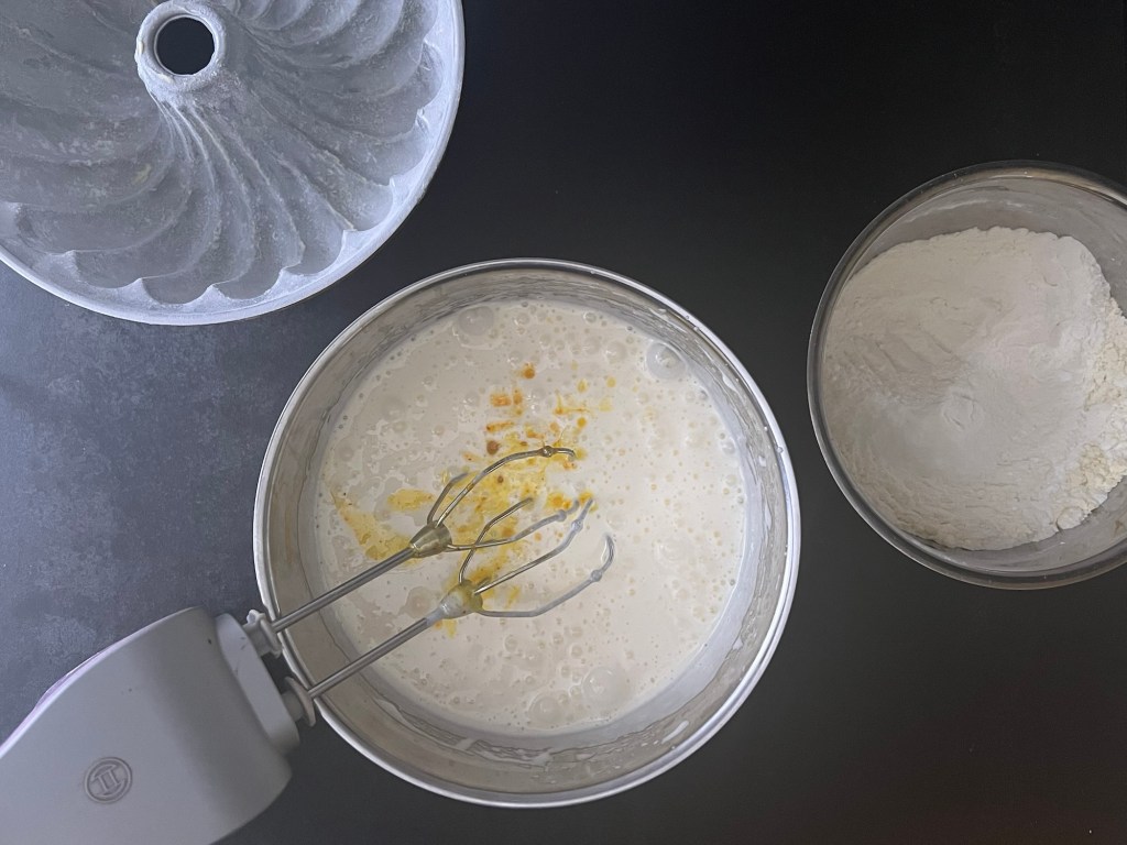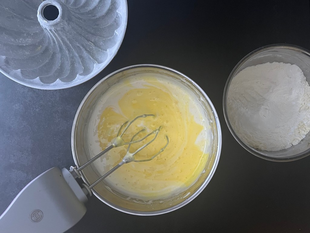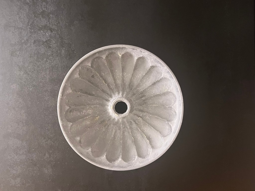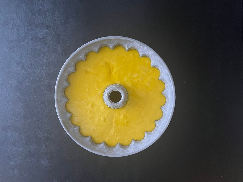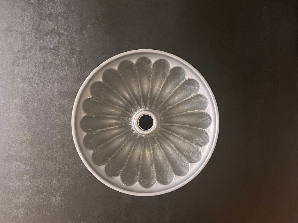Första steget efter det är att förbereda formen, jag använder mig helst av en snygg form från Nordic ware Scandinavia, men en vanlig i samma storlek går lika bra. Mitt bästa tips som jag snappat upp, för att smöra och bröa formen, är pensla med mjukt smör och sen strör jag rismjöl i formen och täcker upp allt smör, knackar som brukligt ut det överflödiga mjölet i vasken.