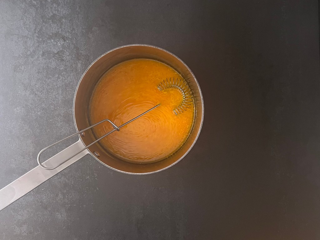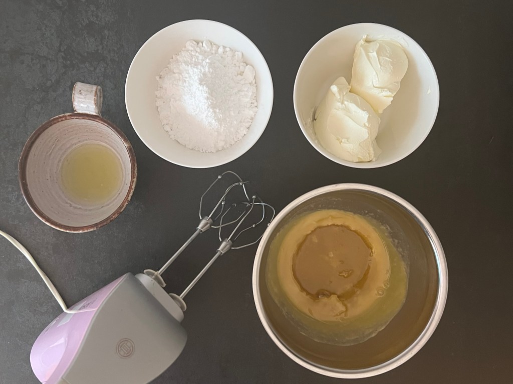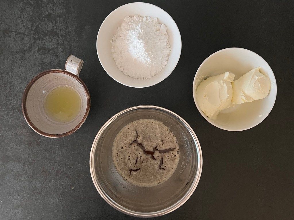 När kakan svalnar, eller när den står i ugnen, det väljer man bäst själv. Så bryner jag smöret till frostingen, det ska vara gyllene och nötig, inte för ljust för då får det inte rätt smak och inte för mörkt så att det blir bränt. När det är brynt häller jag över det i en metallbunke och sätter in i kylen eller frysen (håll koll på det) så att det får svalna och sätta sig. Det ska bli fasta och vispbart, inte hårt. Jag passar också på att väga upp citronsaft, florsocker och färskost. Färskosten plastar jag och sätter in i kylen tills den ska användas.