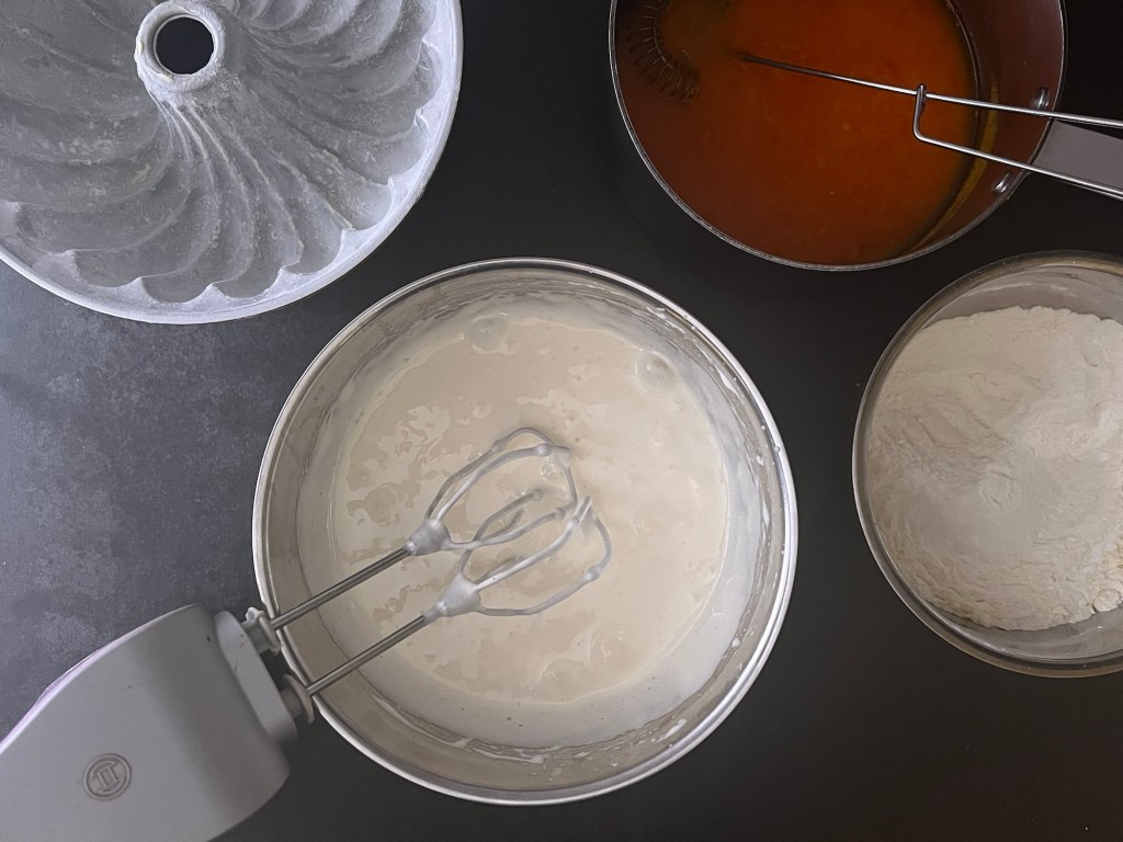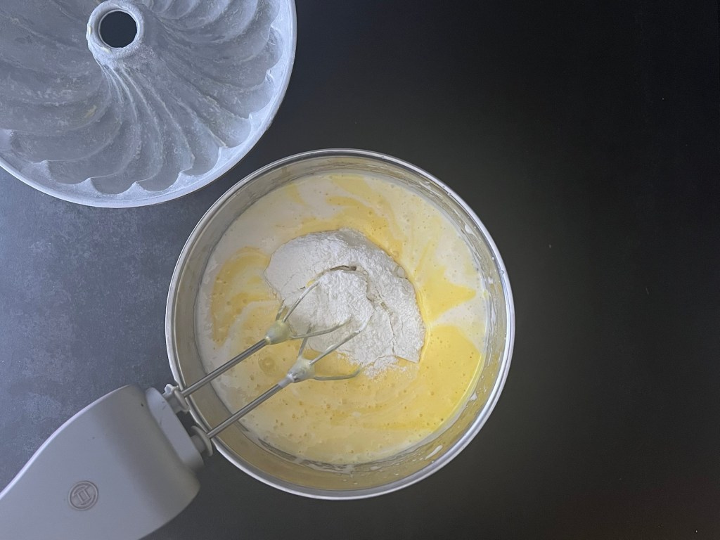 Sen väger jag upp övriga ingredienser, ägg och socker tillsammans och övriga torra i en egen skål, som jag blandar till en mjölmix. Jag vispar ägg och socker vitt och pösigt, sen vispar jag ned saffransvätskan på låg hastighet och sist vispar jag ned mjölmixen på låg hastighet. Rör runt i kanten med en slickepott så att allt verkligen blandats.