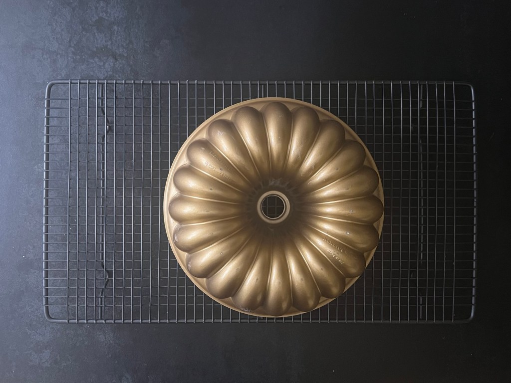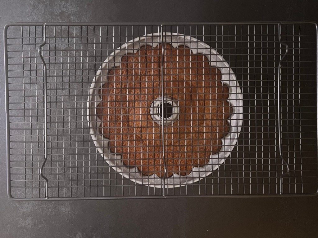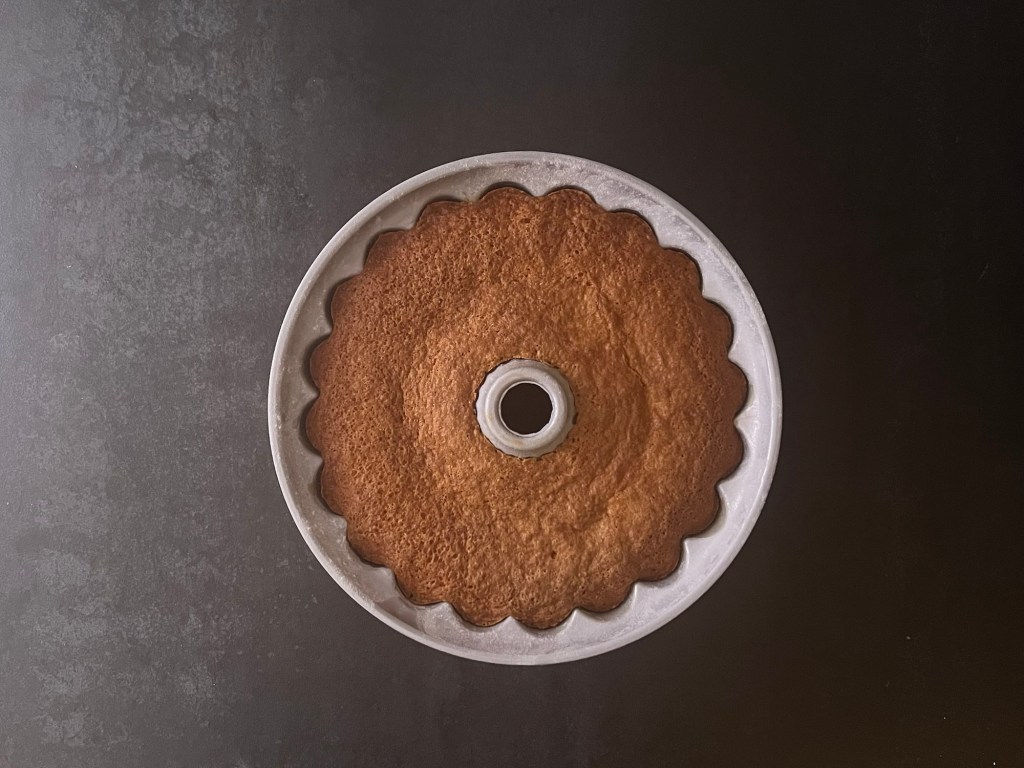 Jag häller smeten i formen och stoppar in den i förvärmd ugn. När den är klar kontrollerar jag med en provsticka så att den är torr. Sen tar jag ut den ur ugnen, låta den vila i formen i ca tio minuter, på ett galler. Lägger sedan ett galler ovanpå och vänder den upp och ned, lyfter av formen och låter den svalna på gallret.